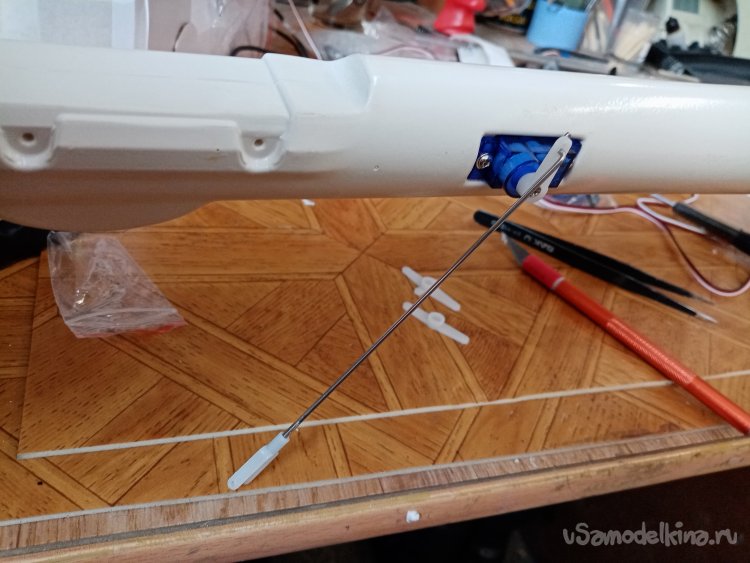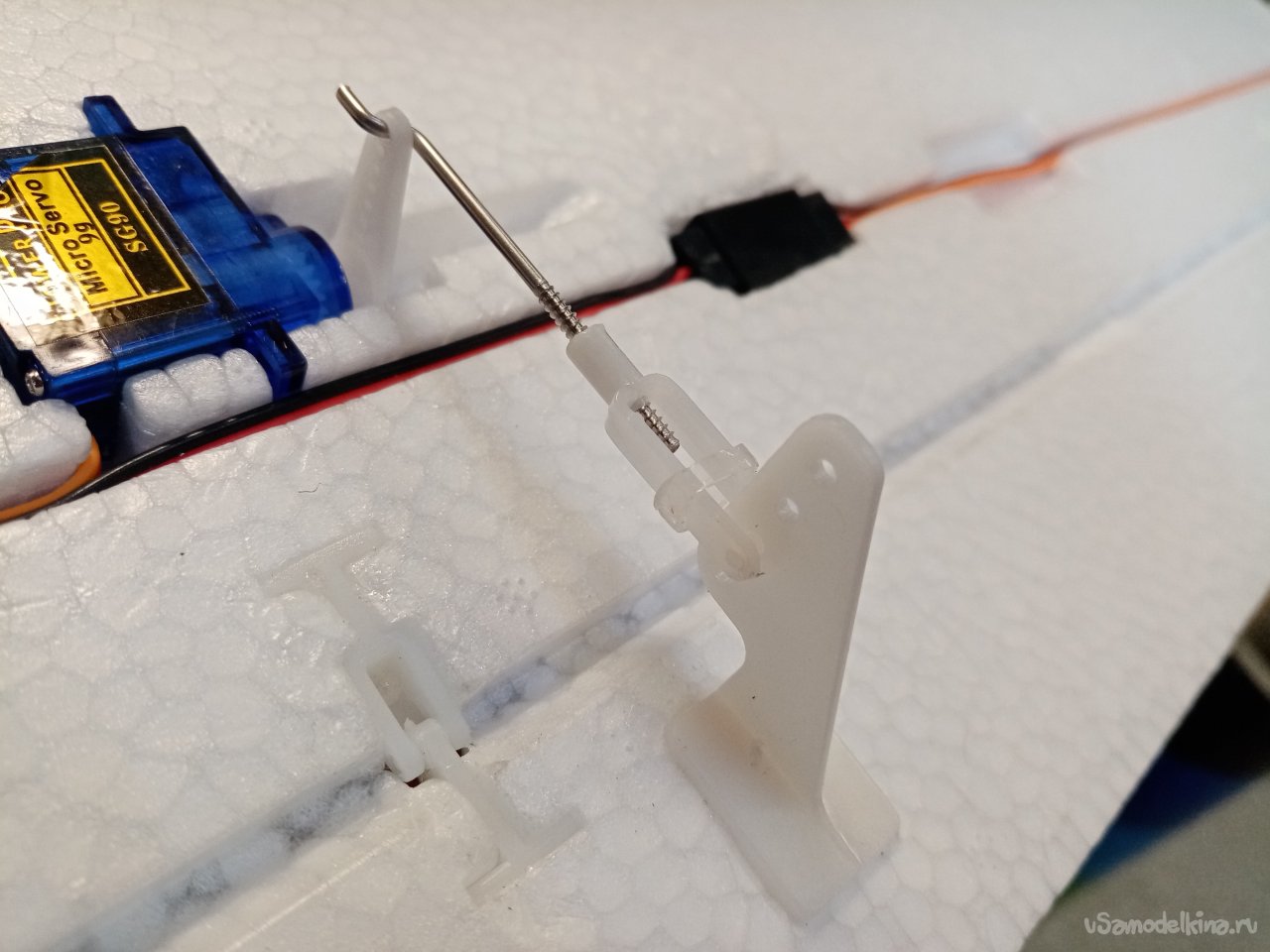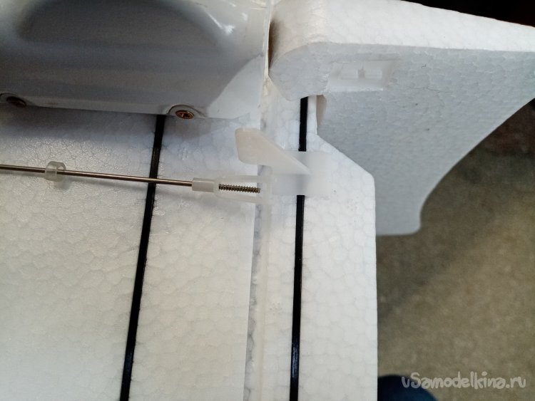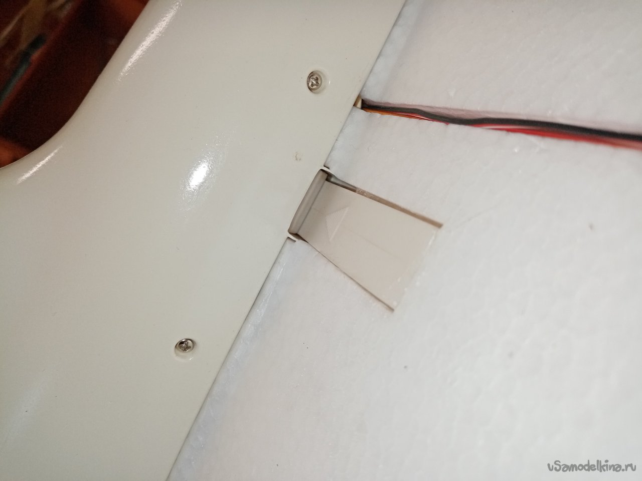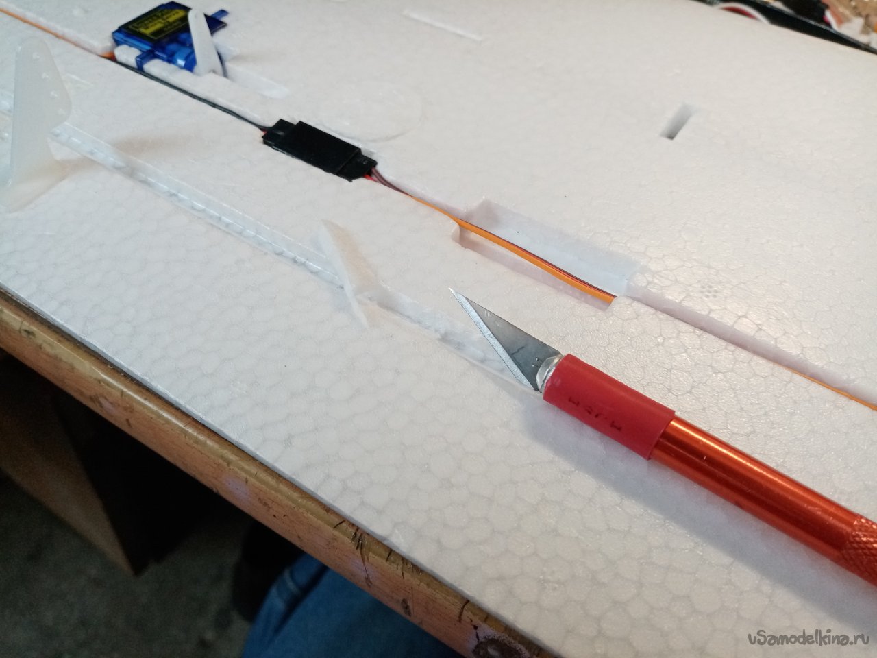 Флапероны на крыле зафиксированы, можно летать, без них. Мне такая ситуация не нужна. Эти элементы действуют при посадки как тормоза и планировании изменяют камбер крыла. Повышая подъемную силу. Поэтому отрезаю перемычки при помощи треугольного ножа для творчества. Сервоприводы установлены, закрепляю тяги на кабанчики. Дополнительная фиксация соединения тяги при помощи эластичных колечек.