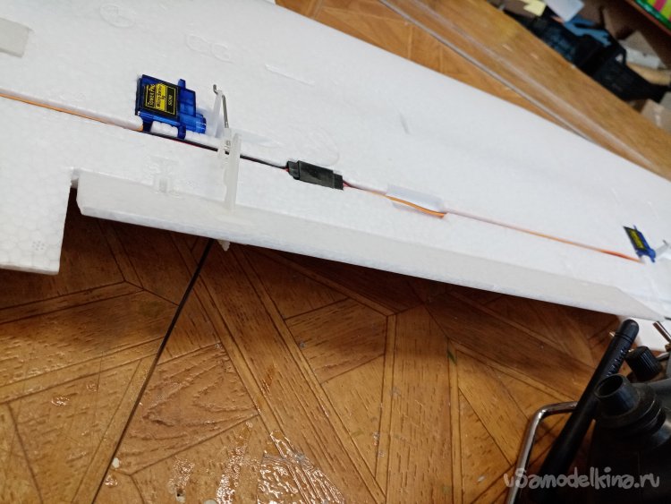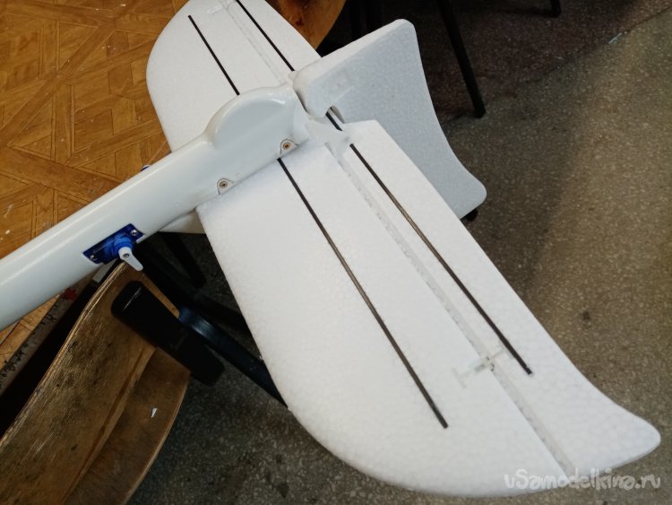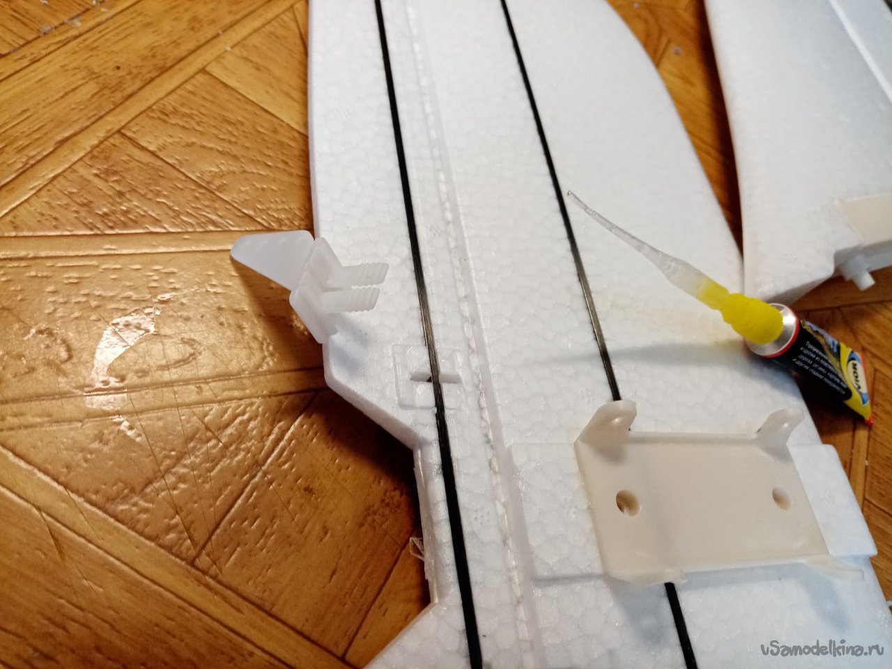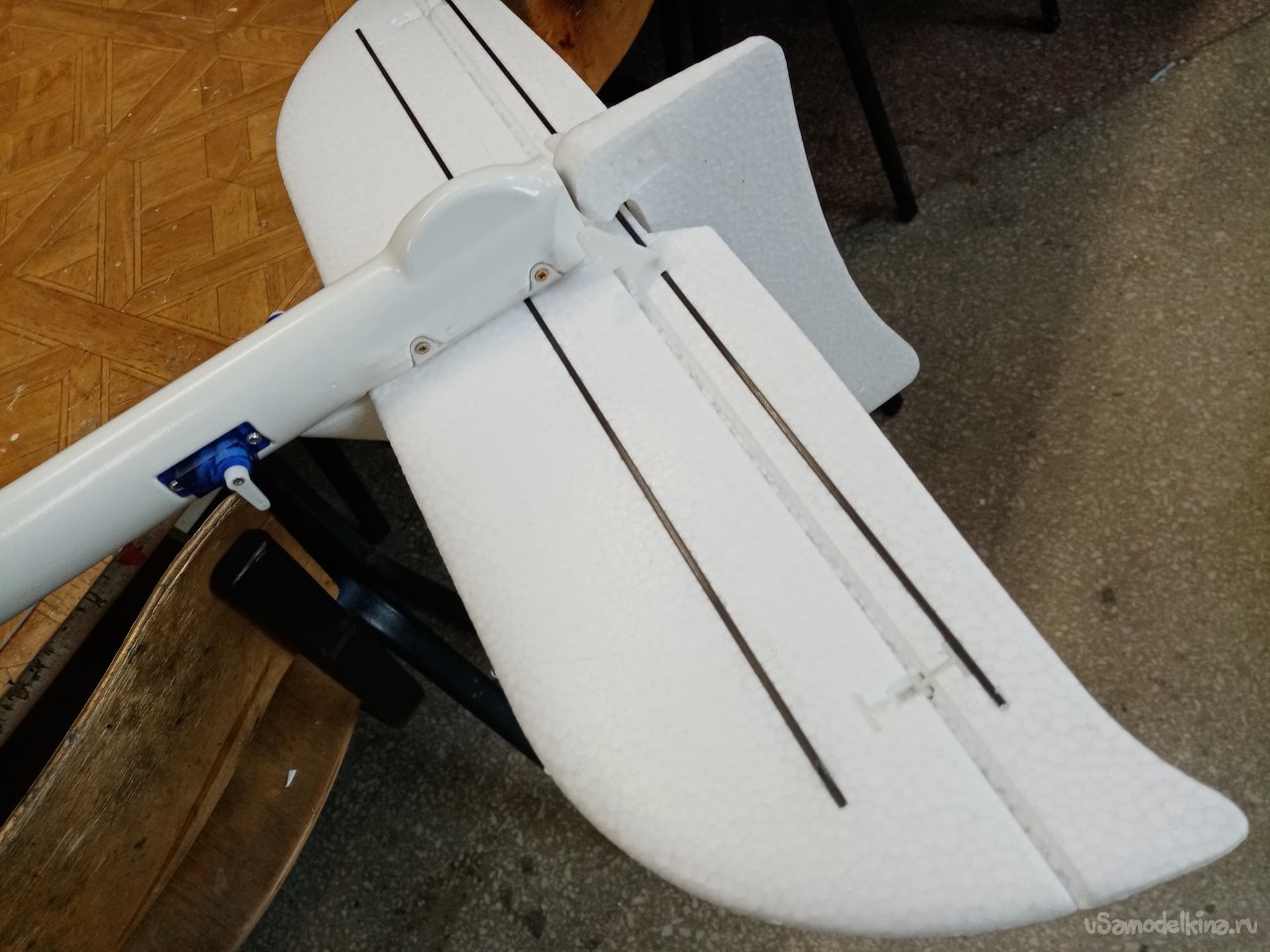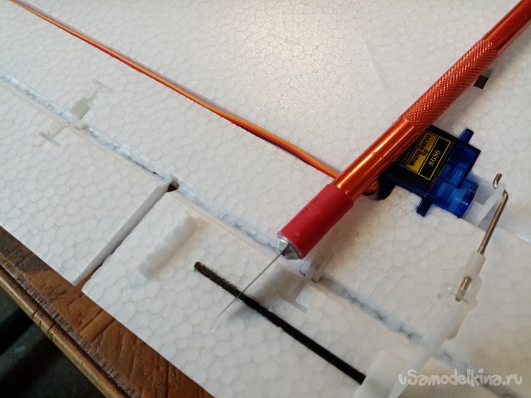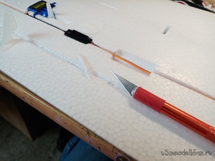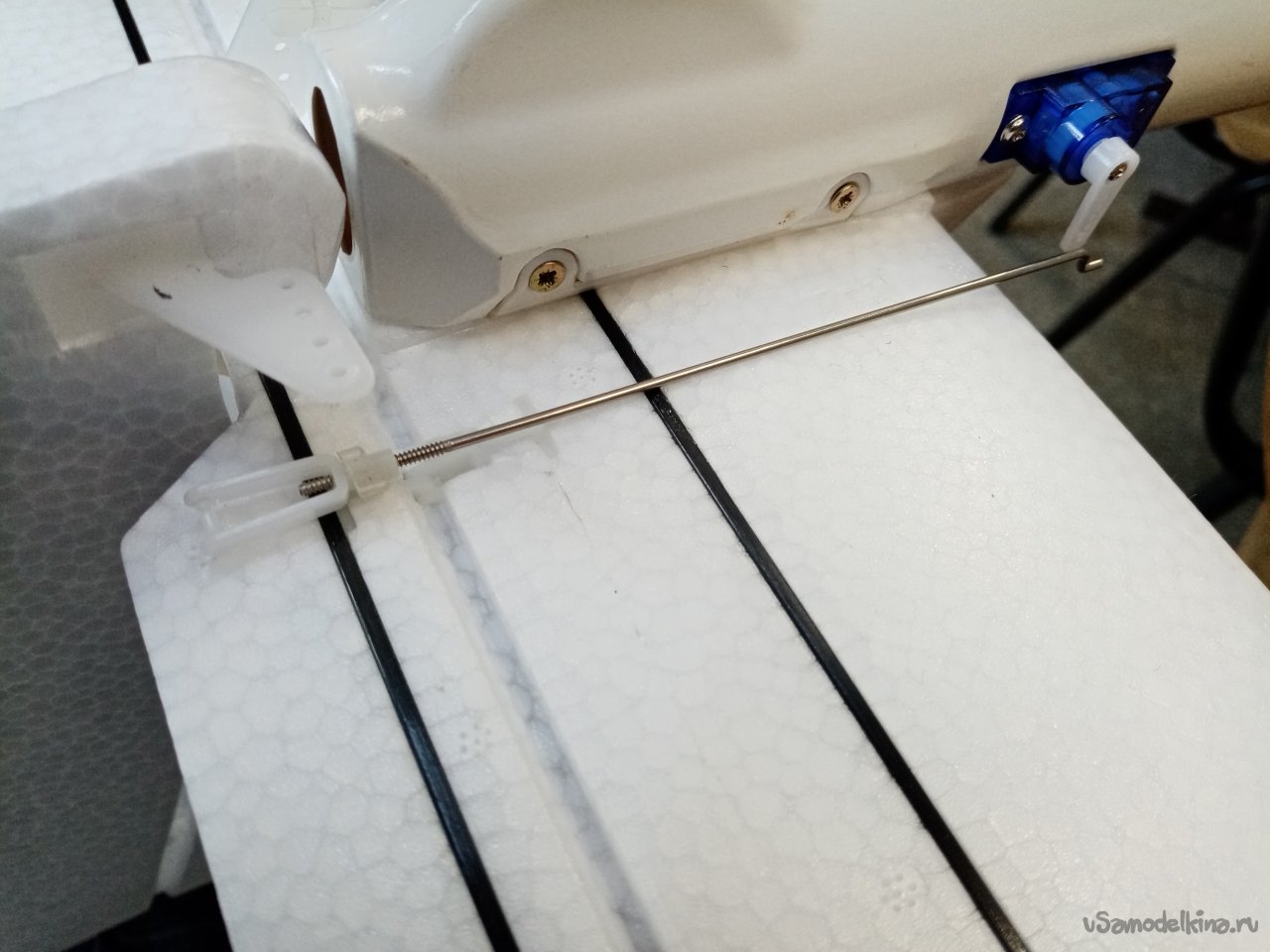 Флапероны на крыле зафиксированы, можно летать, без них. Мне такая ситуация не нужна. Эти элементы действуют при посадки как тормоза и планировании изменяют камбер крыла. Повышая подъемную силу. Поэтому отрезаю перемычки при помощи треугольного ножа для творчества. Сервоприводы установлены, закрепляю тяги на кабанчики. Дополнительная фиксация соединения тяги при помощи эластичных колечек.