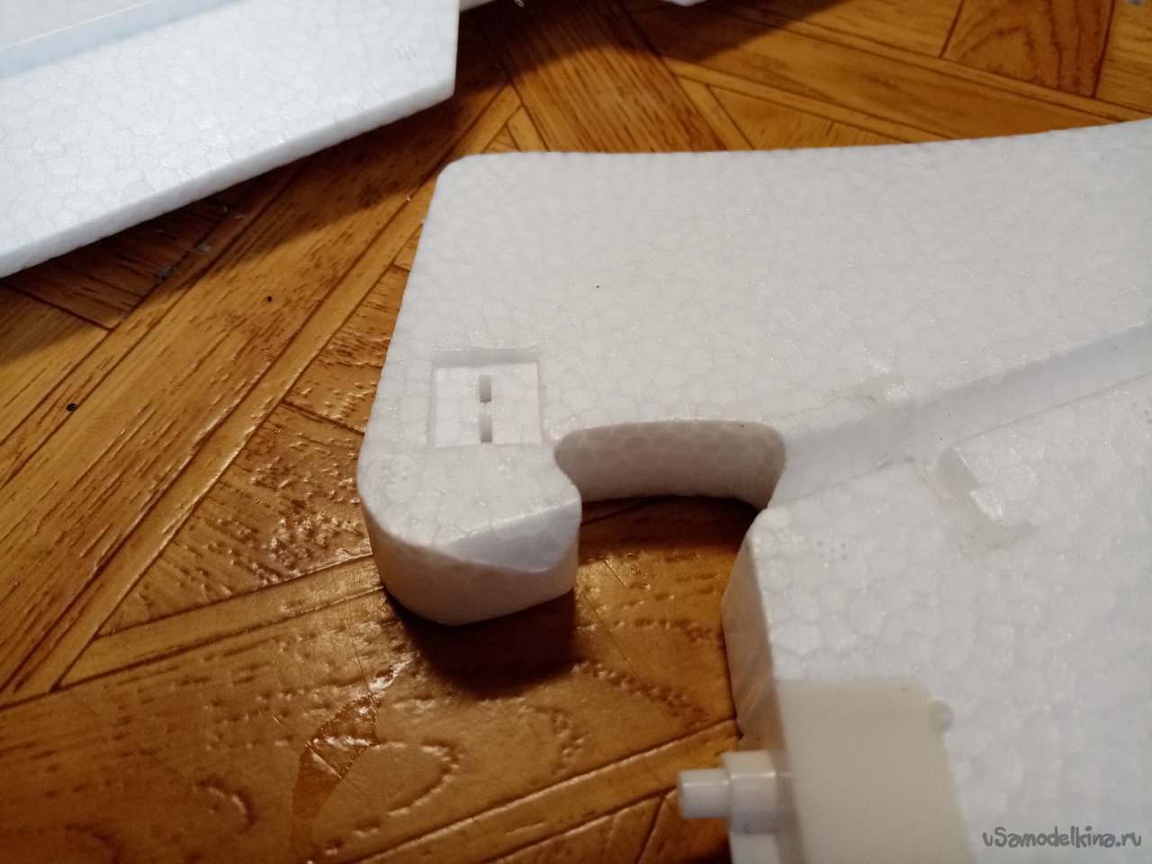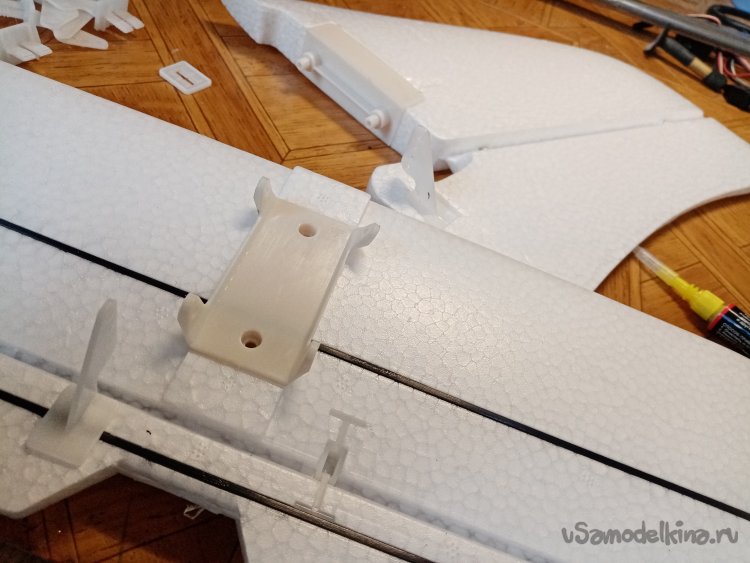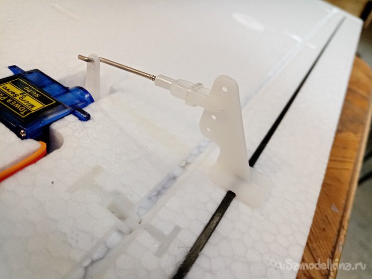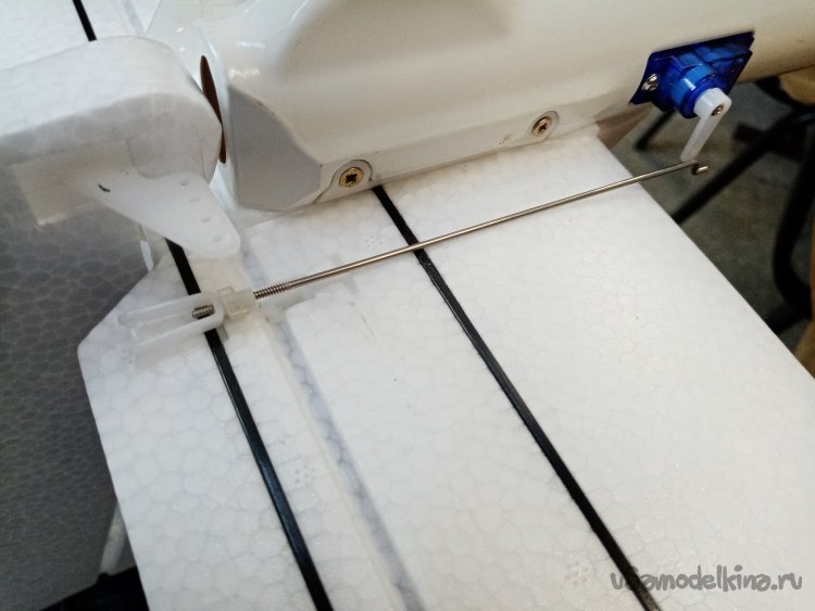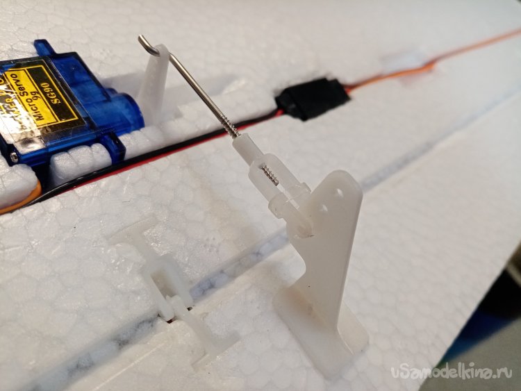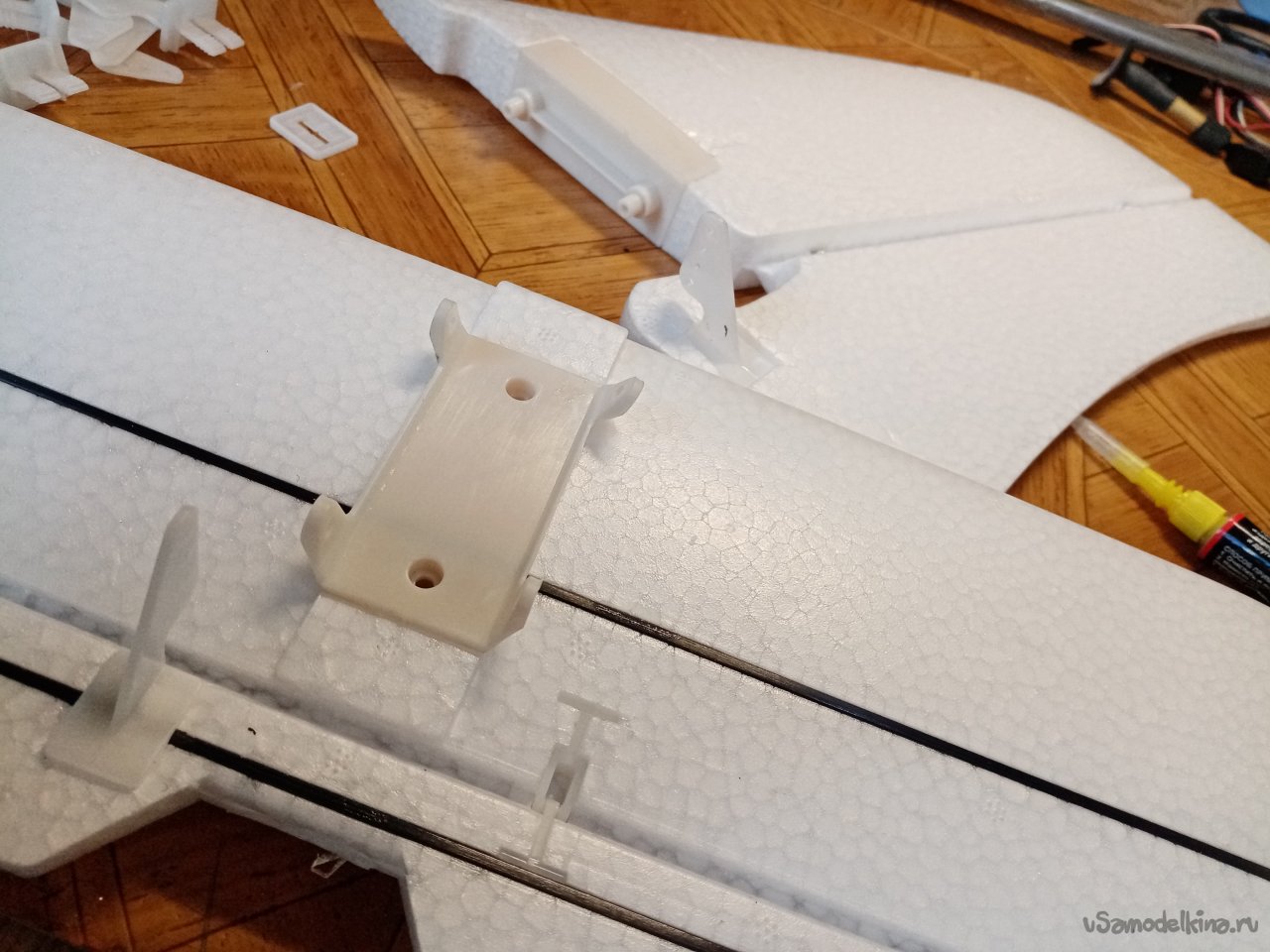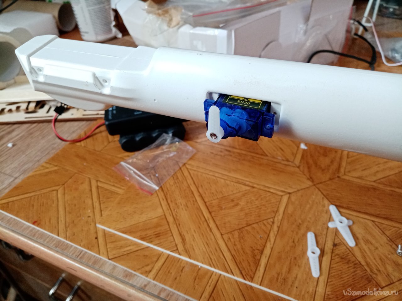 Флапероны на крыле зафиксированы, можно летать, без них. Мне такая ситуация не нужна. Эти элементы действуют при посадки как тормоза и планировании изменяют камбер крыла. Повышая подъемную силу. Поэтому отрезаю перемычки при помощи треугольного ножа для творчества. Сервоприводы установлены, закрепляю тяги на кабанчики. Дополнительная фиксация соединения тяги при помощи эластичных колечек.