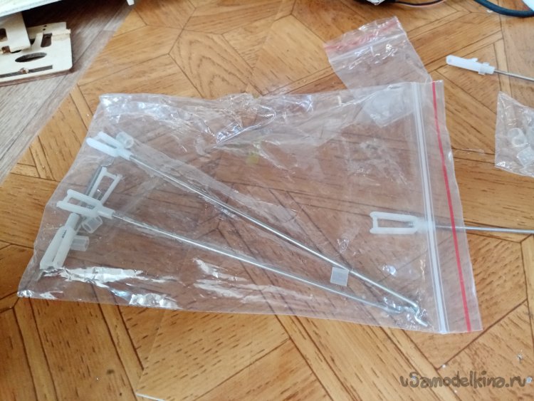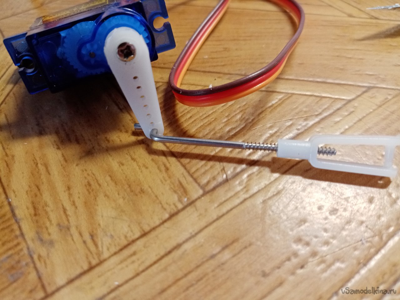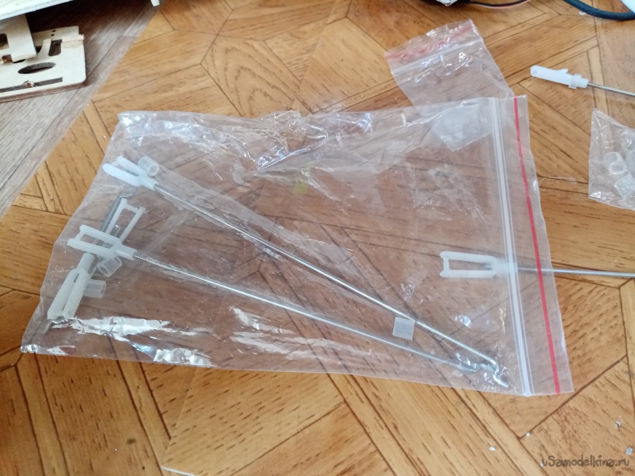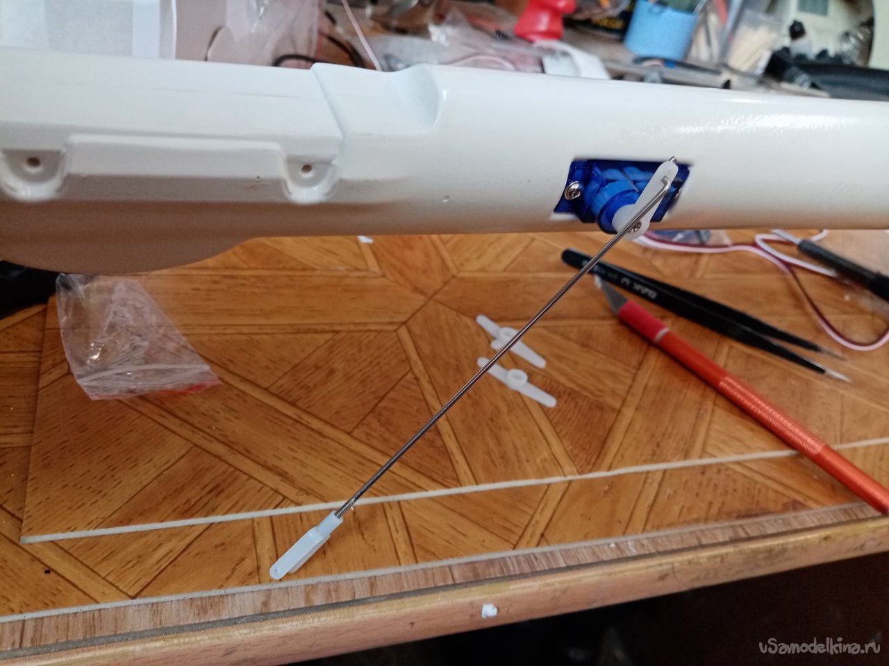 Завершение сборки уже не за горами. Нужно соединить тяги сервоприводов с кабанчиками, зафиксировать защелки, подогнать длину тяг. Провести провода внутри фюзеляжа к приемнику и начать настройки системы. Начинаю с хвостового оперения. Немного откусываю слишком длинные тяги закрепляю по местам. Проверяю работу системы при помощи сервотестера.