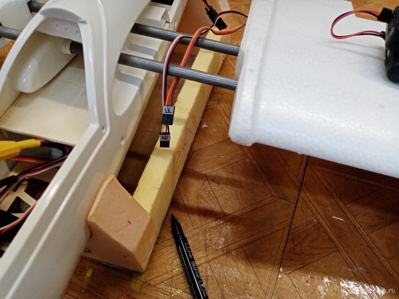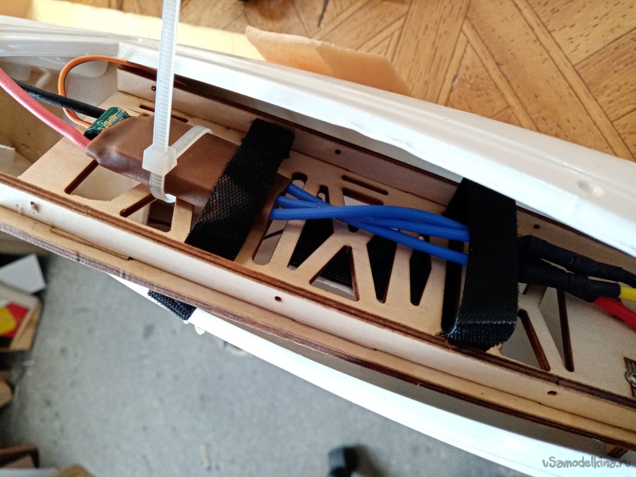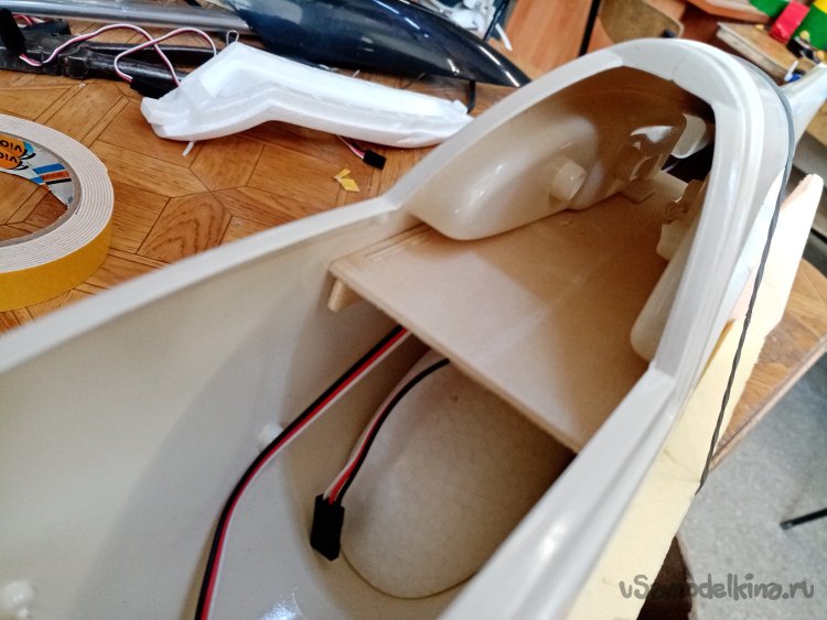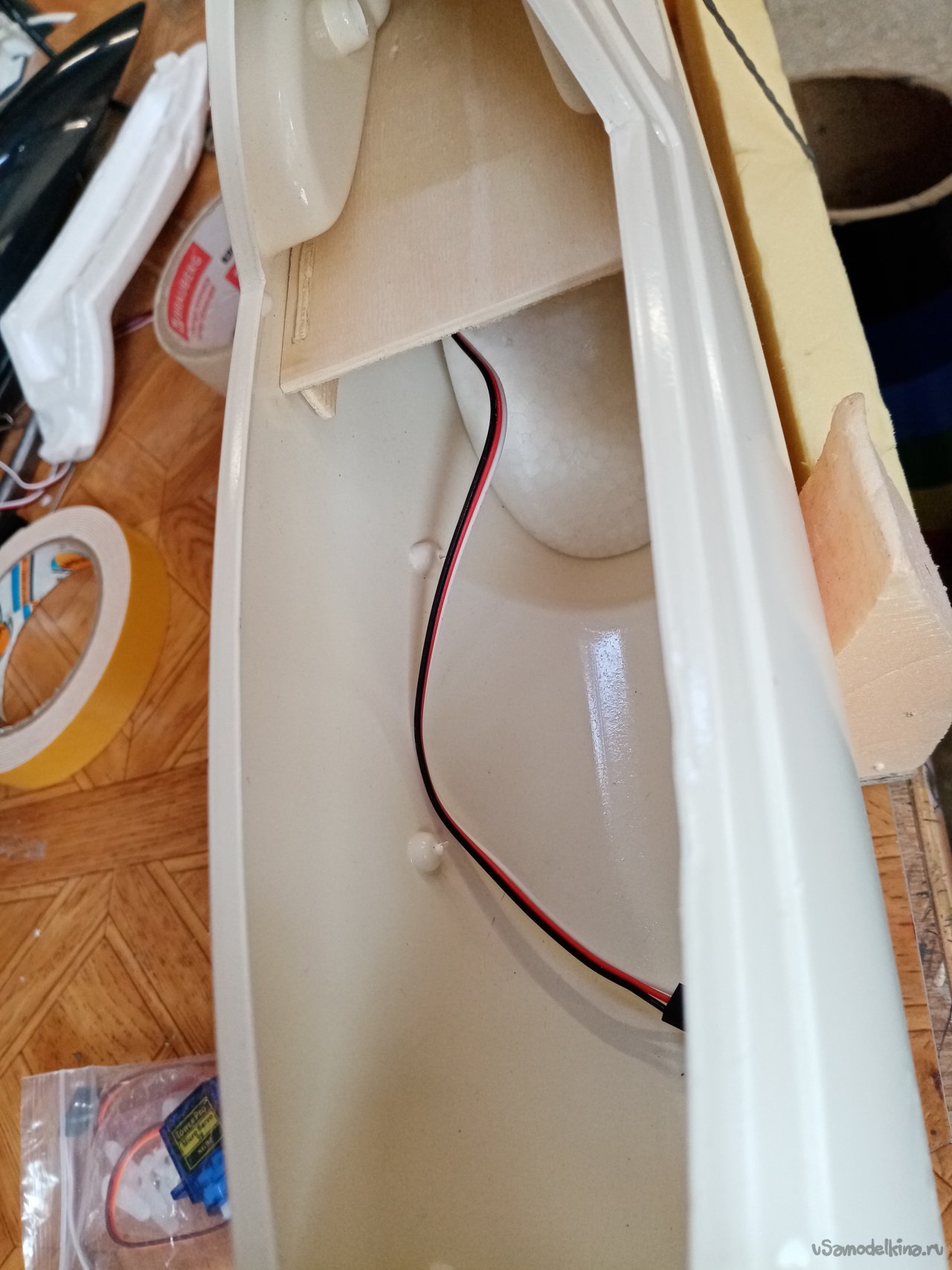 В хвостовую часть фюзеляжа протаскиваю провода удлинителей на сервоприводы управления рулем высоты и рулем направления. Заранее проверяю все соединения и сервоприводы сервотетсером. Фиксирую при помощи полосок малярного скотча.