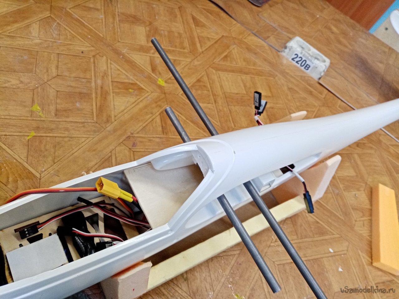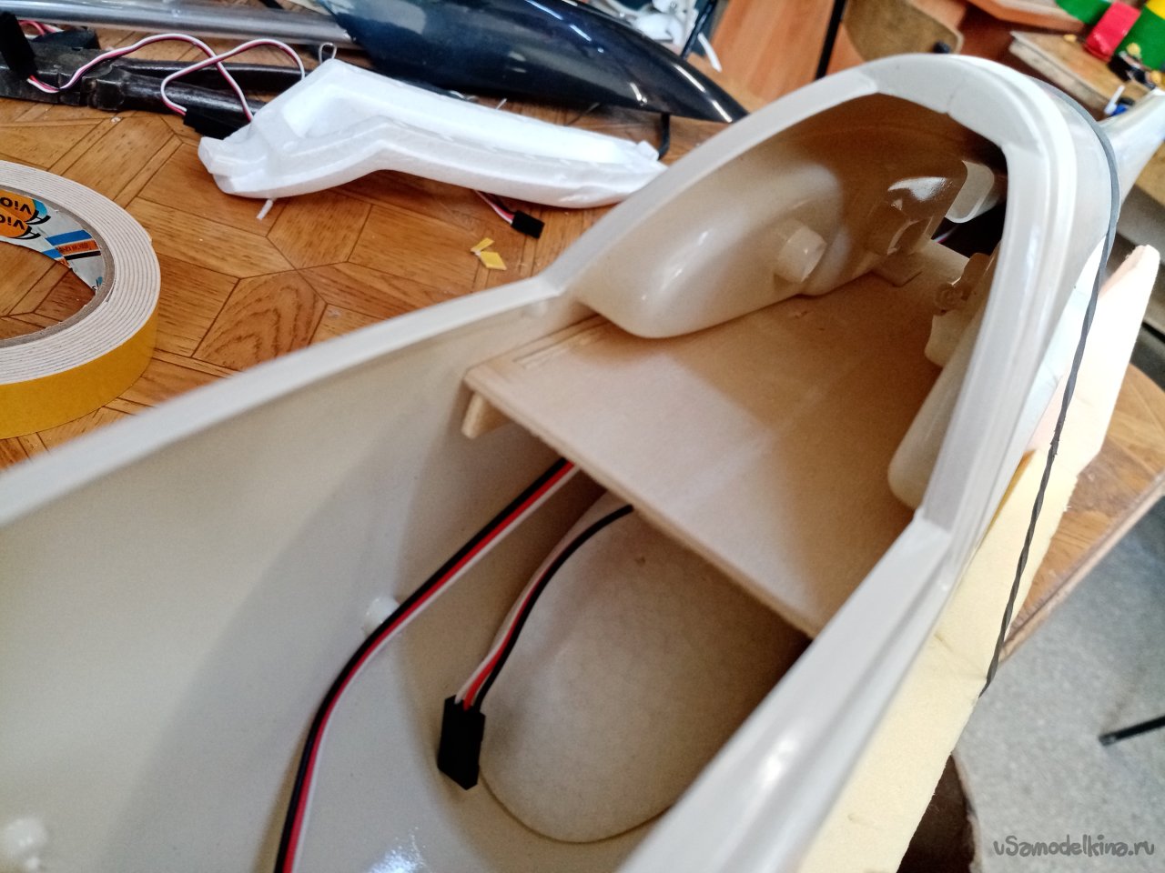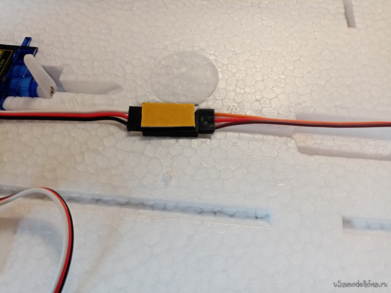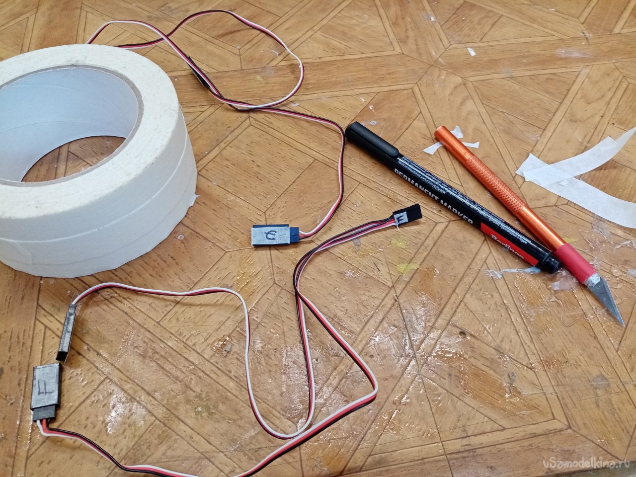 В хвостовую часть фюзеляжа протаскиваю провода удлинителей на сервоприводы управления рулем высоты и рулем направления. Заранее проверяю все соединения и сервоприводы сервотетсером. Фиксирую при помощи полосок малярного скотча.