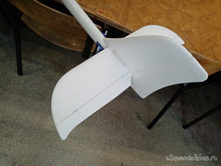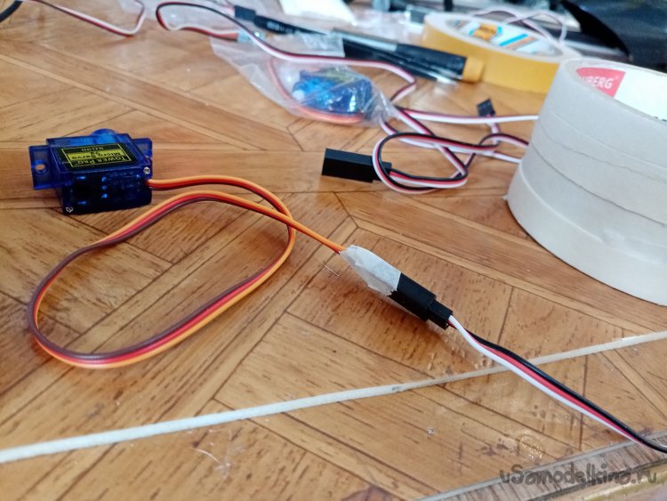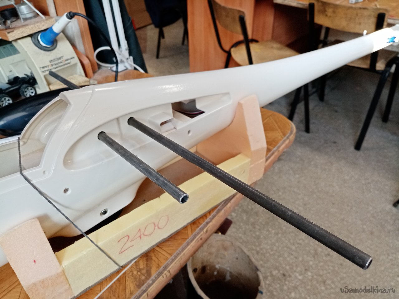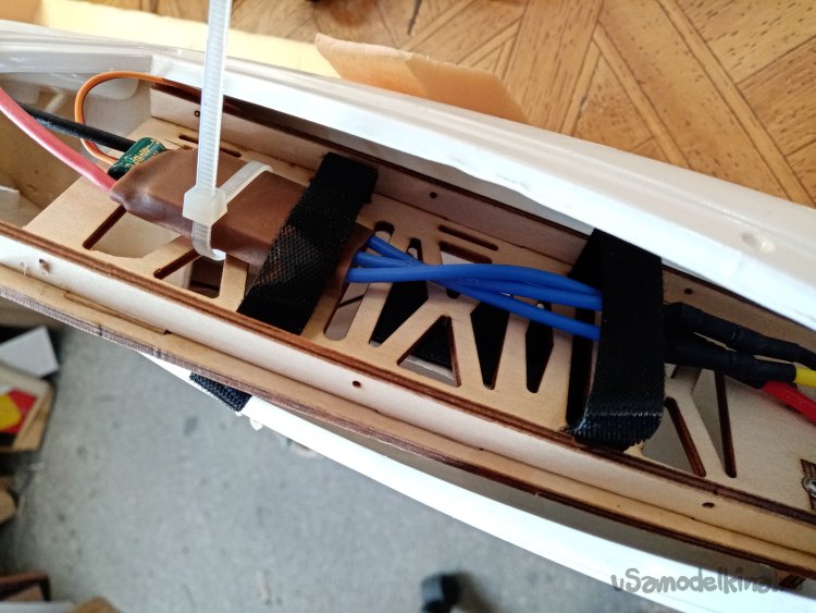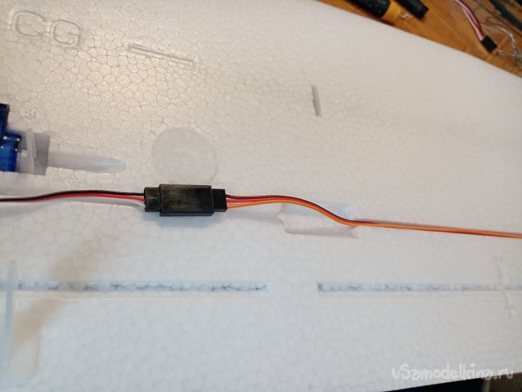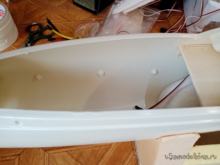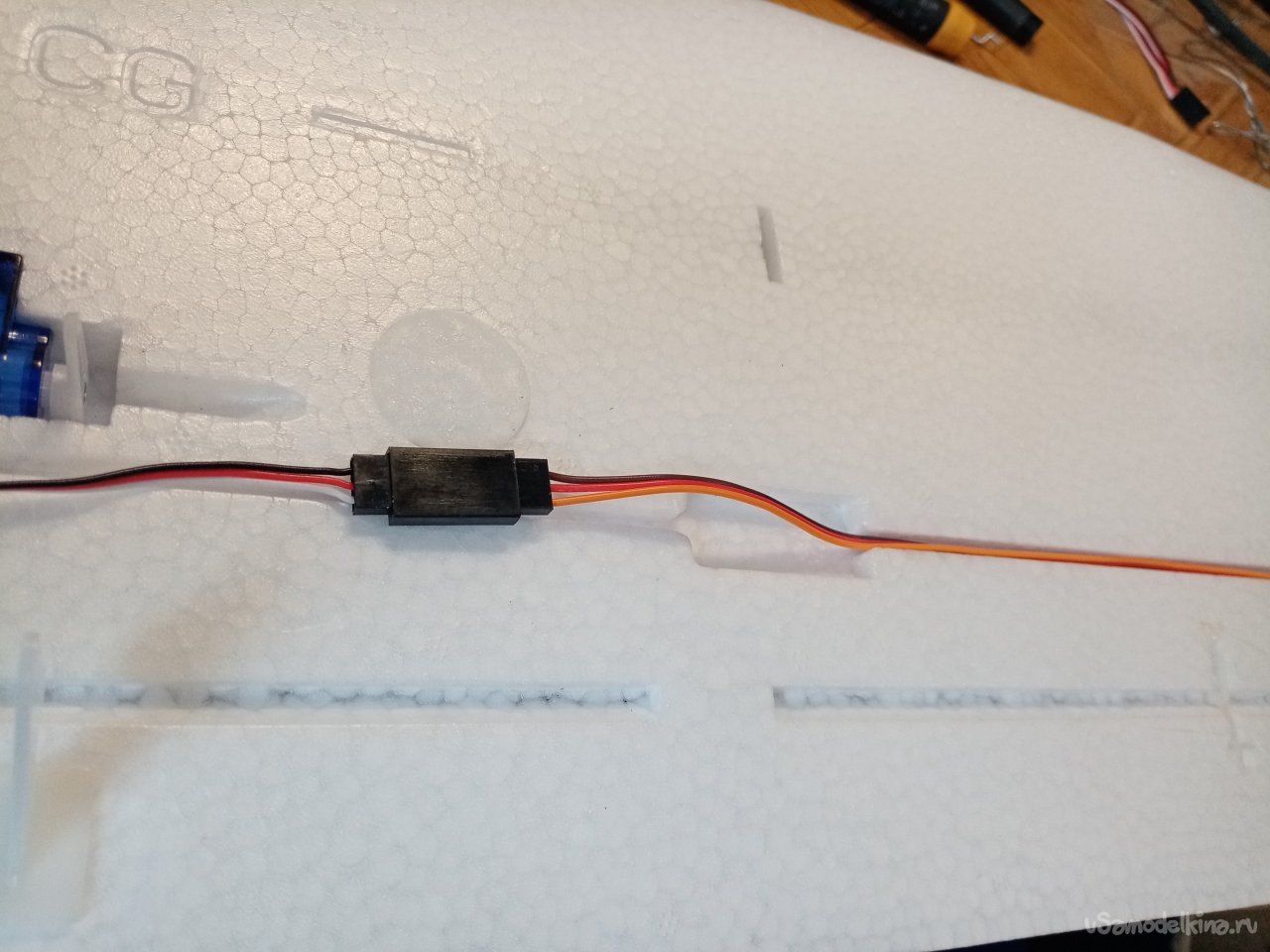 В хвостовую часть фюзеляжа протаскиваю провода удлинителей на сервоприводы управления рулем высоты и рулем направления. Заранее проверяю все соединения и сервоприводы сервотетсером. Фиксирую при помощи полосок малярного скотча.