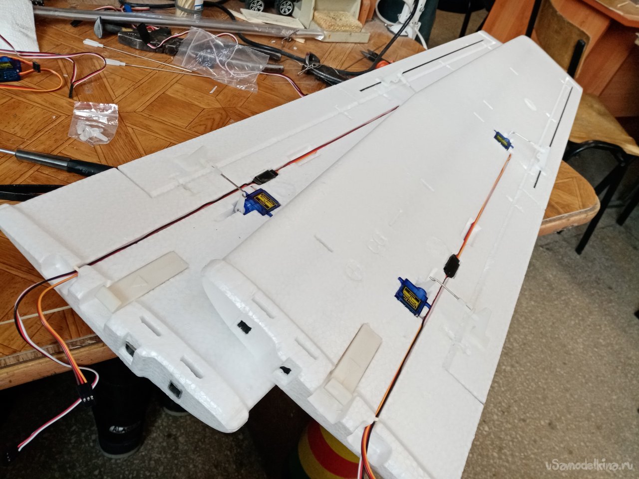 Проверяю еще раз как работают сервоприводы на крыльях. Соединяю всю систему в кучу и можно начинать настройку. Крылья не обязательно собирать. Только провода управления. Регулятор тоже не обязательно напрягать подаю питание от отдельной батареи прямо в приемник.
