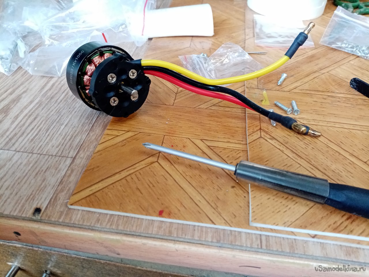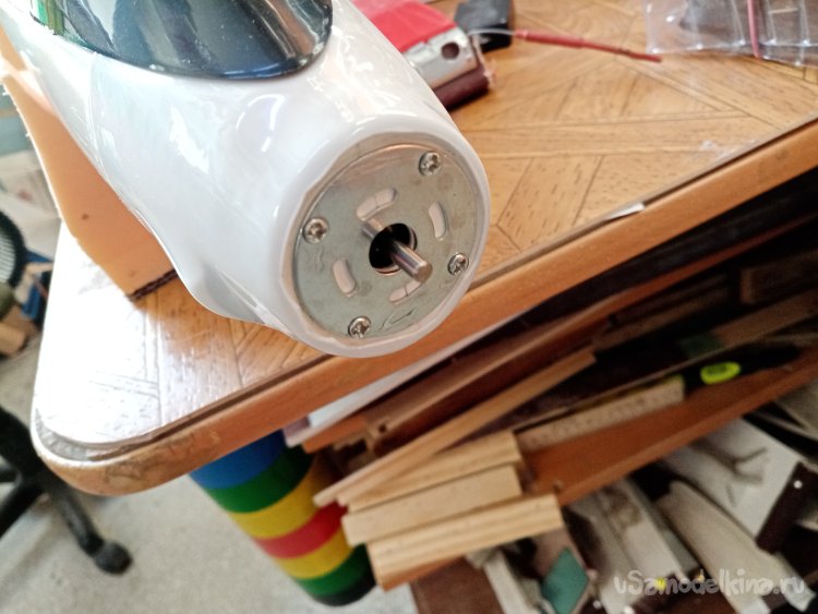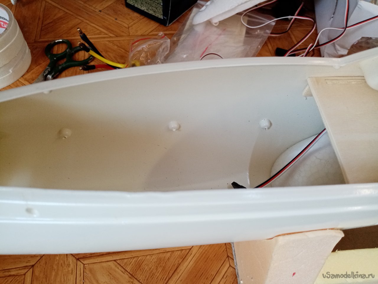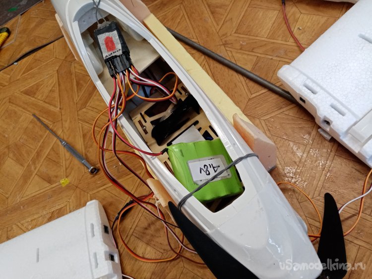Окончательно закрепляю переднюю площадку в носовой части планера. Соединяю регулятор к мотору и проверяю работу. Все в норме. Работаем взад. Снимаю переднюю площадку. Закрепляю регулятор внизу на корпусе, сверху опять устанавливаю площадку. Теперь все как нужно. Регулятор не мешает размещению аккумуляторной батареи и оборудования.