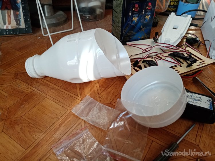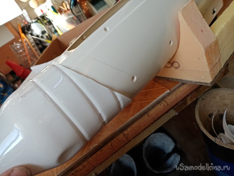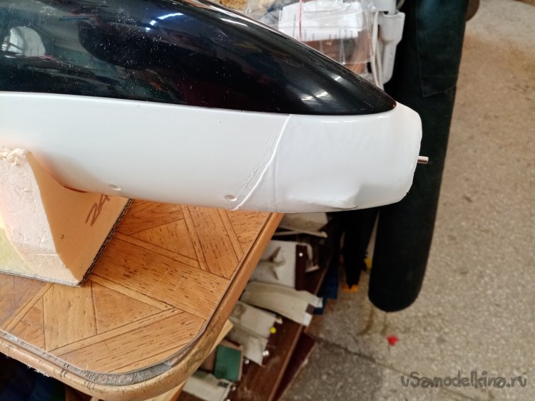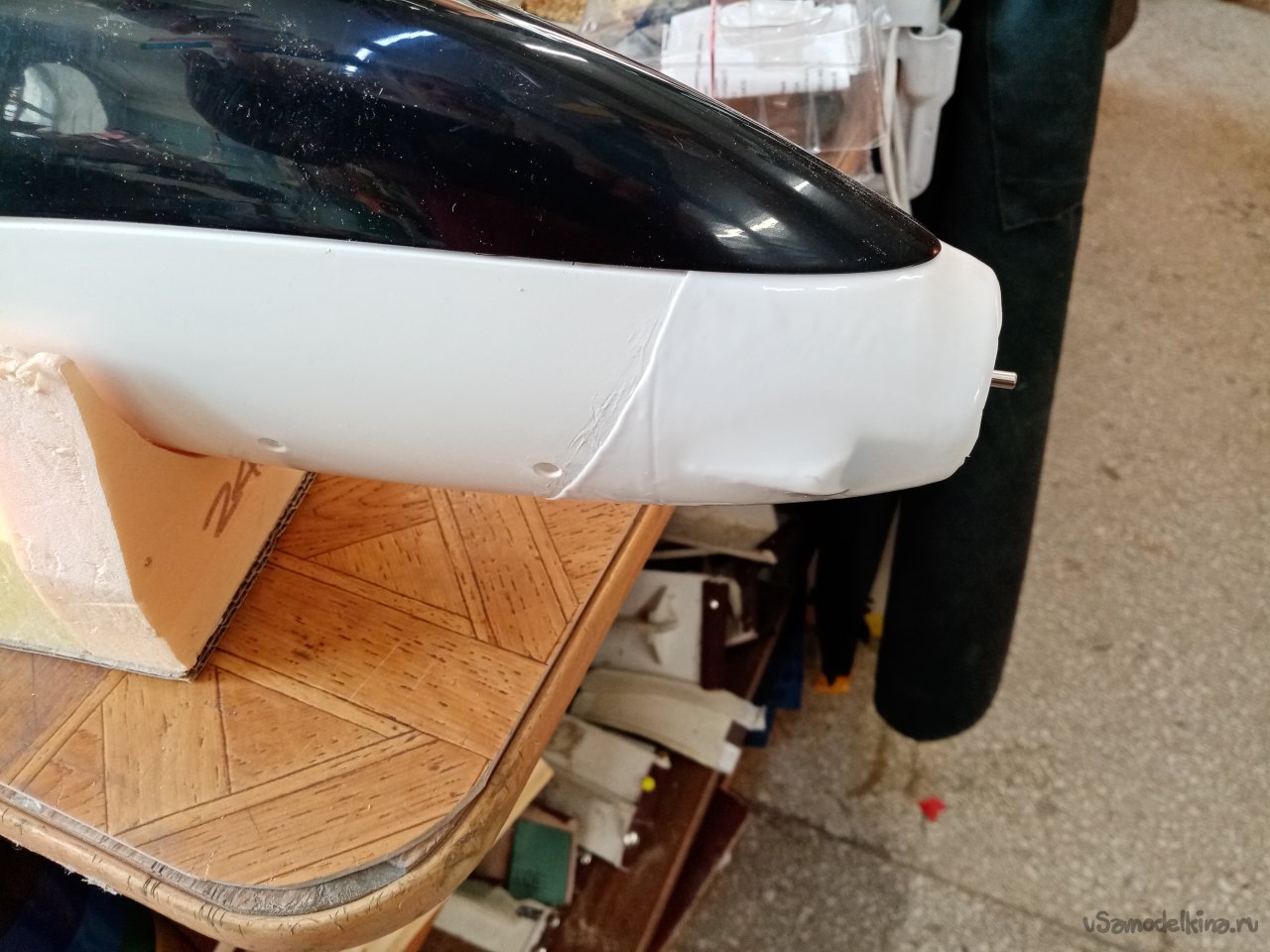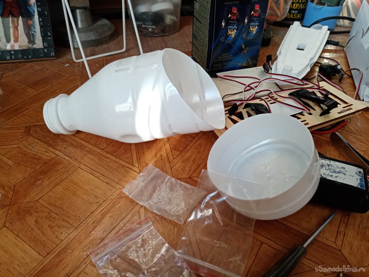 Почему решил значительно укрепить носик. При вытяжке фюзеляжа на месте перегиба борта и носовой площадки грань получается слишком тонкой. При грубых посадках, как правило появляются трещины и разрушения. Это пожалуй единственное слабое место этого замечательного планера. И так приступаю к усилению. При помощи белой бутылки от молока. Она хорошо подходит под размер отрезаю донную часть. Буду работать только с передней.