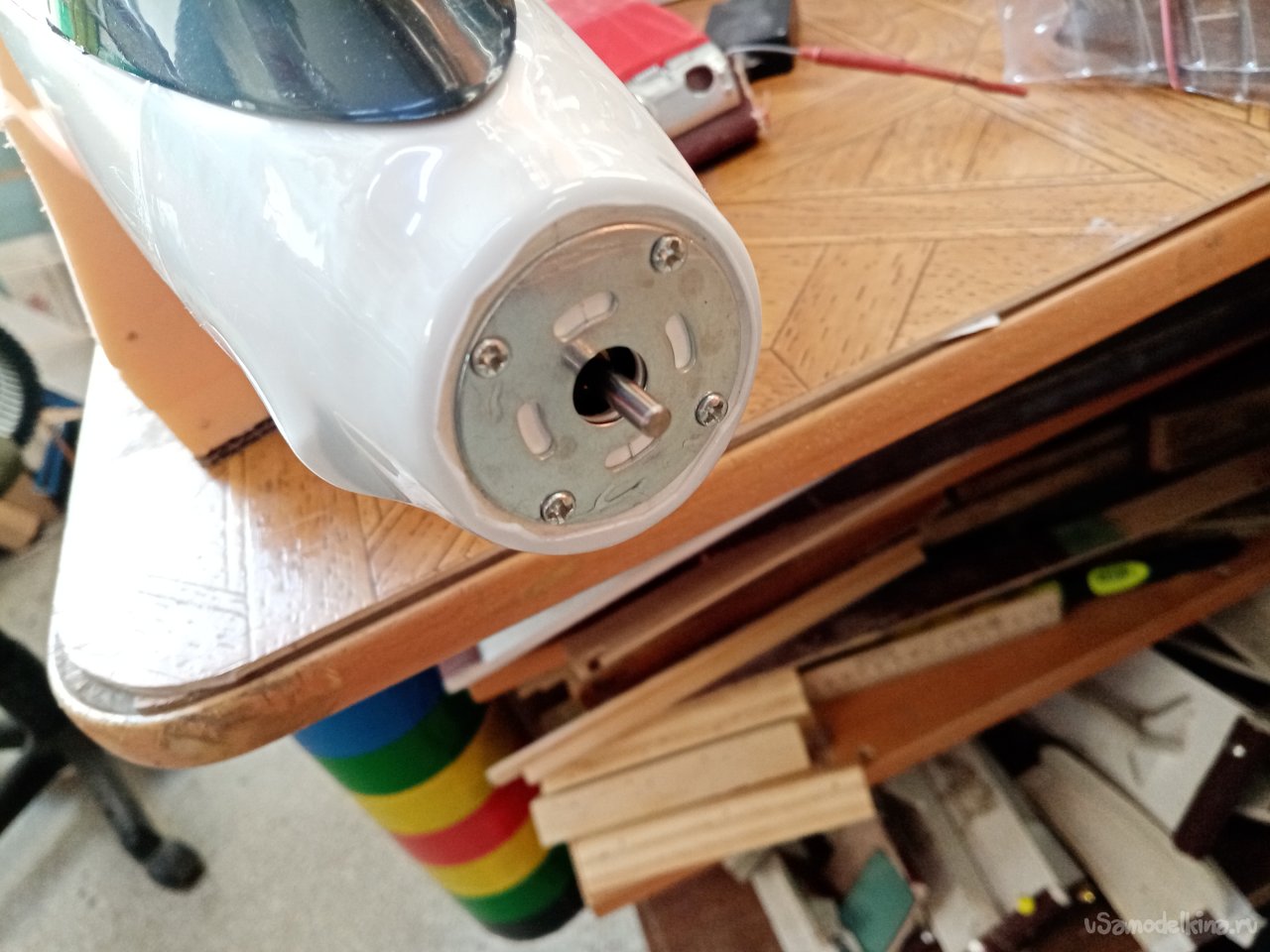 Затем мотор. По советовавшись с товарищем укрепляю носовую часть фюзеляжа. Для начала примеряю металлическую накладку на носовую часть.