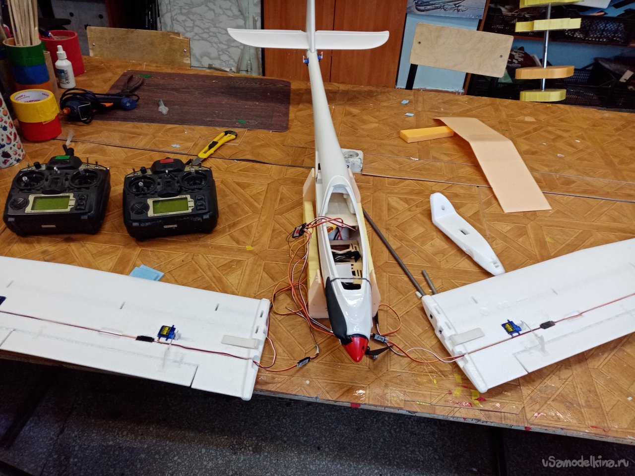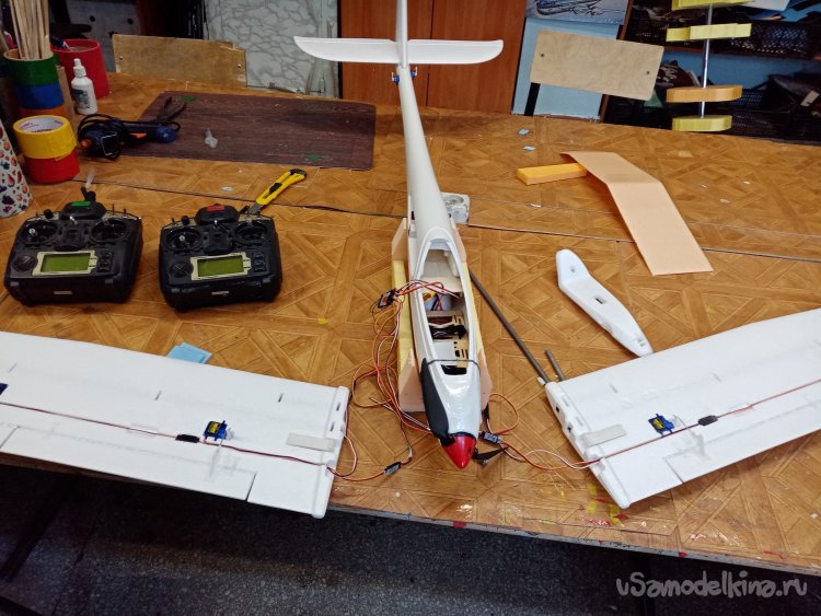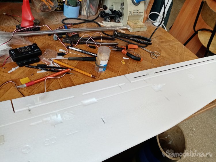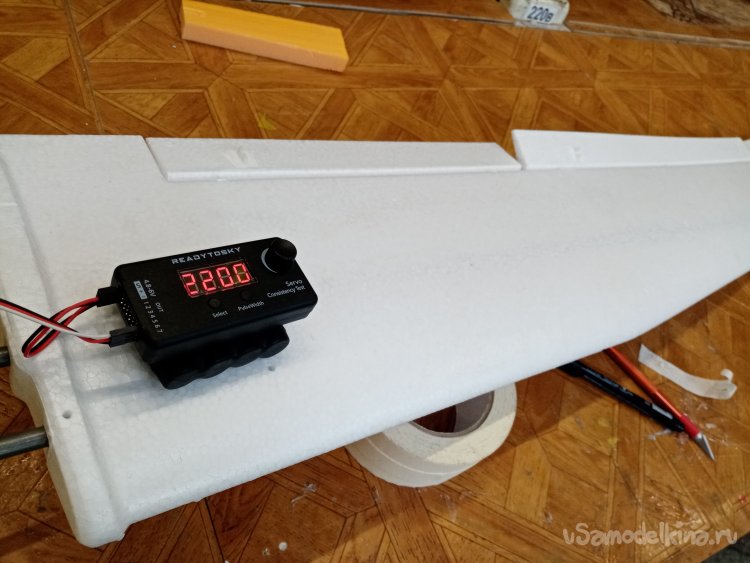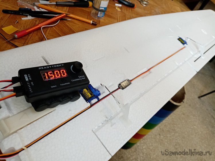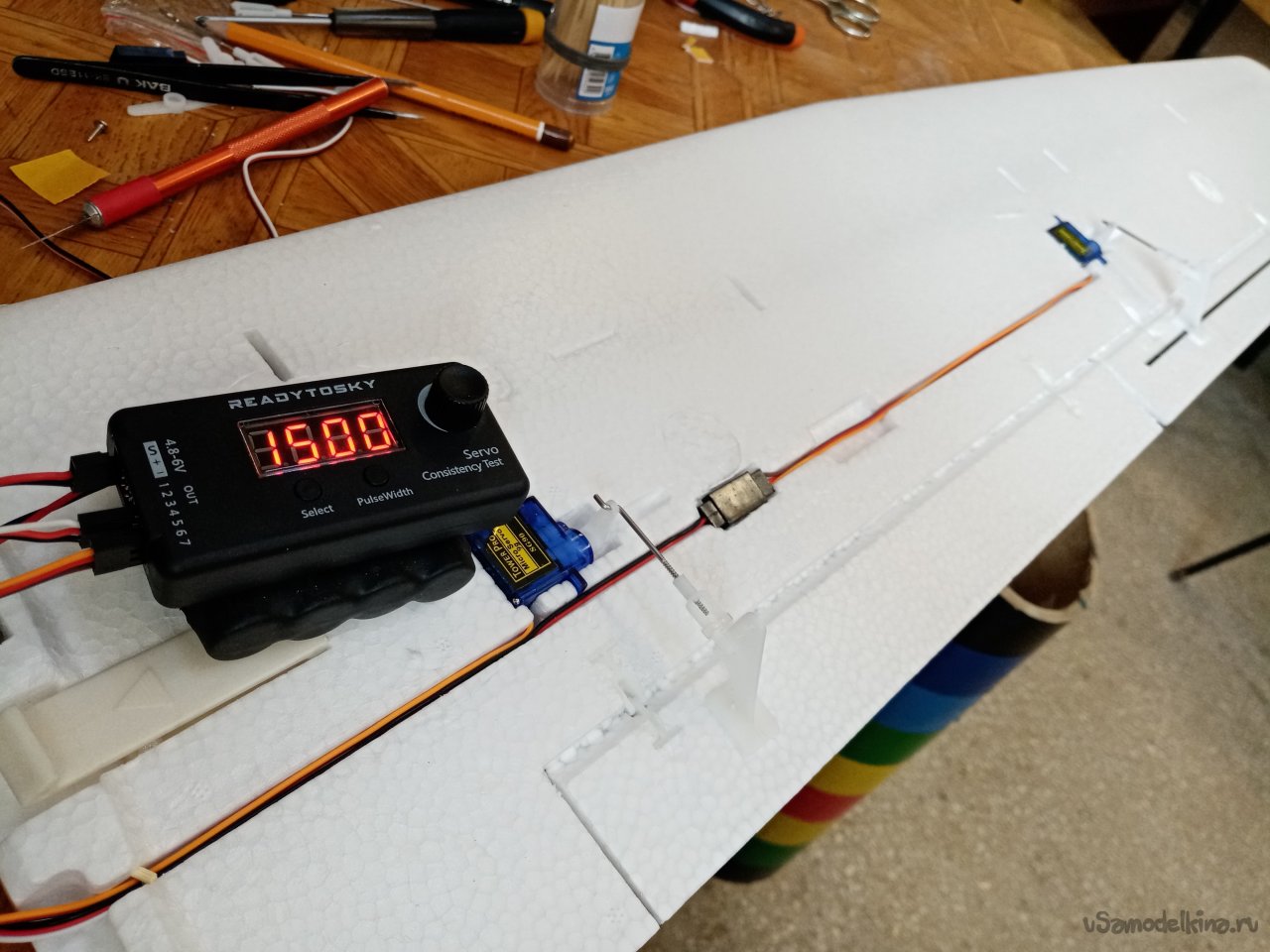 Сервотестером проверяю. Как все работает. С крыльями закончено. Можно продолжать с фюзеляжем. Там есть еще с чем повозиться.