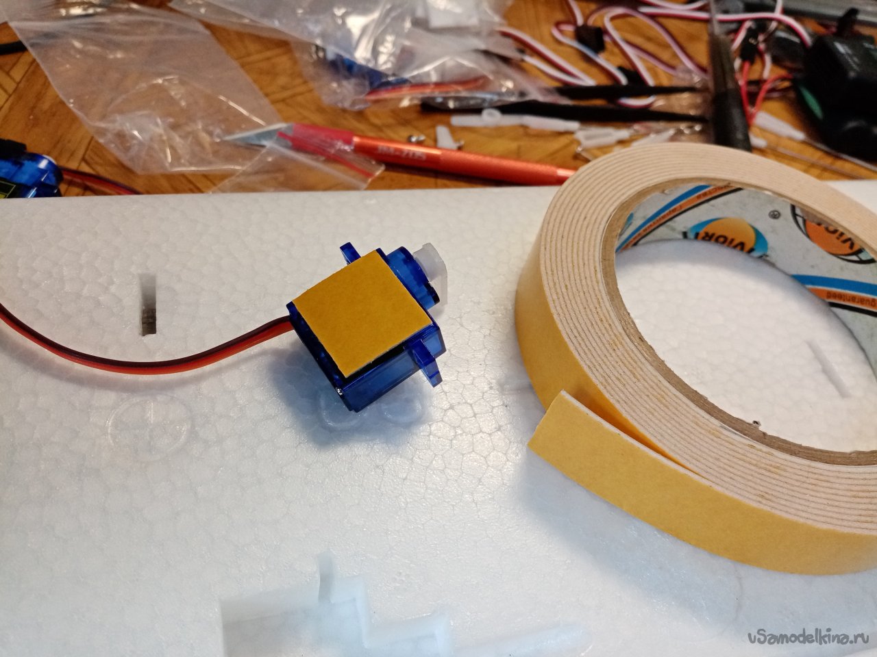 На сервоприводы устанавливаю тяги. В крыле фиксирую при помощи двухстороннего липкого скотча. Некоторое время назад купил в строительном магазине, хороший скотч, для зеркал.