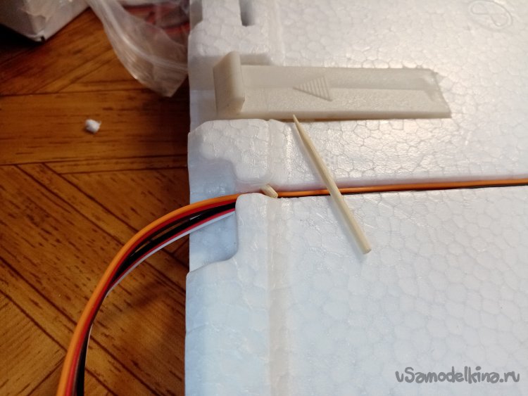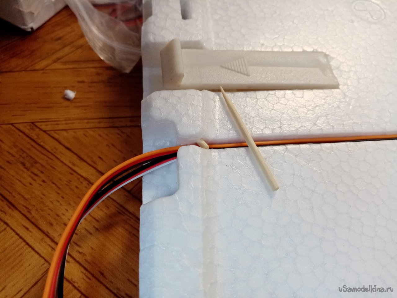 Конец провода на выходе из крыла дополнительно фиксирую отрезком зубочистки.