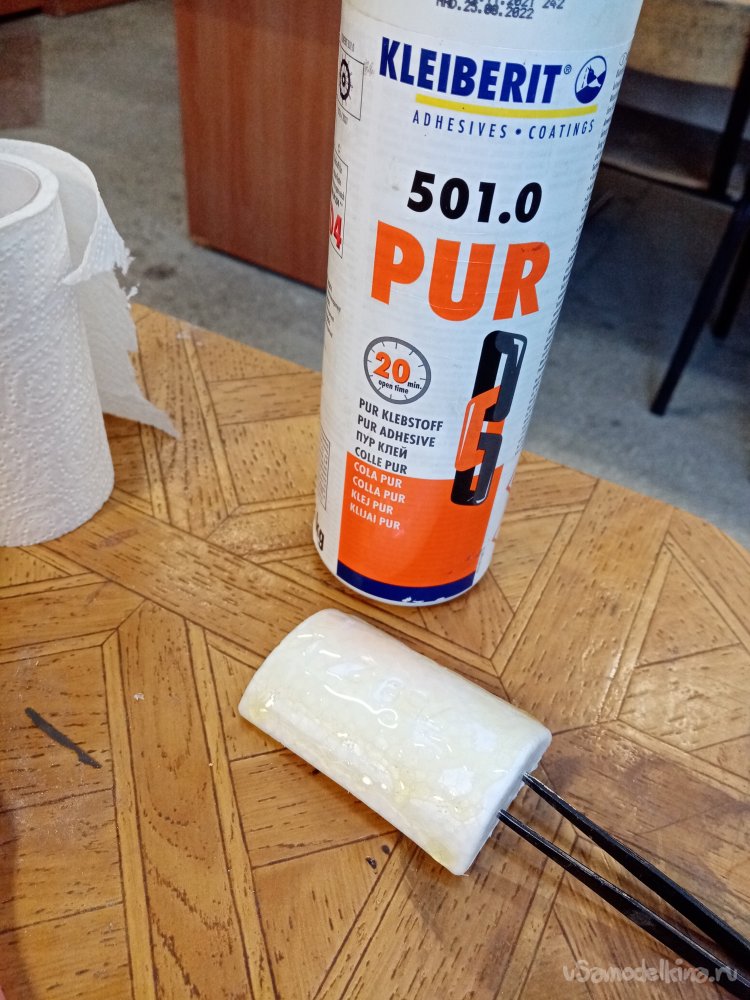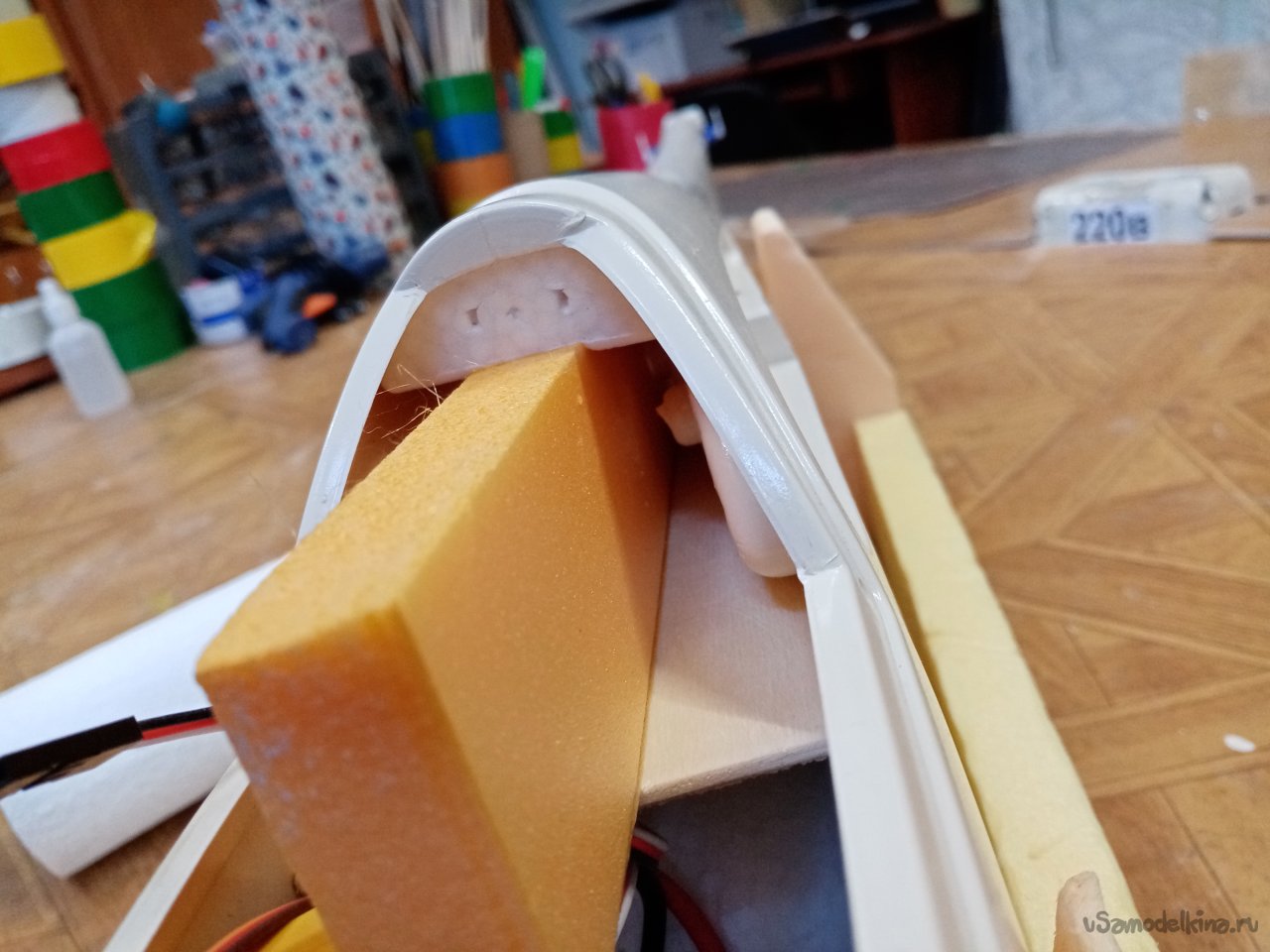 В верхней части фюзеляжа нужно установить пенопластовое усиление. Которое вместе с площадкой отвалилось. Крупной шкуркой лохмачу внутреннюю стенку гаргрота для лучшей адгезии клея. На пенопласт наношу ПУР 501 и устанавливаю на место. Вырезаю из утеплителя небольшой кусочек и фиксирую. Деталь в корпусе.