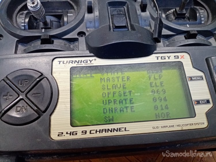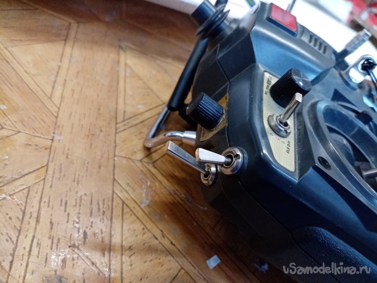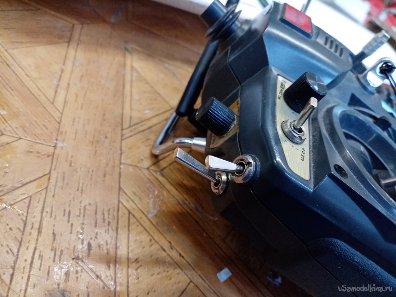 Буду настраивать работу флаперонов на тумблер. Несть несколько вариантов. На этот тумблер настрою тормоза. Когда флаперон опускается вниз на максимальный угол. Происходит торможение, но и увеличивается подъемная сила крыла. Слегка улучшается управления на малых скоростях. При этом планер «вспухает», нужно компенсировать отклонением вниз руля высоты. Это происходит одновременно. Все параметры настрою по своему планеру, углы отклонения тоже. Вторая позиция увеличения камбера крыла, увеличение подъемной силы практически без падения скорости. Элероны и флапероны отклоняются вниз одновременно на небольшой угол, повышая подъемную силу крыла. Применяется при взлете и парении. Эту функцию настрою на трехпозиционный переключатель справа. Опять же по своему планеру. Для более точной настройки нужны летные испытания. Поскольку самолетина моего друга будет значительно тяжелее со всеми примочками для визуального полета, плюс большие батареи. Если удастся, помещу в статью небольшие видео настройки.