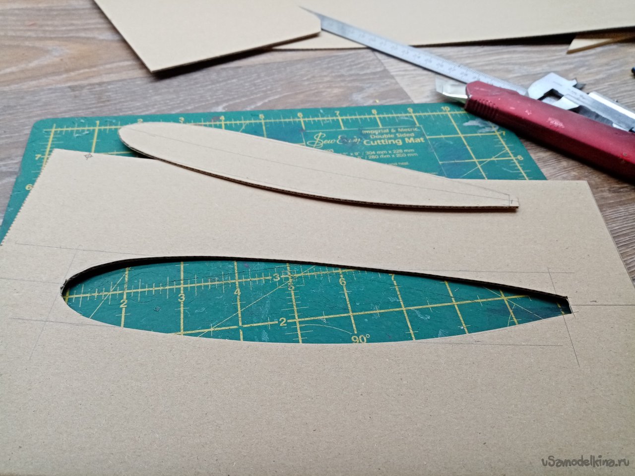 Затем мне нужны продольные связи на которые упираются крылья. Делаю шаблон проверенным методом из плотного картона. Вырезаю примерное отверстие слегка похожее на крыло. Затем устанавливаю его поперек и приклеиваю вплотную кусочки картона. После этих танцев имею четкий шаблон обводов крыла.