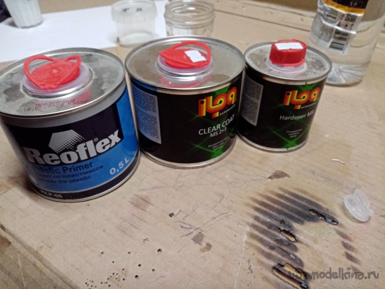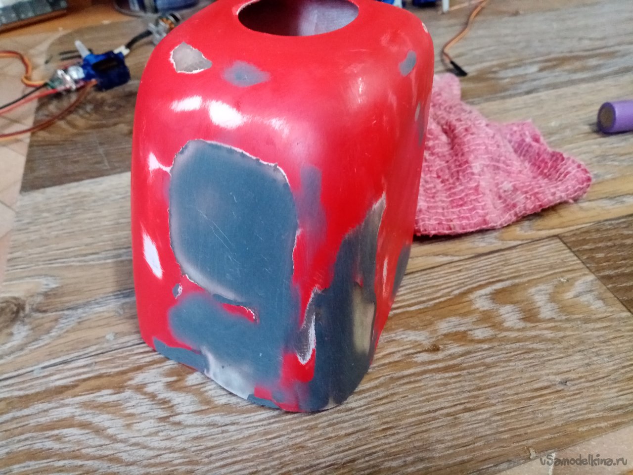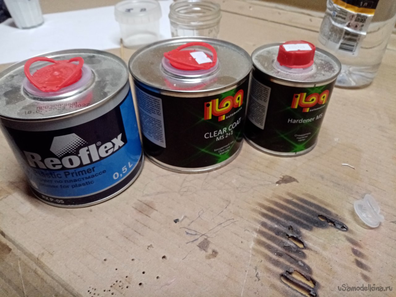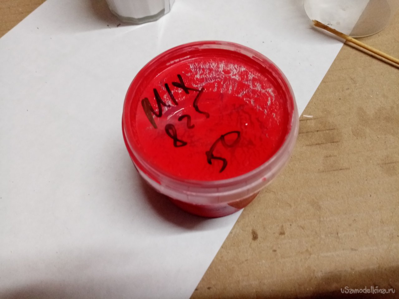 Понеслось. Сначала праймером по пластику, затем белой двухкомпонентной. Затем первый слой красной. Слегка не попали. Немного поправляю цвет добавлением желтой. И еще три слоя красной. Два слоя автомобильного двухкомпонентного лака. Один на зацепление второй под глянец. Хорошо получилось залить, даже полировать не нужно.