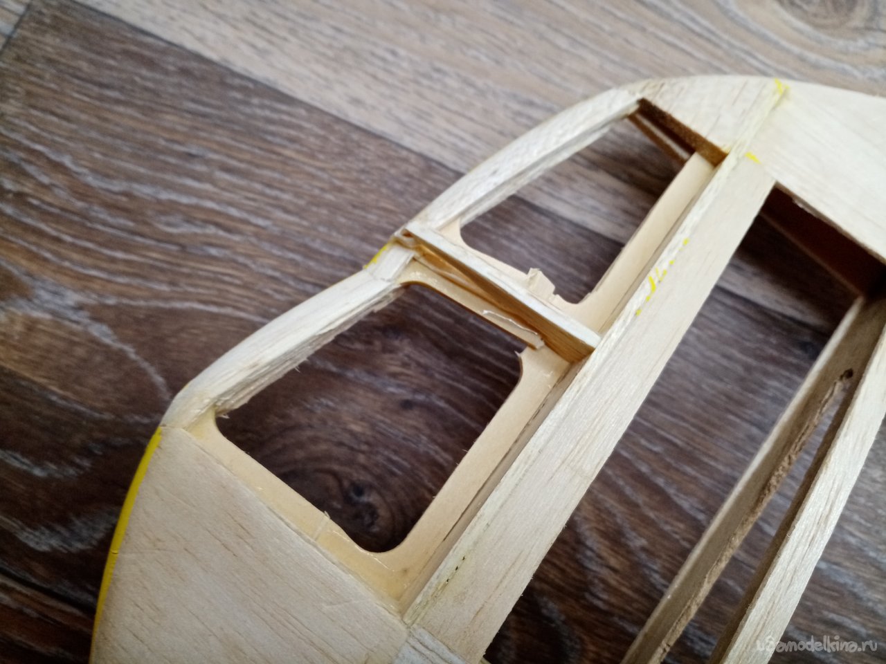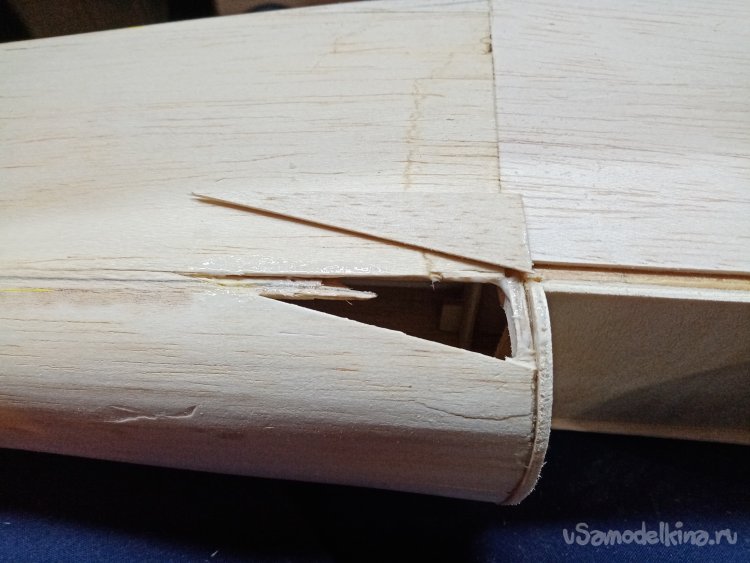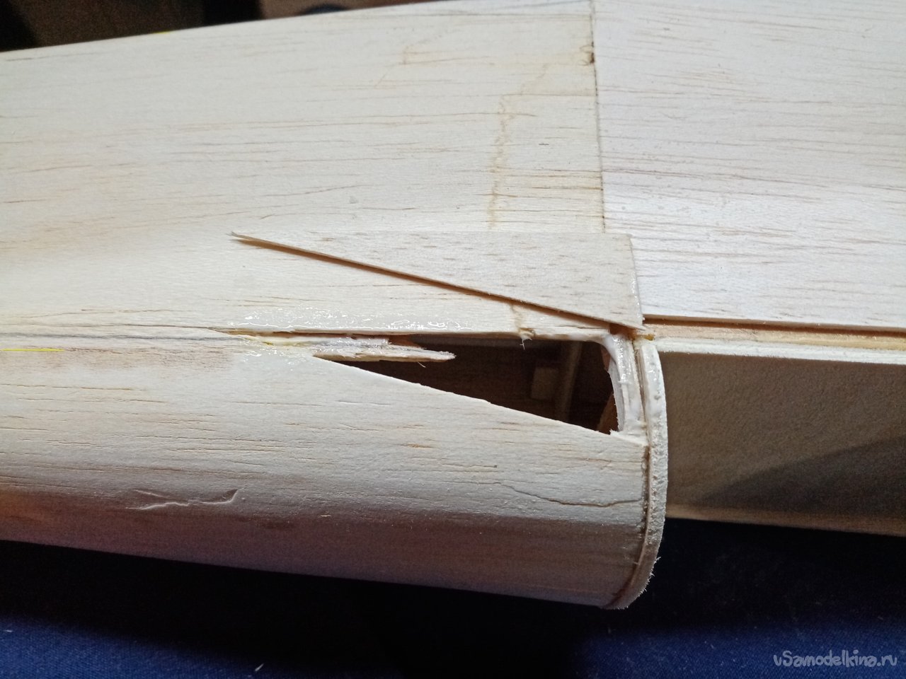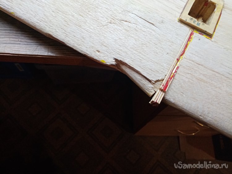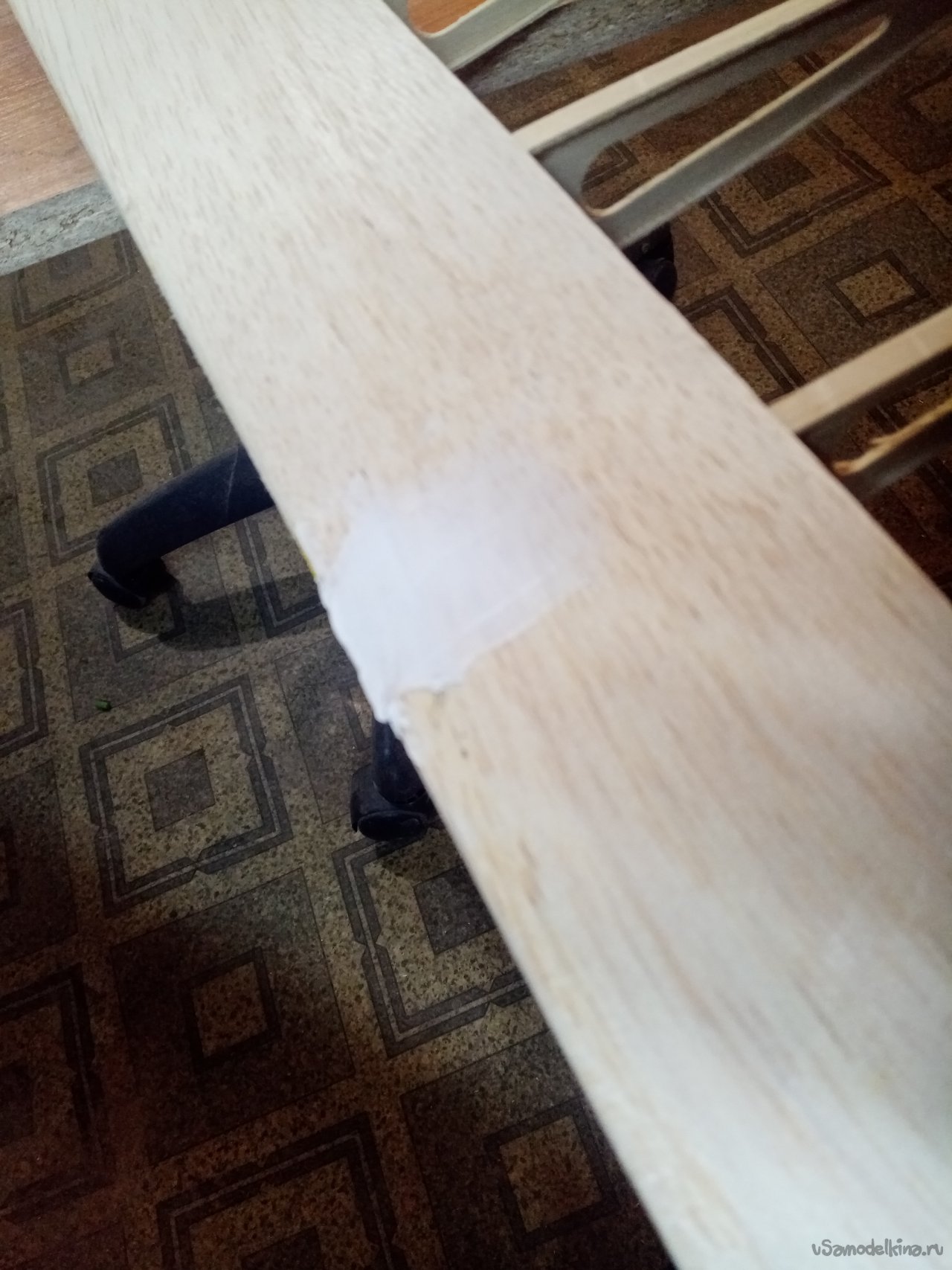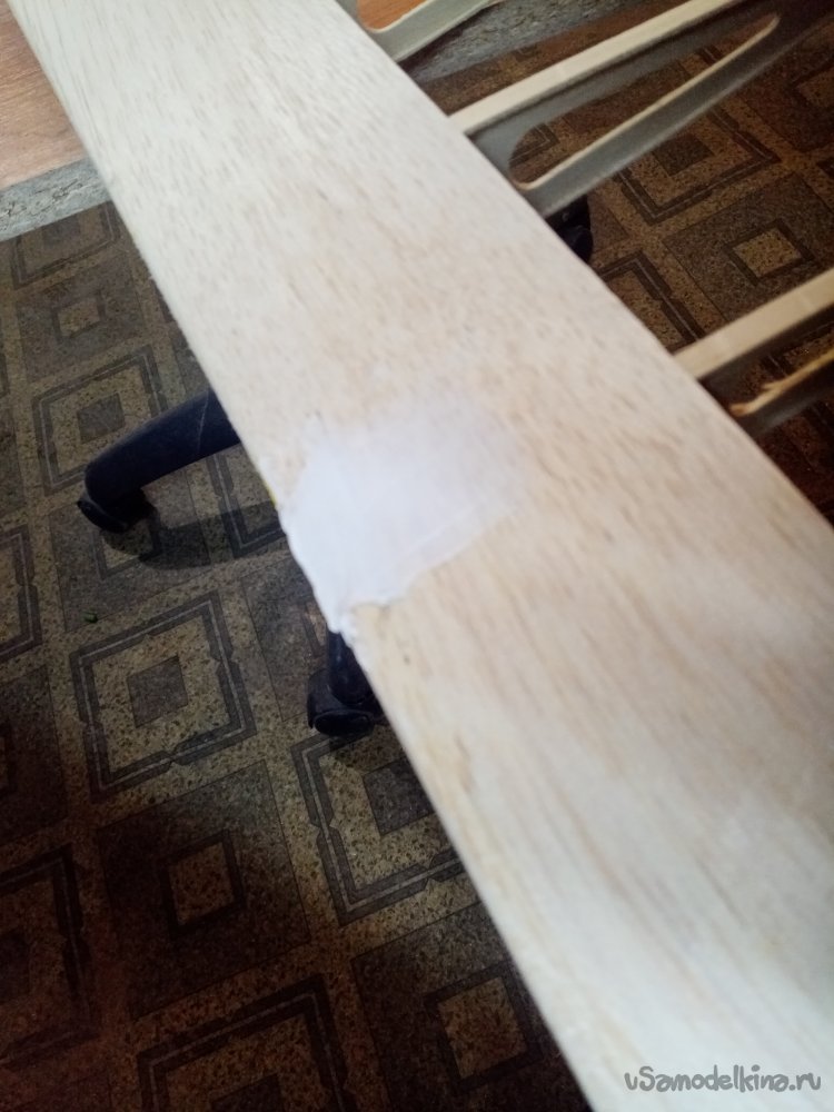 Повреждения устраняю с помощью реечек из бальзы. Заклеиваю на ПВА.