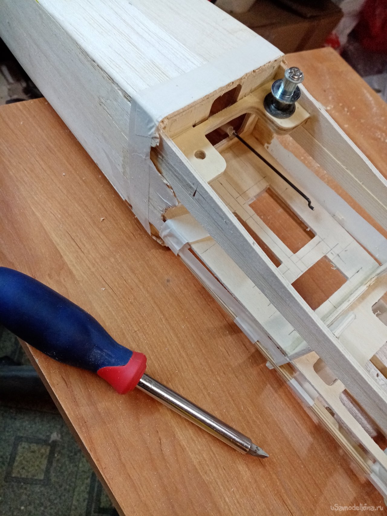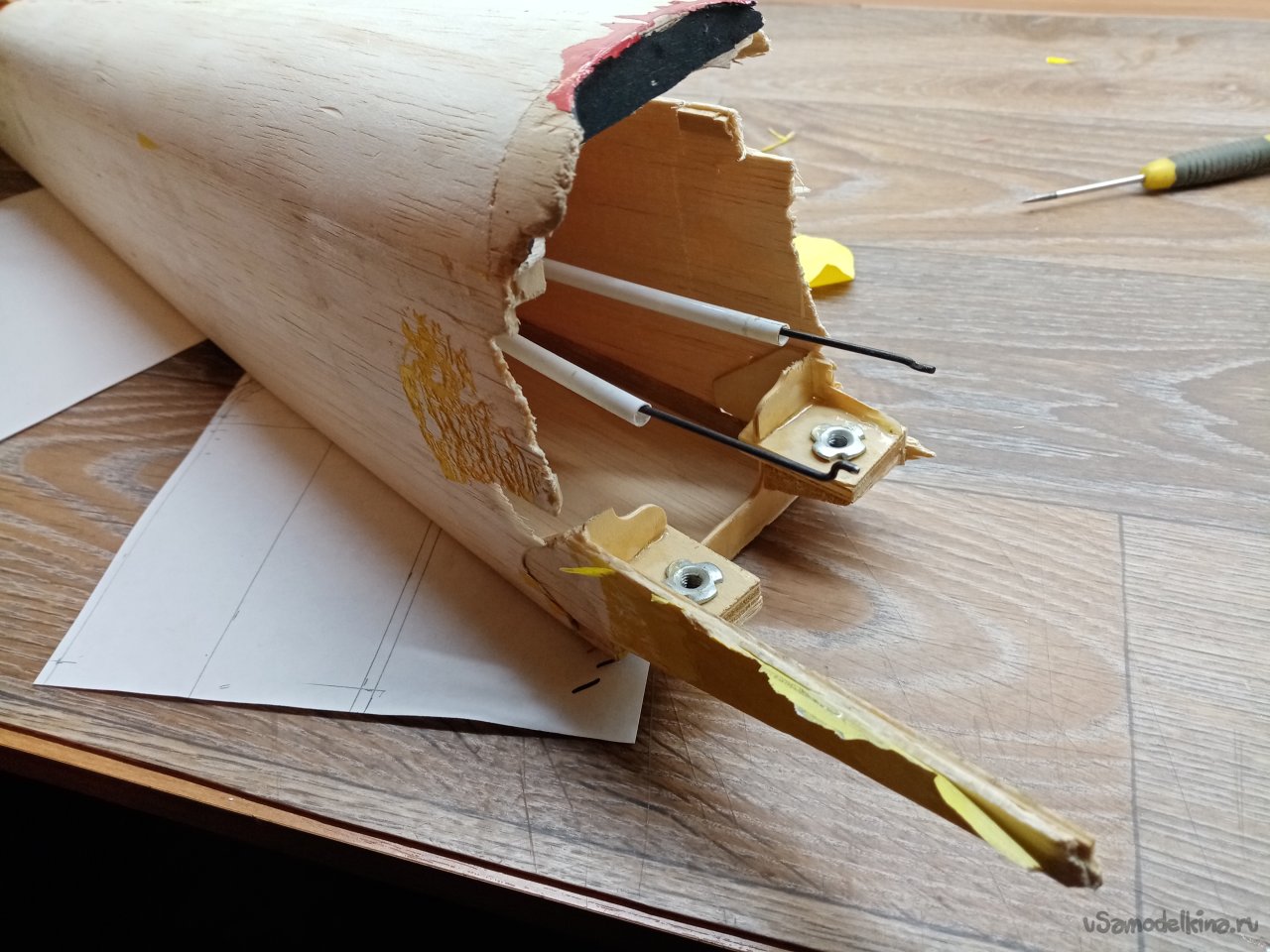 Предварительная операция завершена. Из хвостовой части торчат тяги в боуденах. Целые. Мебельные врезные гайки крепления крыла сохранились.