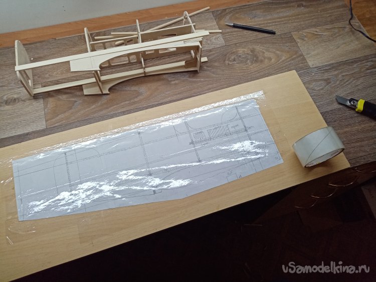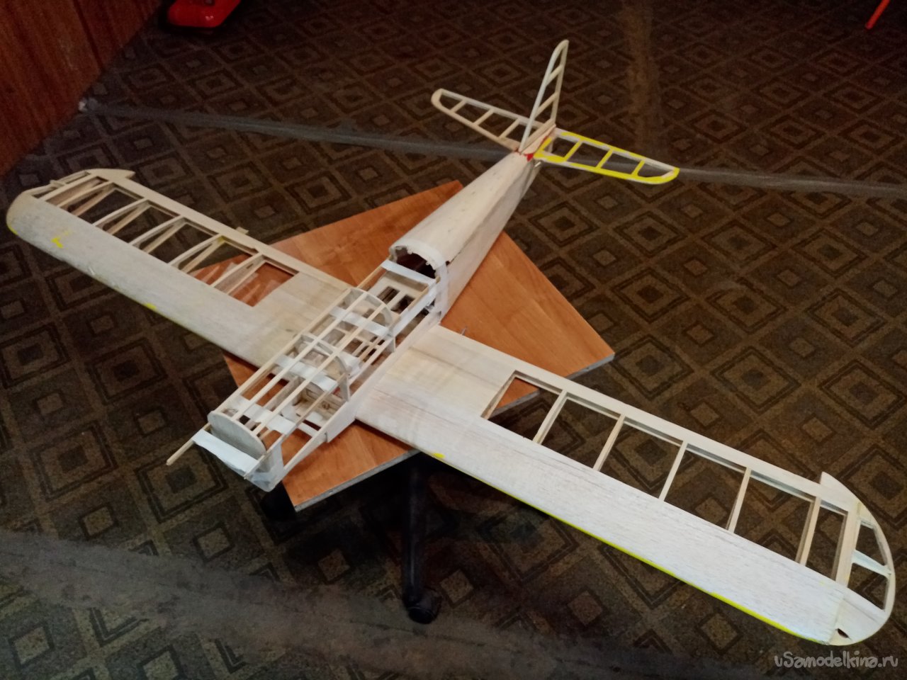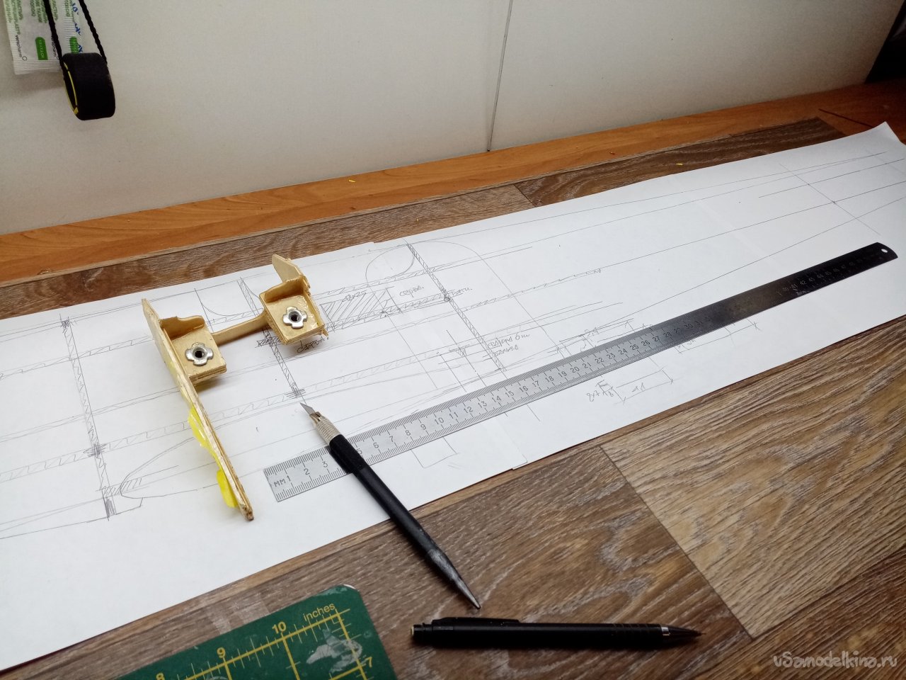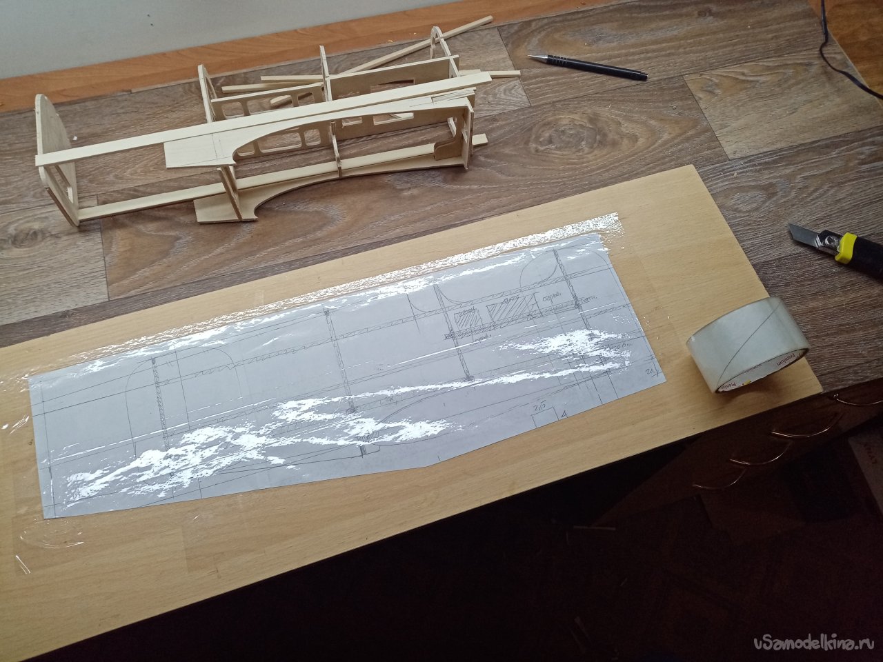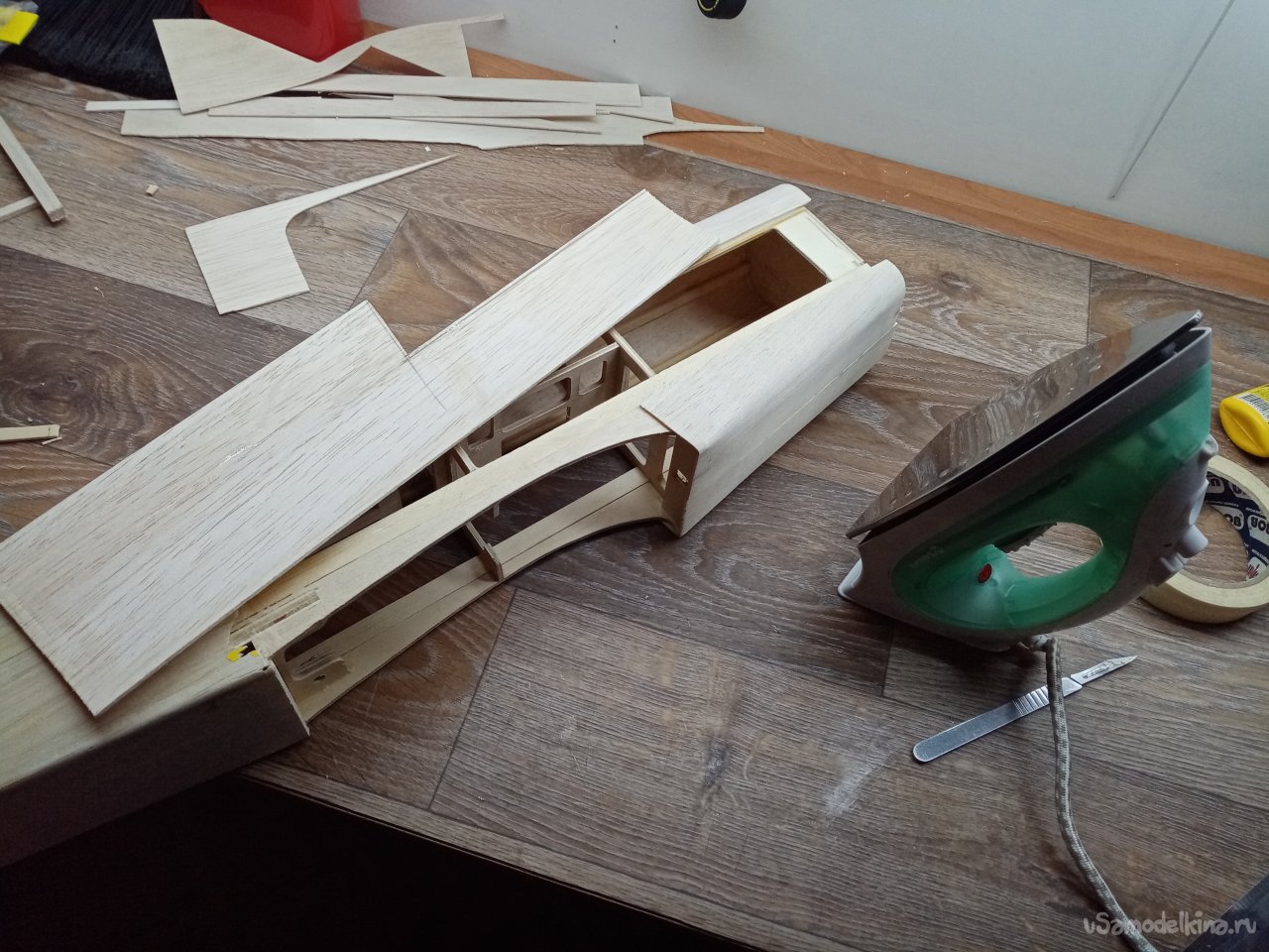 Все внутренние переборки из 2 мм авиационной фанеры. Нет у меня такой. Начинаю искать решение. На клее ПВА соединяю парочку листиков тонкой, авиационной фанеры из старых запасов. Помещаю пластинку под пресс. Пока идет склейка нужно нарисовать чертеж утраченной носовой части фюзеляжа. Разобраться с креплением крыла. Для начала лезу в интернет, ищу чертеж. Но нет, как правило, продаваемые модели не имеют их в свободном доступе. Хорошо. Захожу с другой стороны. Нет чертежа. Должна быть инструкция. Там есть общее описание сборки и наверняка размеры. В данном случае нужна длина фюзеляжа. Поиски увенчались успехом и довольно быстро. Инструкция по сборке данной модели нашлась.