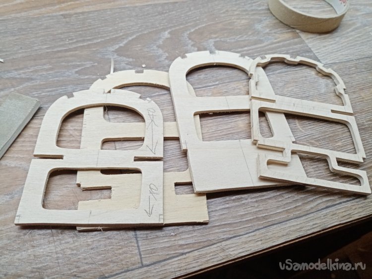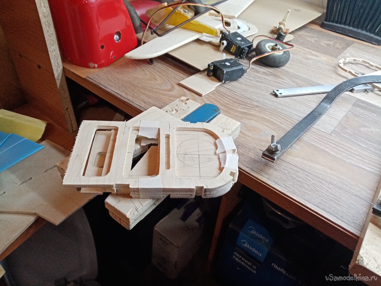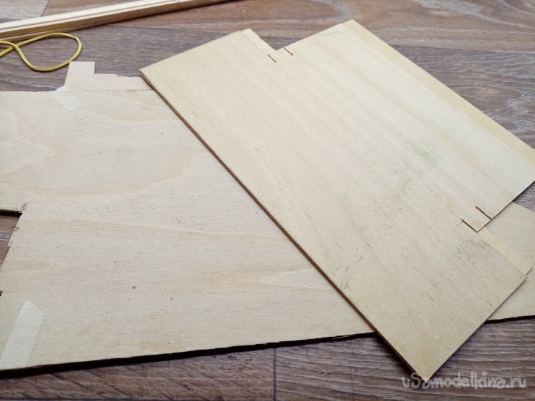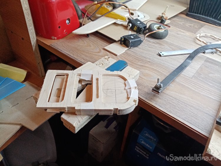 Затем полки, соединяющие это пространство, тоже из 4 мм фанеры. Не скуплюсь на толщину. Связь должна быть прочной. В этой детали будут отверстия для установки сервоприводов на управление рулем высоты и рулем направления, совмещенным с передним колесом шасси. Посмотрю дальше, как и что, может, напилю отверстий облегчения. А пока все будет так, сплошняком. Предварительно соединяю элементы на малярном скотче. Пока не склеиваю.