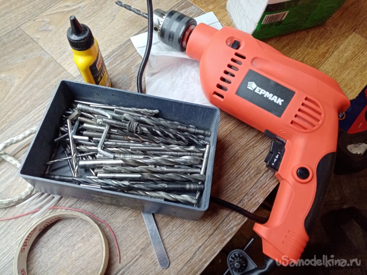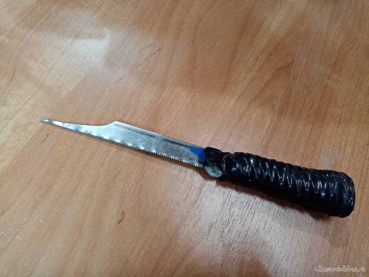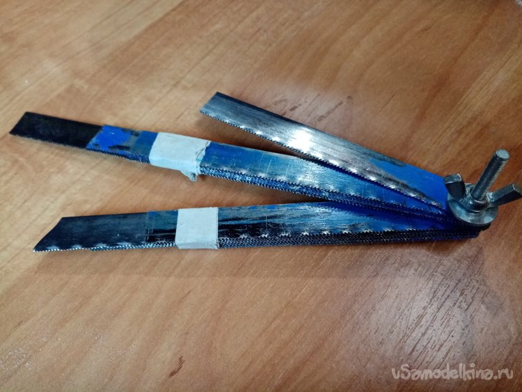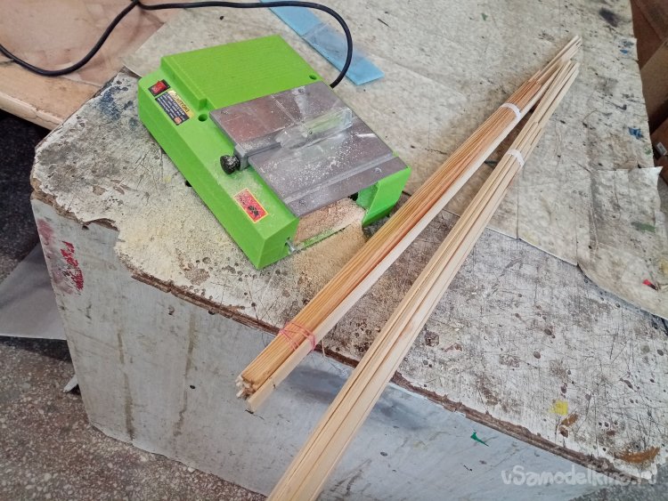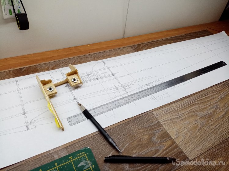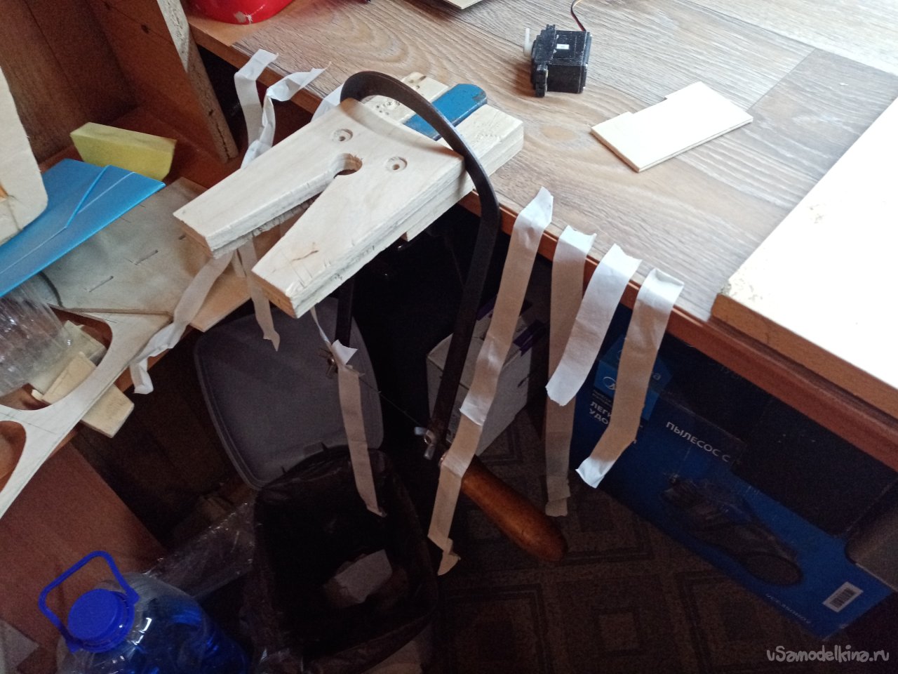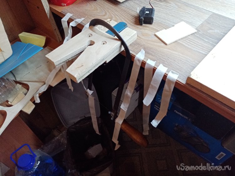 Затем в конструкцию нужно врезать продольные рейки усиления. Размечаю места установки и пропиливаю пазы своим приспособлением. Изготовленным и пакета пилок по металлу. Можно комбинировать ширину пропила добавляя или убирая пилки. В полу вырезал отверстия для установки сервоприводов и примерял. Что-то сильно могучие там стоят. Но не буду переделывать, поскольку их тоже презентовали. Все получилось, с первого раза пропилил, подогнал, можно клеить. В работах по дереву использую клей ПВА.