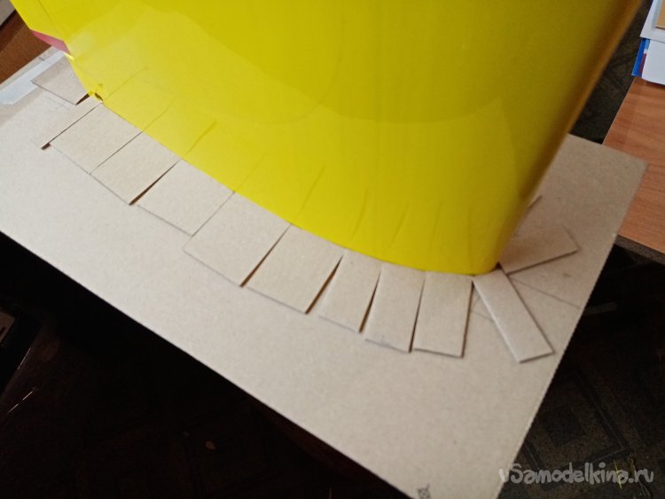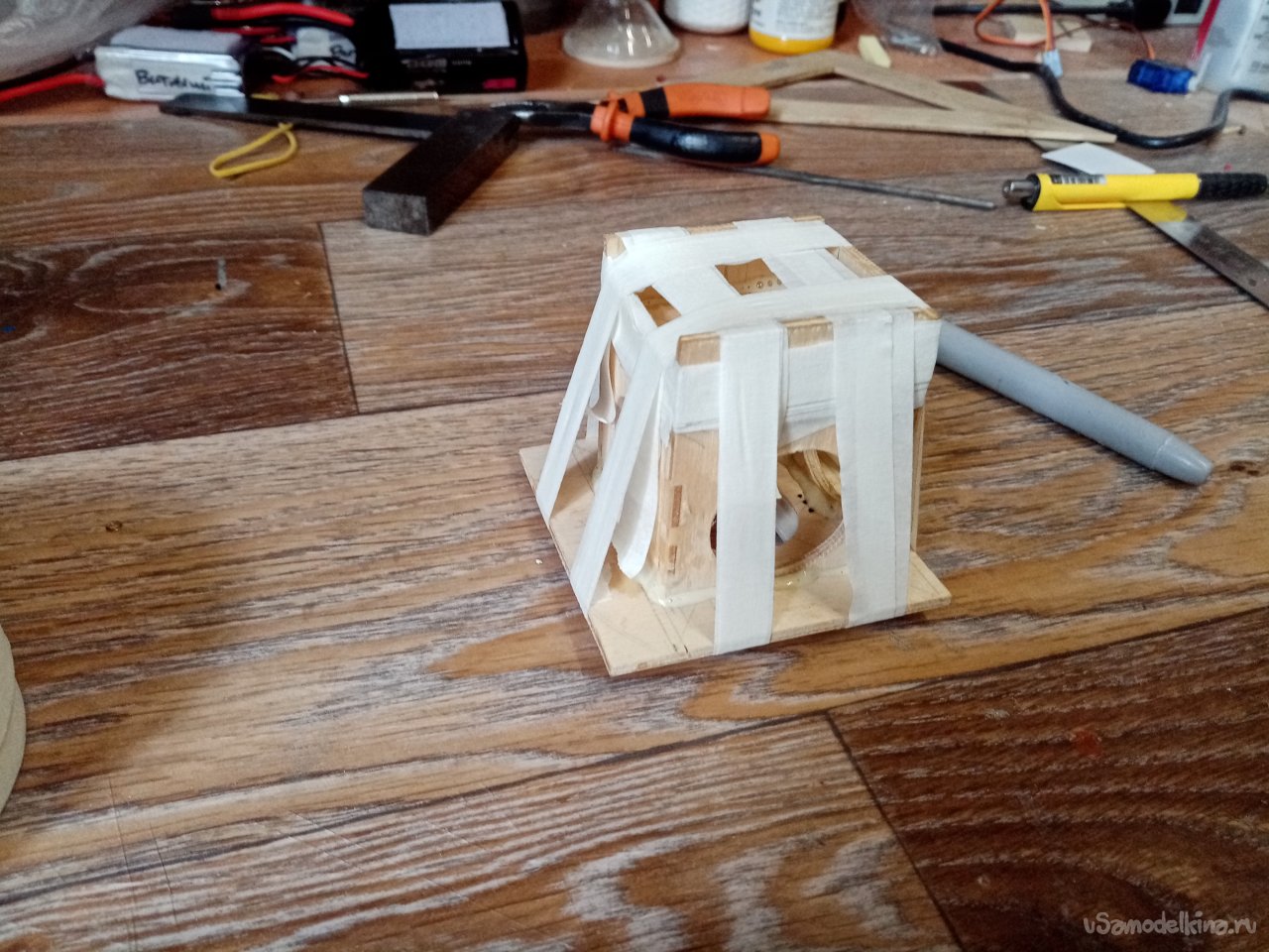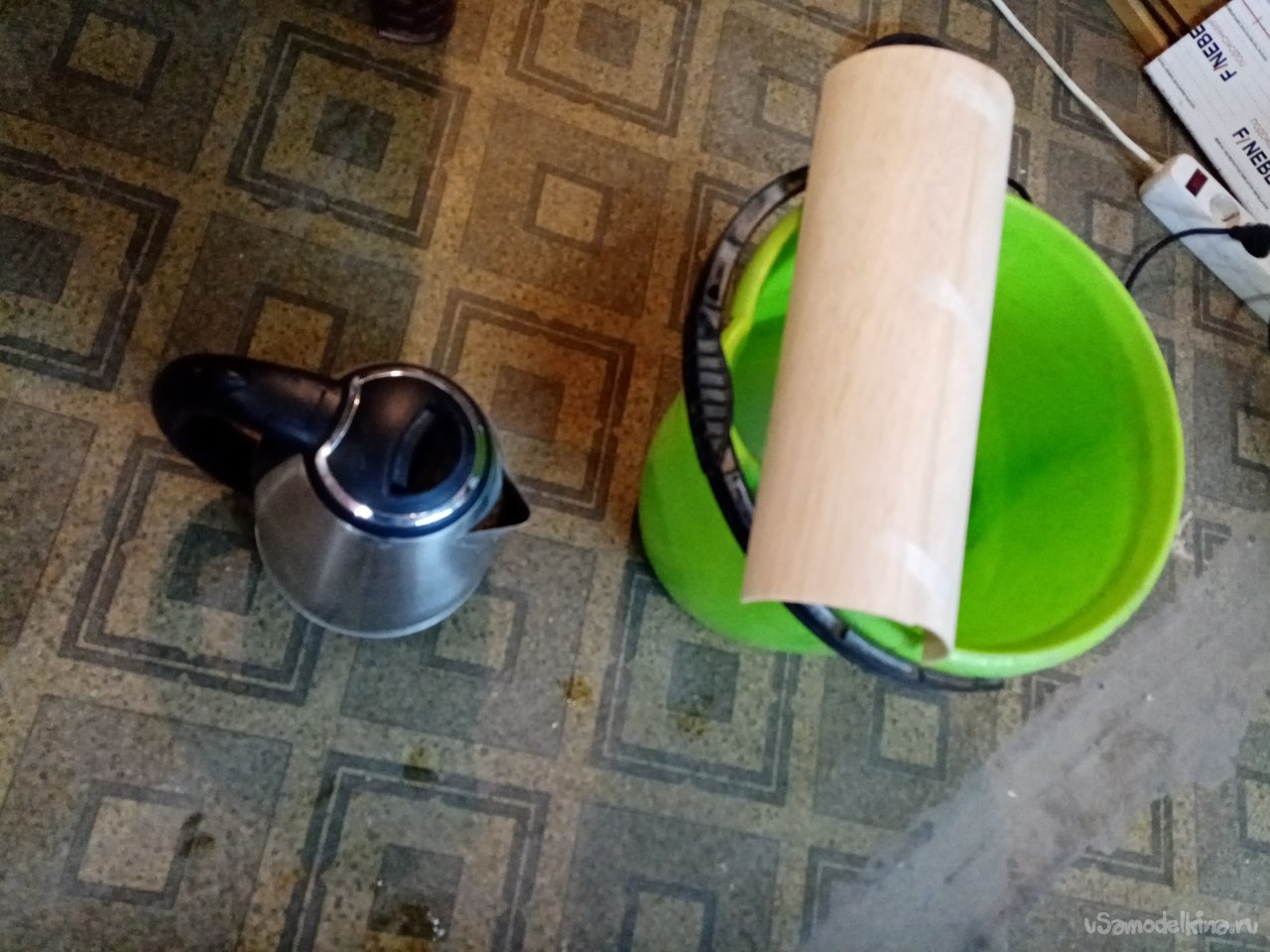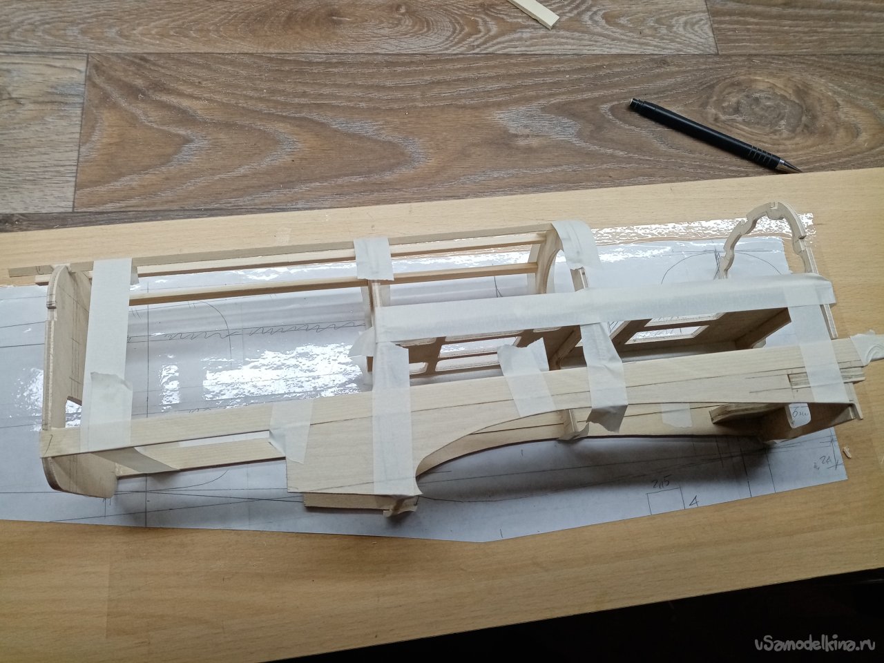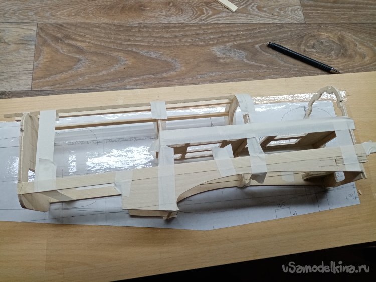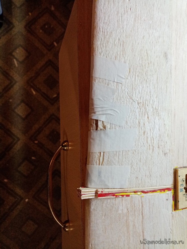 По шаблону вырезаю заготовку. Нужно согнуть. Процесс достаточно простой. Проливаю одну сторону бальзы кипятком из чайника. Накладываю на нужное место, фиксирую полосками малярного скотча и оставляю сохнуть.