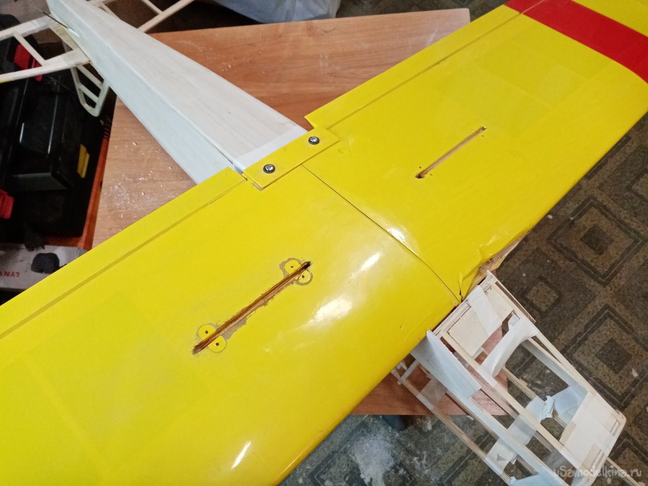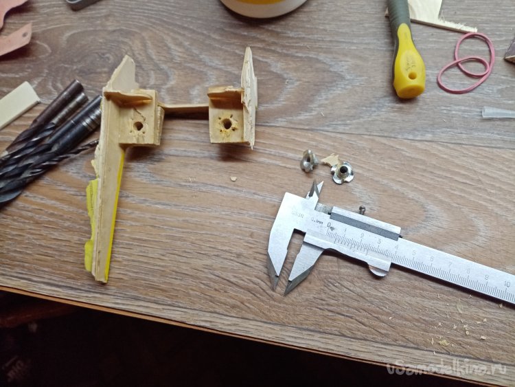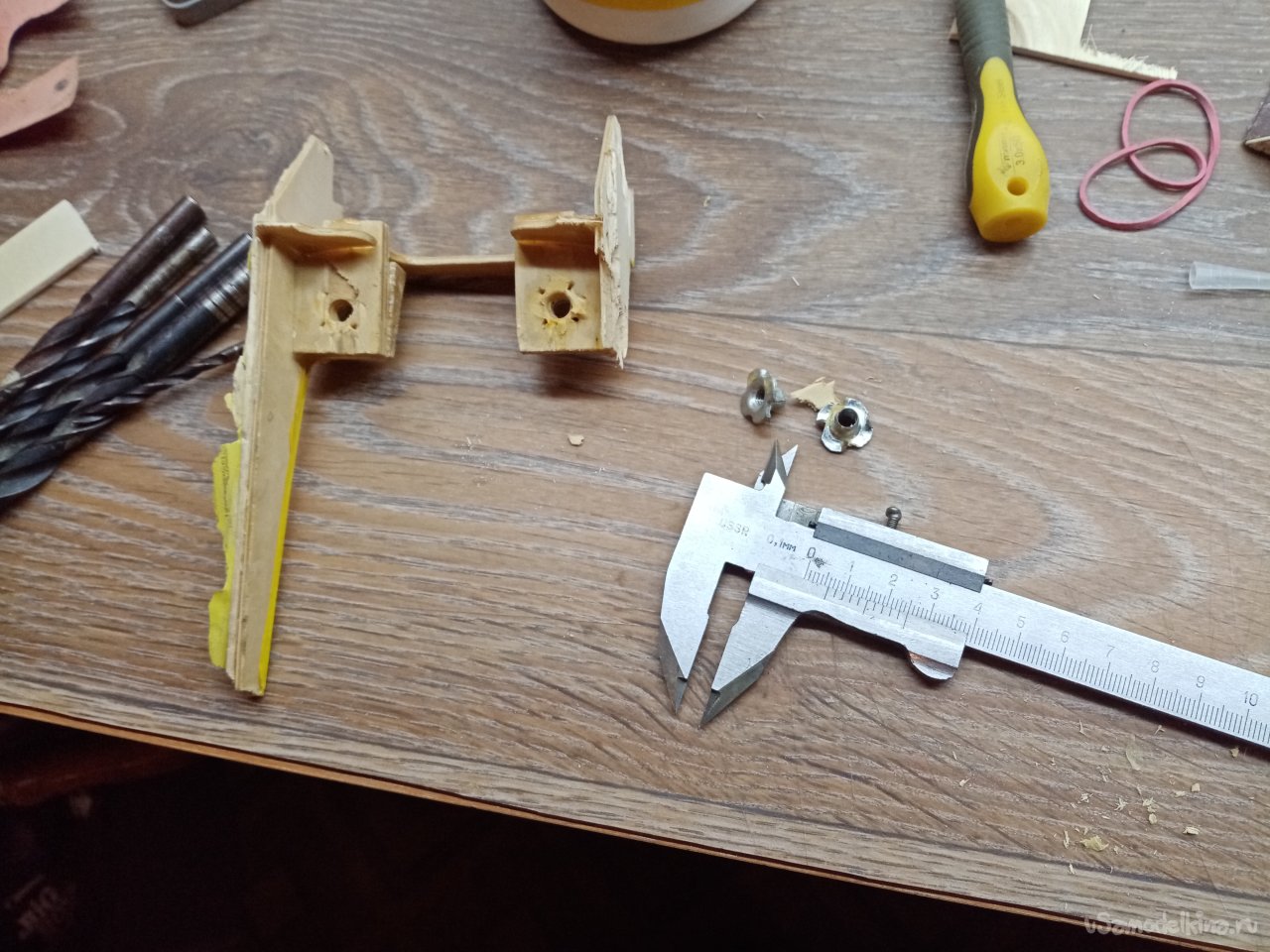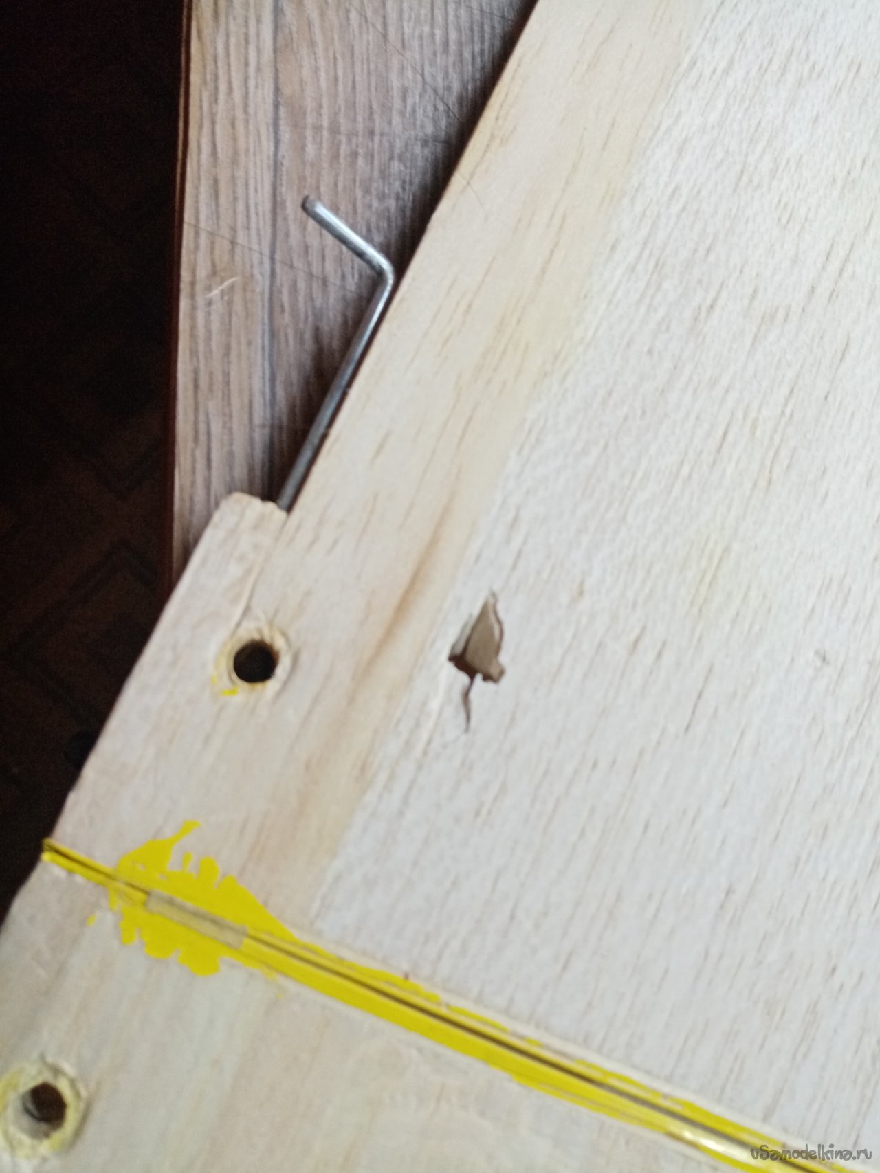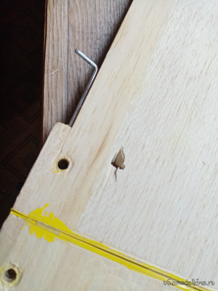 Из обломков выковыриваю мебельные шайбы с зубчиками. Это крепления задней кромки крыла. Размечаю отверстия в фанере и сверлю отверстия на микрон меньше нужного. Нужно со значительным усилием установить.