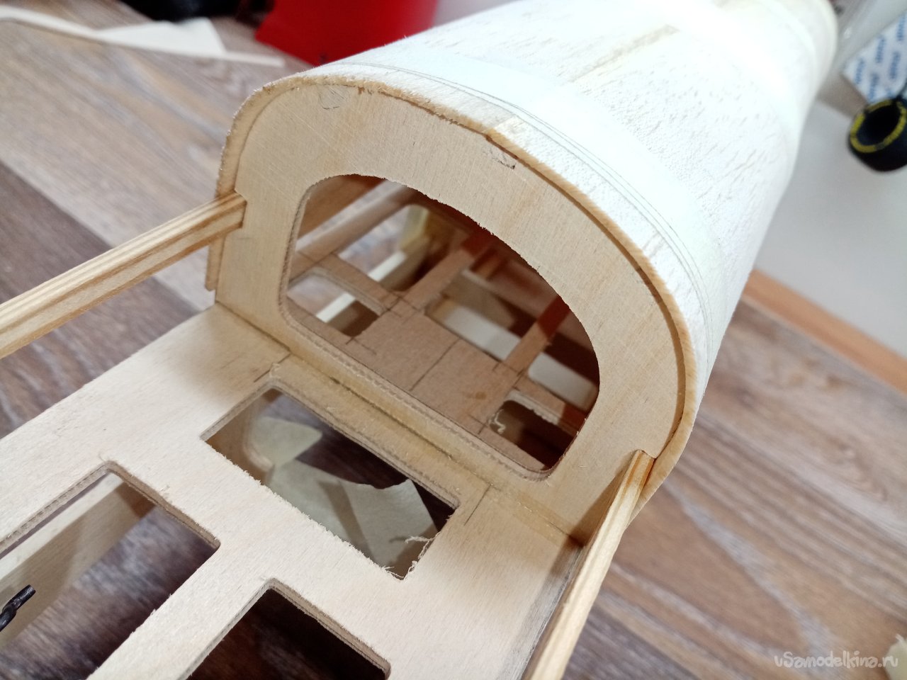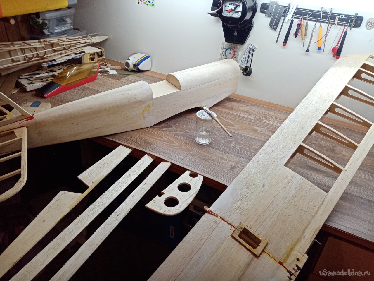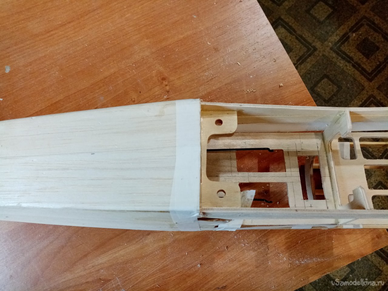 Немного переделал внутренние перегородки. Усилил. Увлекся облегчениями, мне не нравятся тонкие стенки деталей в таком нагруженном месте. К тому же эта модель не для пилотажа и рекордов. Полеты в свое удовольствие несколько лишних грамм не ухудшат полет. Прочнее будет. Склеенной фанерки хватило в притир. Хотя сначала подумал использовать в этом месте фруктовую фанеру.