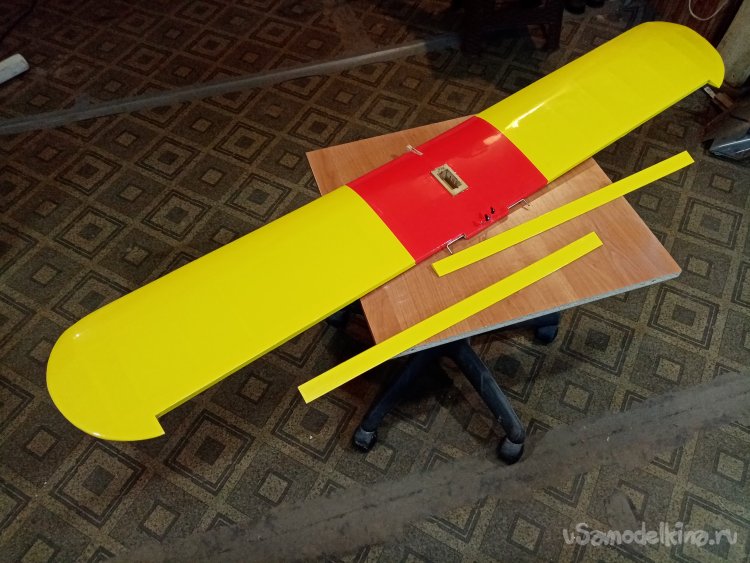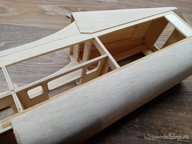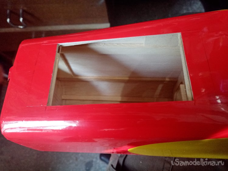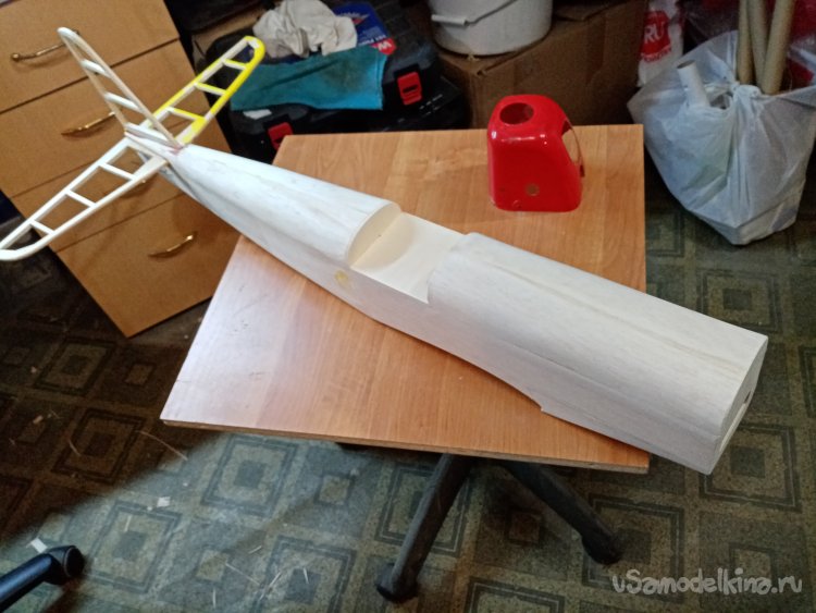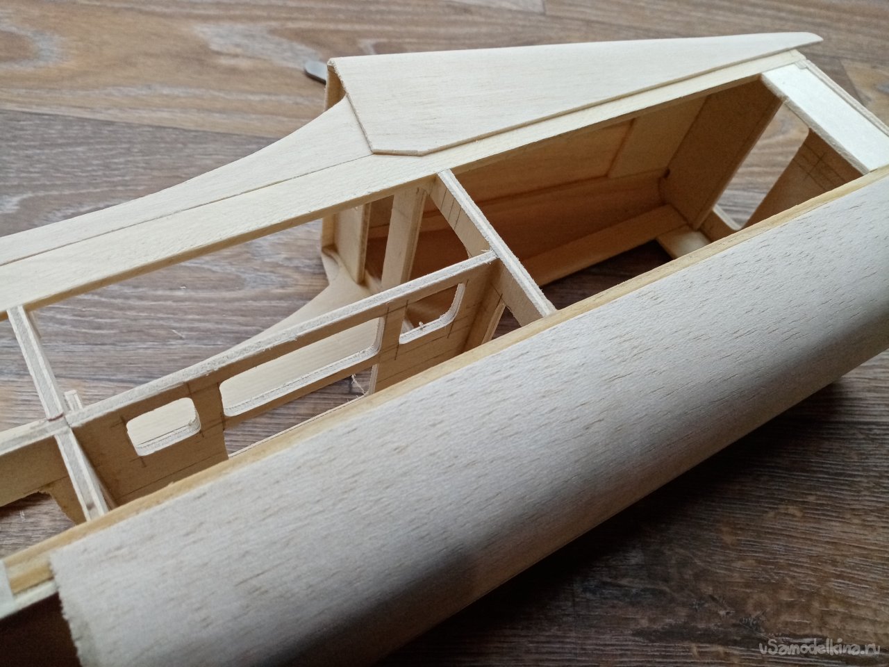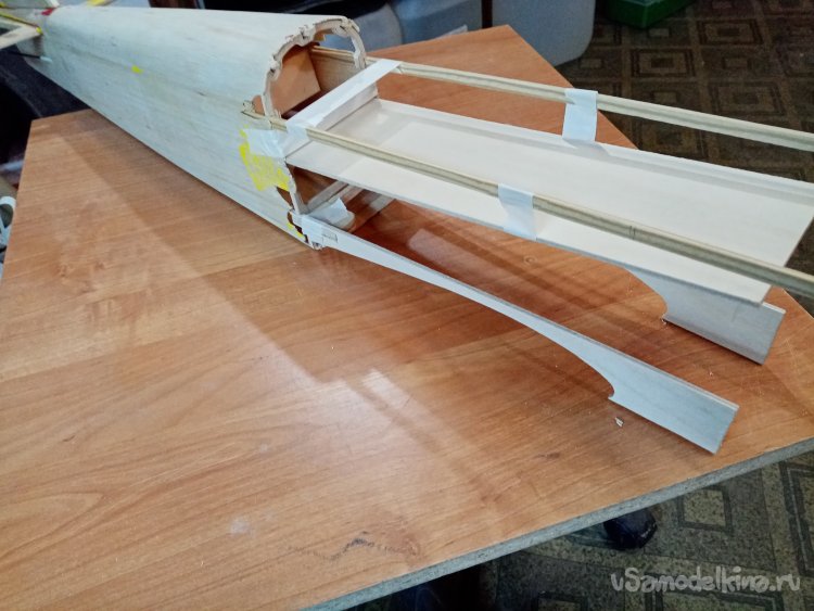 Немного переделал внутренние перегородки. Усилил. Увлекся облегчениями, мне не нравятся тонкие стенки деталей в таком нагруженном месте. К тому же эта модель не для пилотажа и рекордов. Полеты в свое удовольствие несколько лишних грамм не ухудшат полет. Прочнее будет. Склеенной фанерки хватило в притир. Хотя сначала подумал использовать в этом месте фруктовую фанеру.