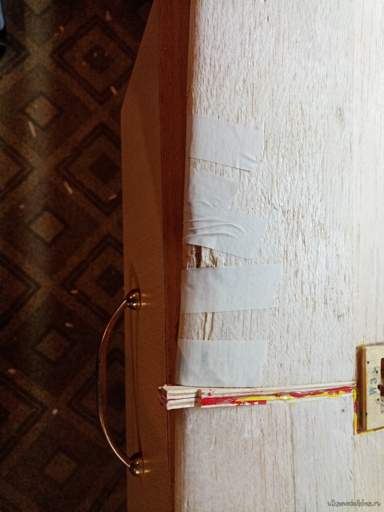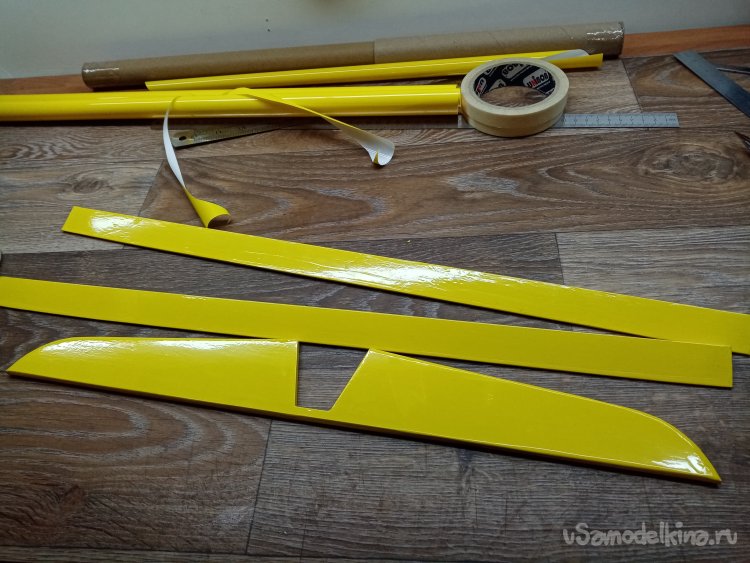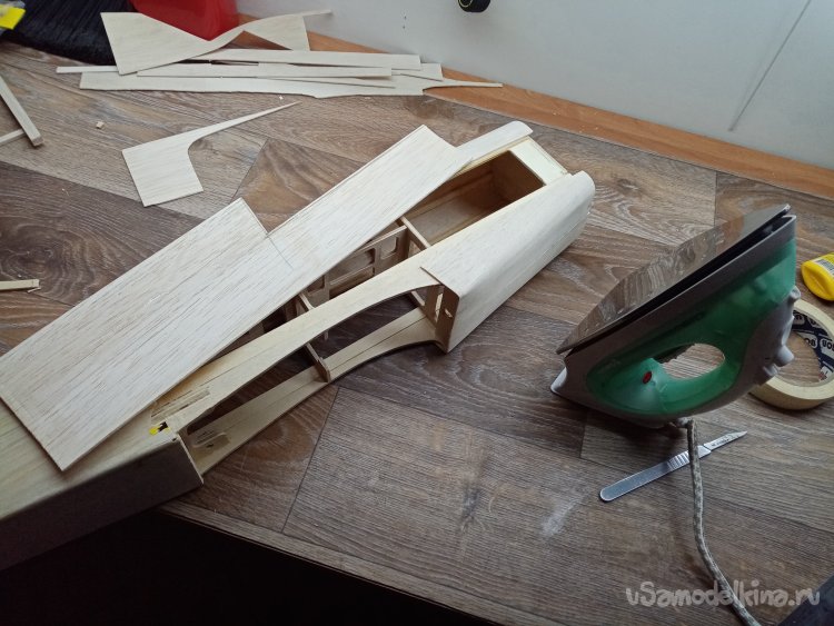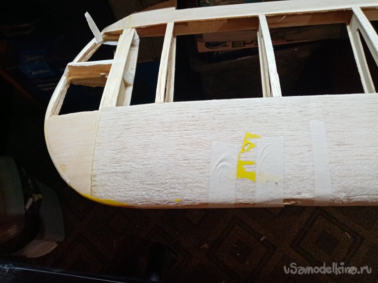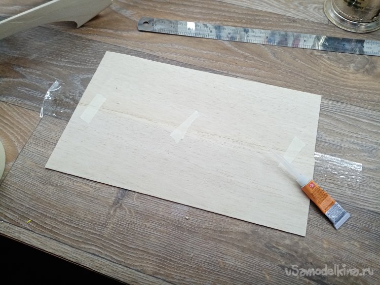 Нужно обшить восстановленные части фюзеляжа. Промеряю толщину обшивки. Такая бальза есть в наличии. Парочку пластинок соединяю в торец при помощи циакрина и фиксирую малярным скотчем.
