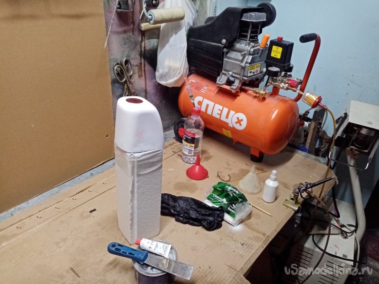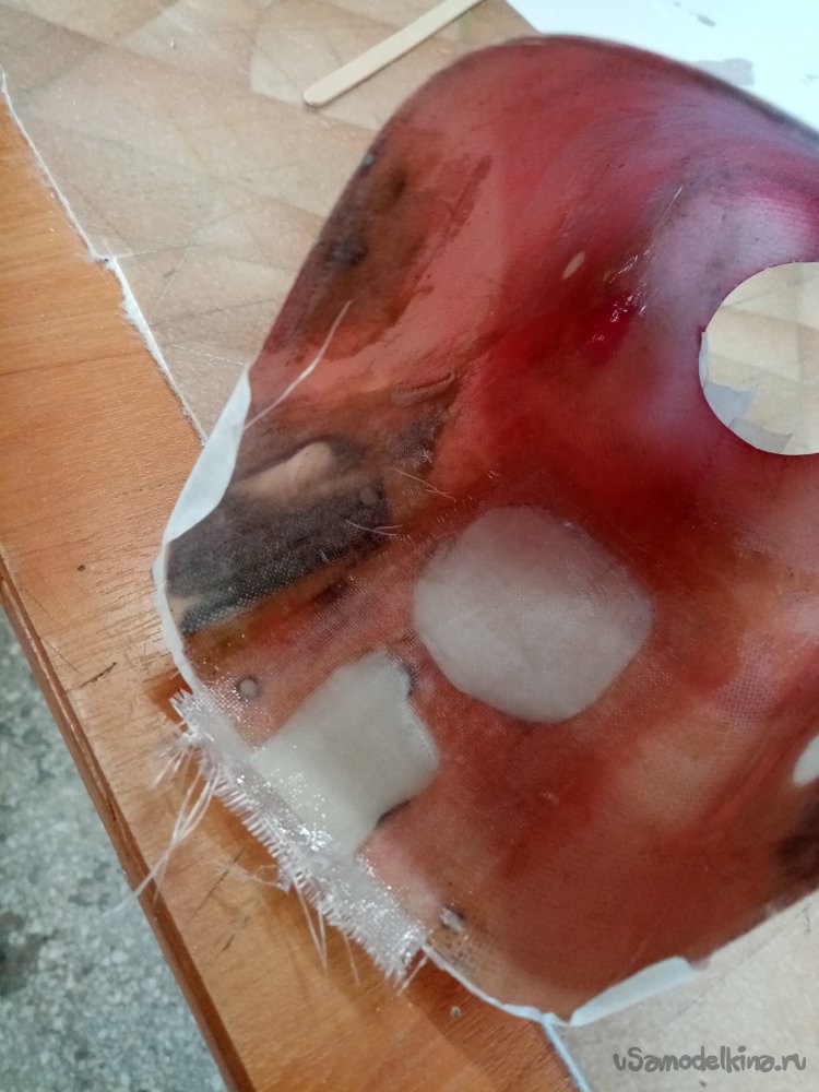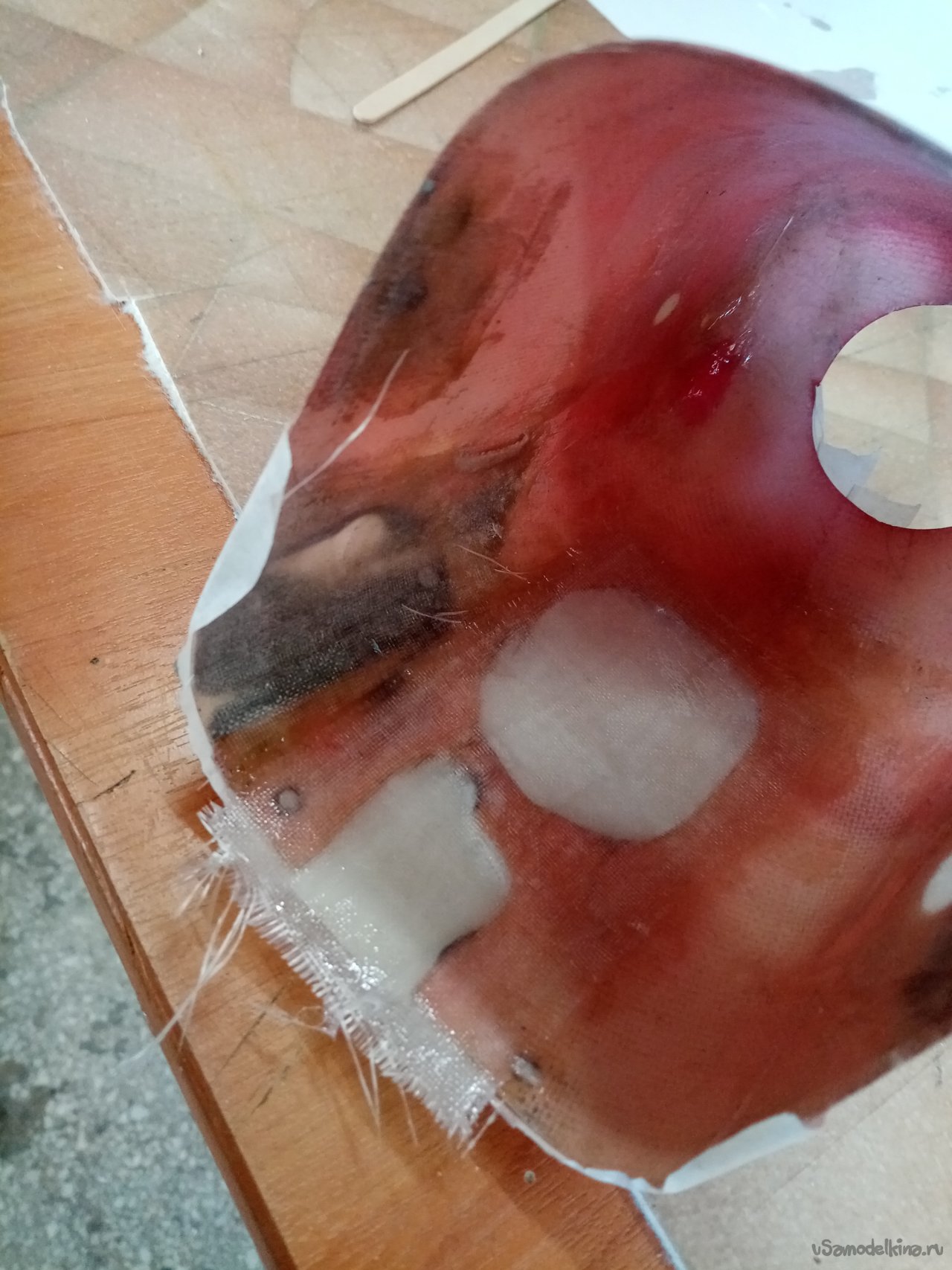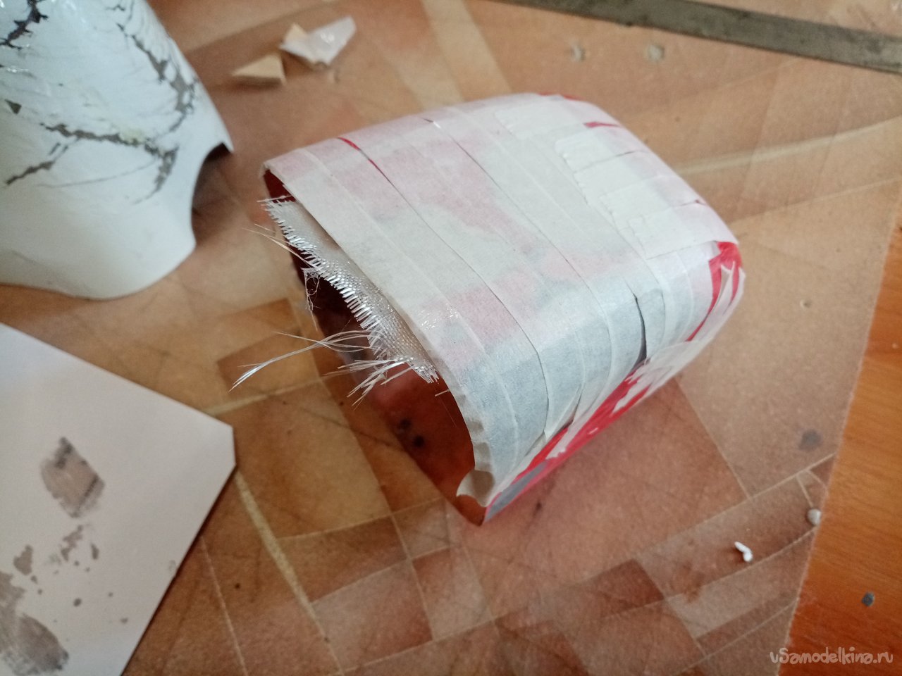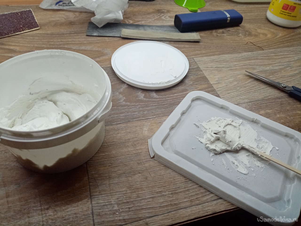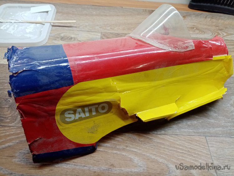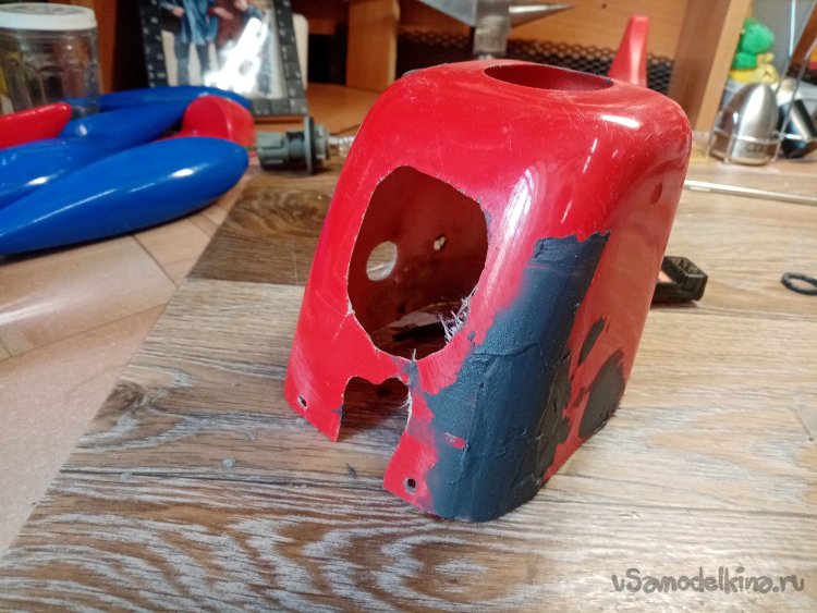 Капотик намного побит. Есть отверстия под установку нитродвигателя. Мне они без надобности. Ремонтирую трещины эпоксидной смолой. Отверстия заклеиваю стеклотканью. После отвержения смолы подрезаю ненужные лохматушки и бодро замазываю автомобильной двухкомпонентной шпаклевкой.