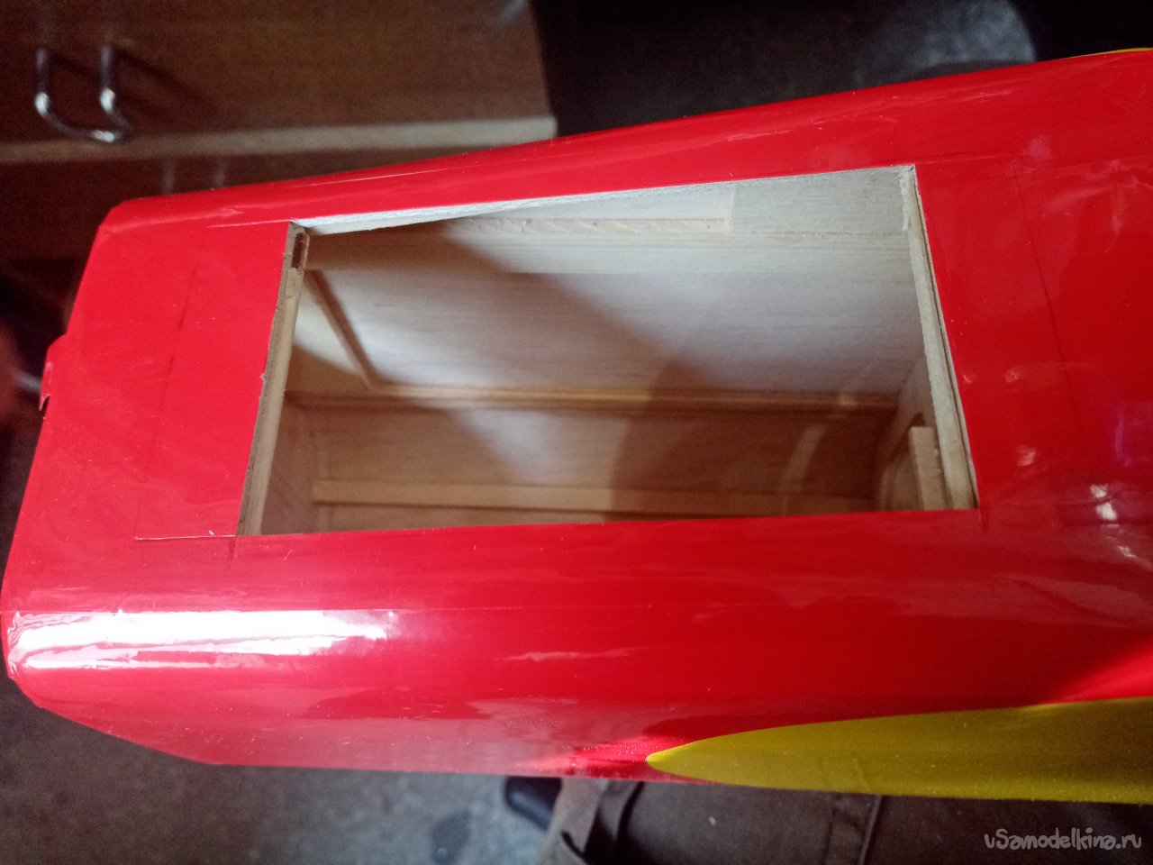 Для удобства работы вырезаю люк на нижней поверхности носовой части, по новой обтягиваю его и устанавливаю защелки.