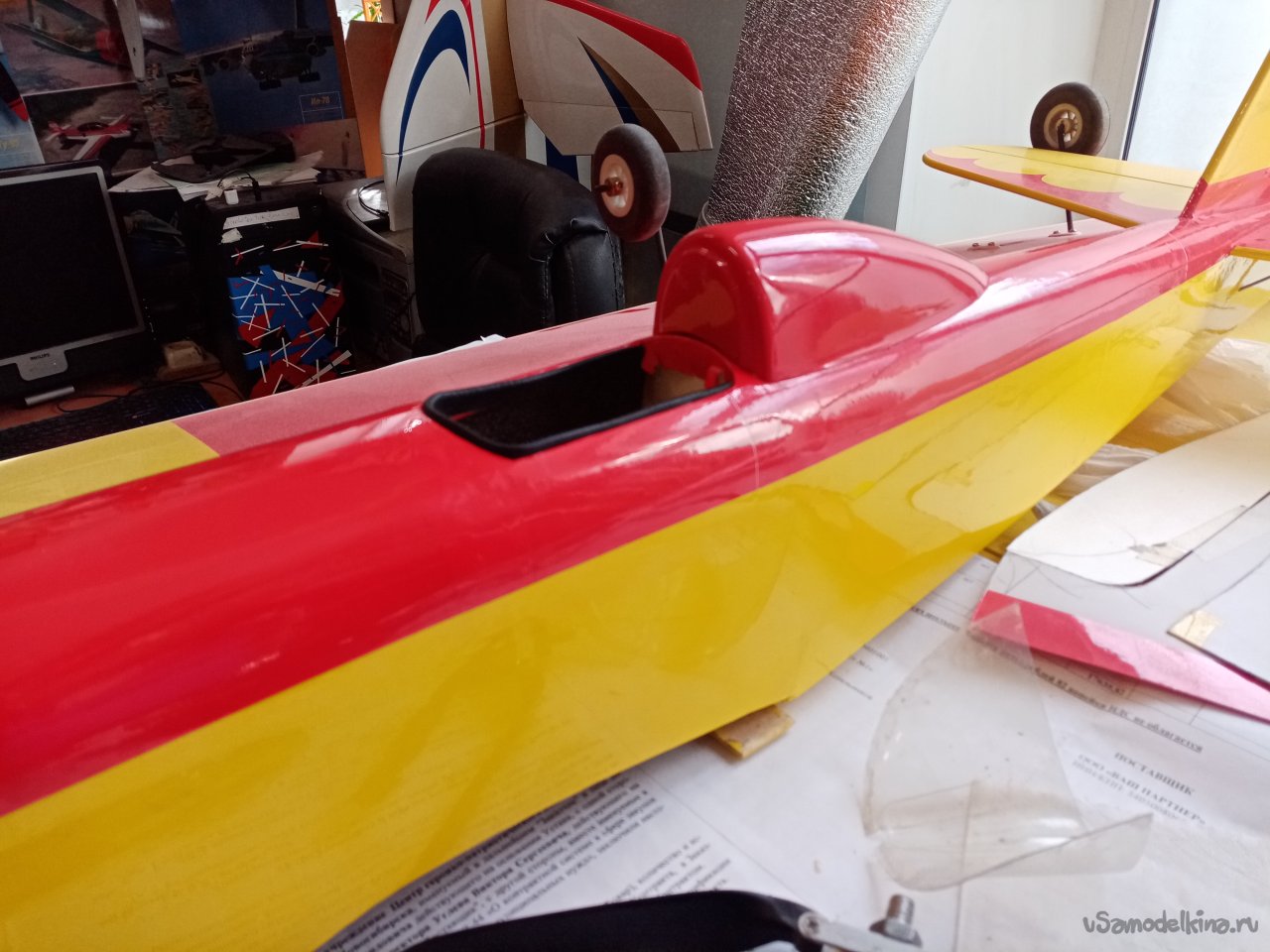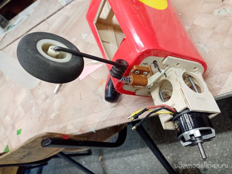 Установил капот. Прикрутил переднюю стойку. Провел управление на руль высоты т руль направления, соединенный с передней стойкой шасси.