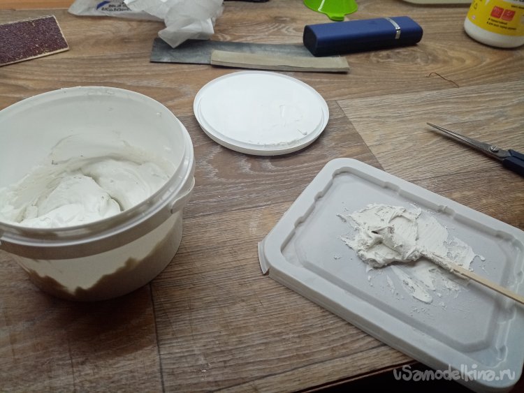 Шпаклевать получилось совсем немного. В бой вступает простая водостойкая шпаклевка для ванной комнаты.
