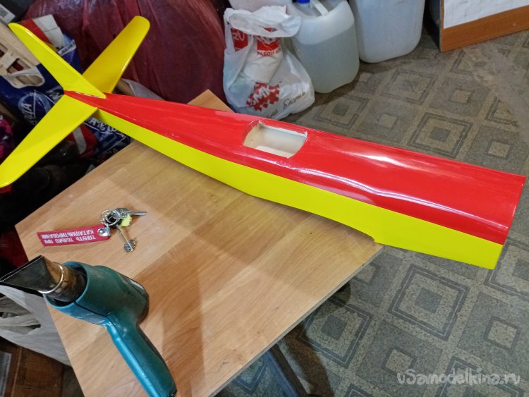 Начну с фюзеляжа он наиболее пострадал. Снимаю обшивку очень осторожно, главное не нанести еще больших повреждений. В работе использую весьма мощный фен для волос. Предварительно прогрев участок пленки осторожно снимаю её с бальзы. К стати качество дерева не очень. Лохматое, кривослой и пористое. Продвигаюсь как сапер по минному полю.