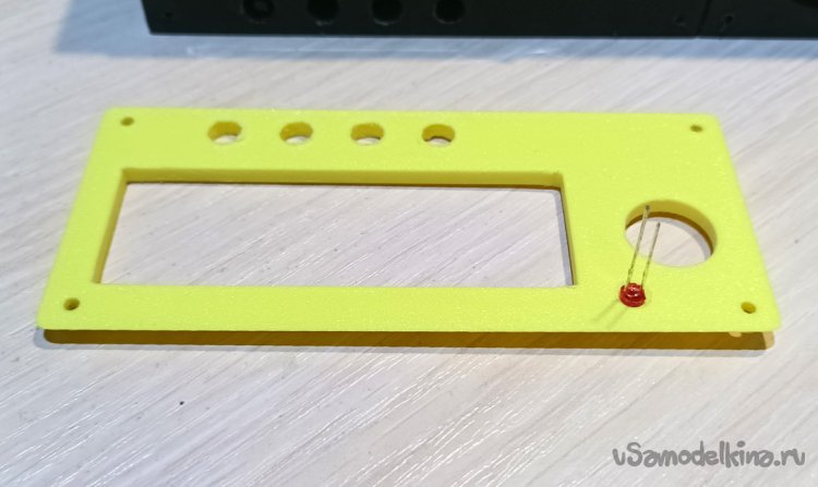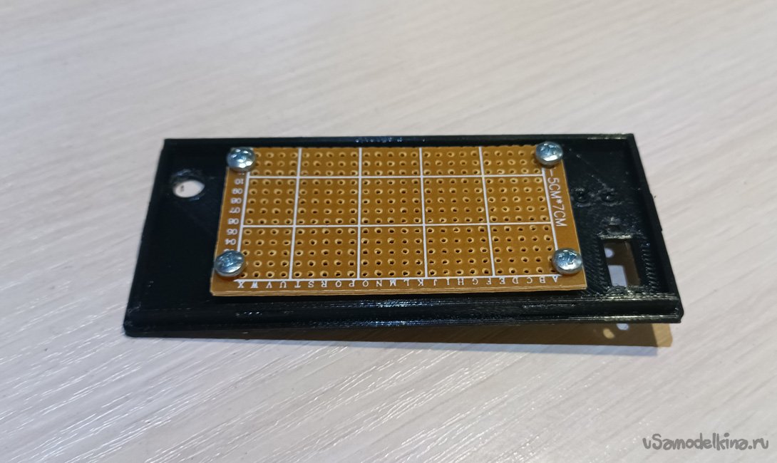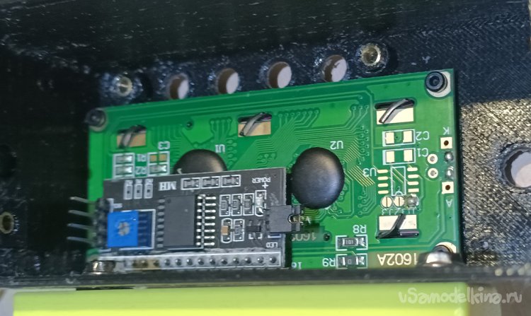 Дисплей крепится изнутри корпуса тремя винтиками М2х4, которые вкручиваются в «ножки». Четвертое отверстие дисплея прижимается к корпусу винтом с гайкой, который крепит переднюю панель.