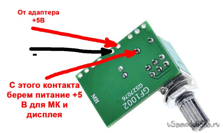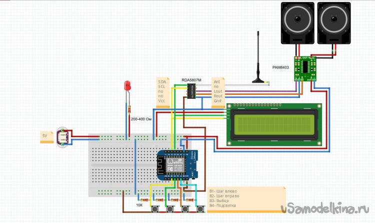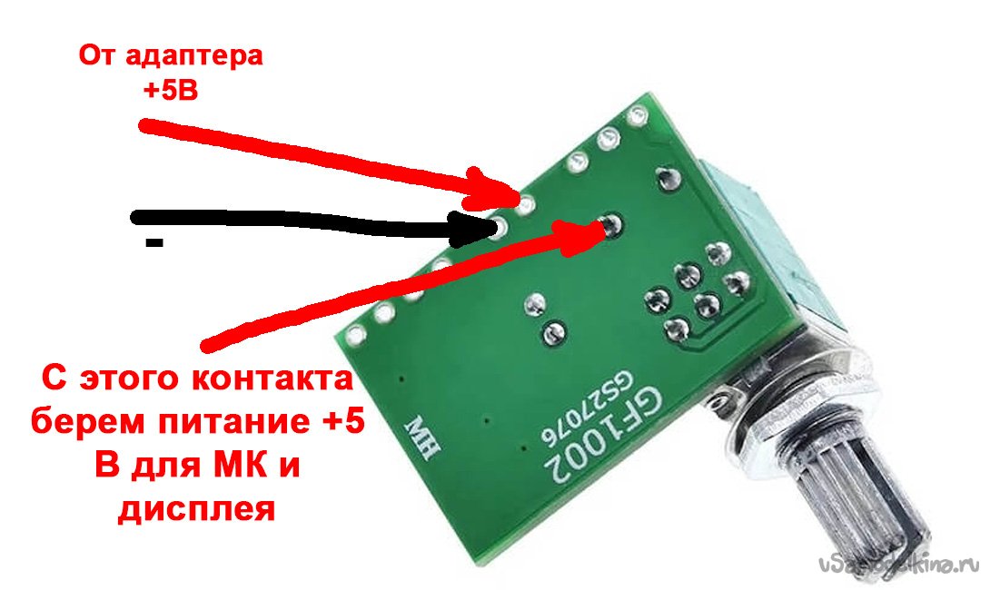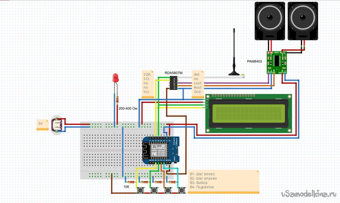 ВНИМАНИЕ: Обратите внимание, что радиомодуль питается от +3.3V, а дисплей и усилитель от +5V! Поэтому радиомодуль берет питание от пина +3.3V МК.