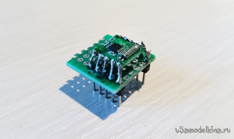 Так как радиомодуль имеет шаг отверстий, не совпадающий с шагом на макетной плате, то придется либо припаивать модуль на плату проводками, либо делать переходник.