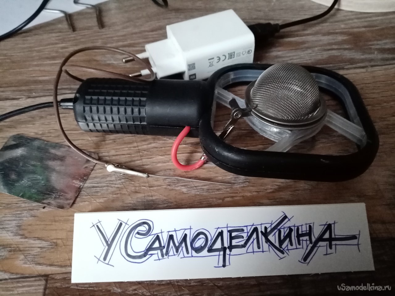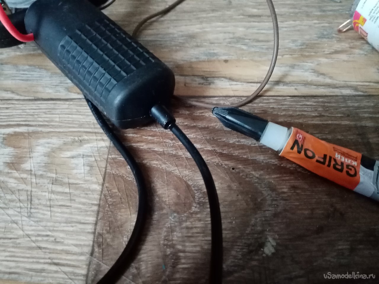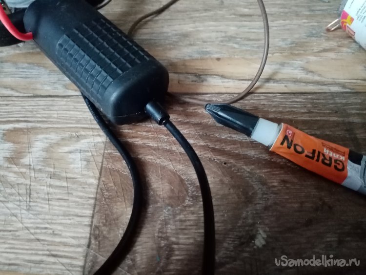 В боковиках ручки формирую отверстия для вывода проводов в разные стороны. Для гарантии. В задней части отпаиваю провод питания, припаиваю другой значительно длиннее от зарядки телефона. Подбираю мощный блок зарядки, собираю устройство. И закрываю ручку, закручиваю парочку винтиков с резьбой под пластик. Все готово к работе.