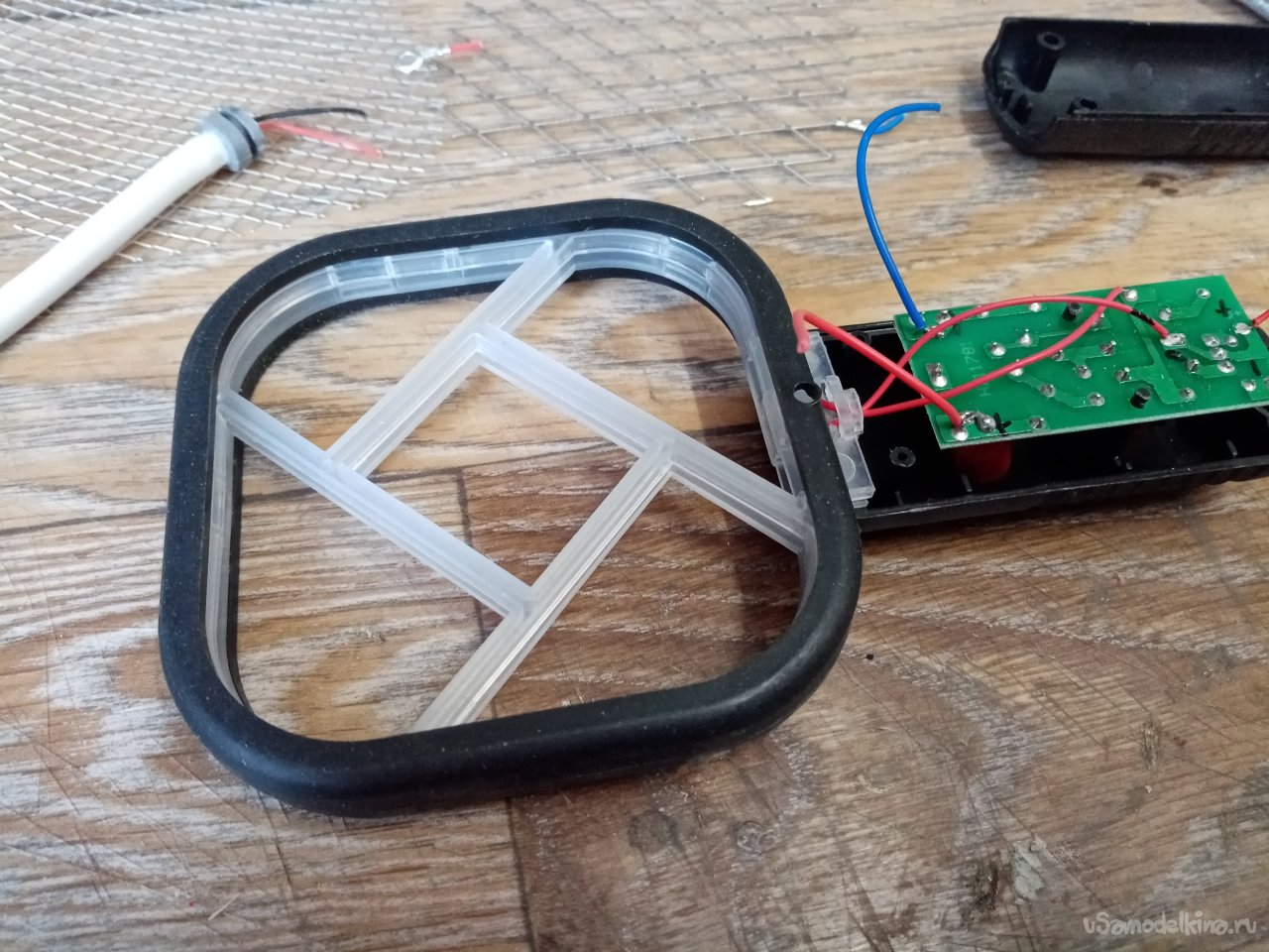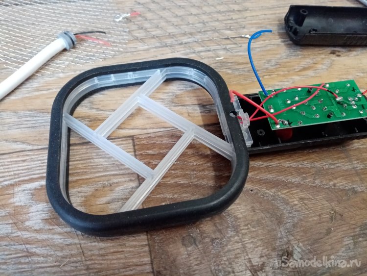 Разбираю прибор. Три сеточки, полюс одна и две на минус устройства. Светодиодик горит. Тоже не плохо, будет видно когда прибор работает. Толстый провод питания заменю на длинный. На картинке показано применение в качестве источника питания пауэрбанк. Переделаю на обыкновенную зарядку для телефона.
