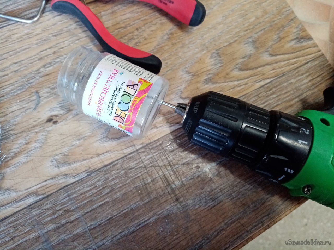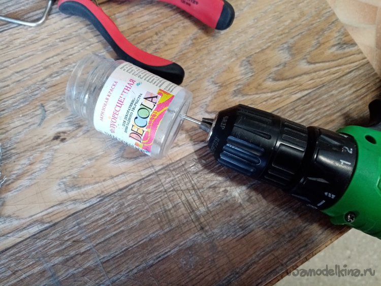 В качестве емкости для флока выбираю пустую баночку от акриловой краски. Нужно установить на дне сетку и завести на неё питание от знака плюс. Просверливаю отверстие в донышке при помощи шуруповерта. Затем аккуратно вырезаю его лобзиком и зачищаю края шкуркой.