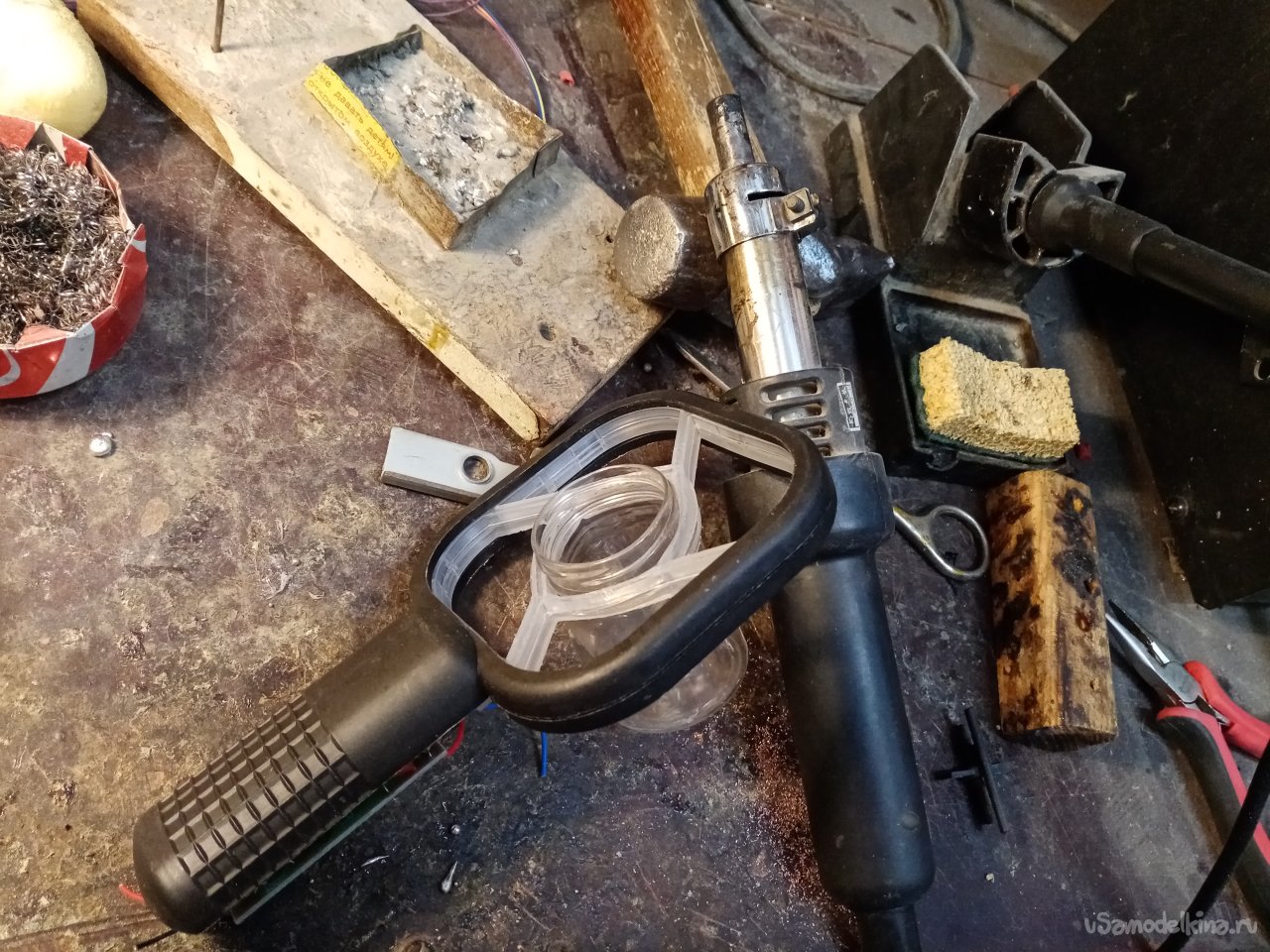 Это же пластик. Аккуратно нагреваю переплетение рамочки паяльным феном и расширяю отверстие до диаметра горлышка. Получилось очень не плохо. Баночка на резьбе встает на место и еще хватает немного, чтобы установить крышку.