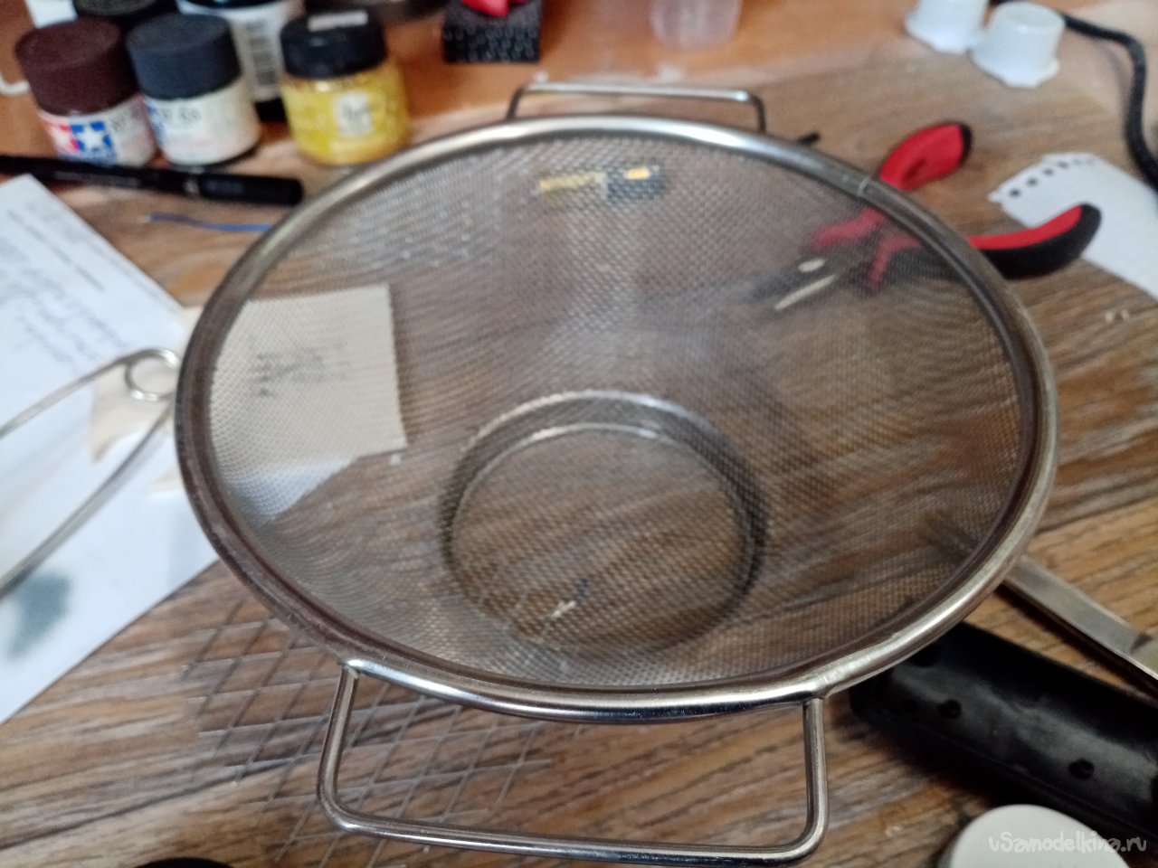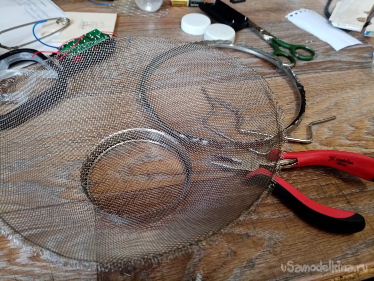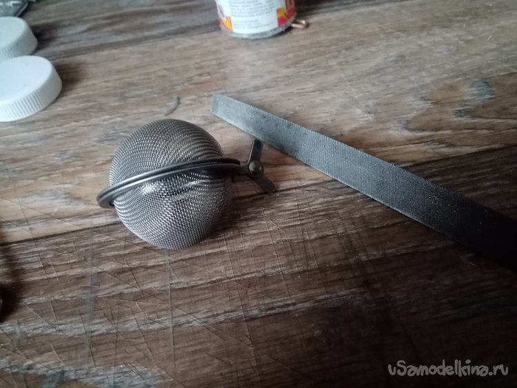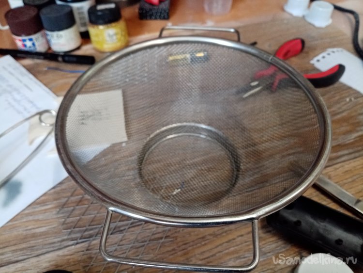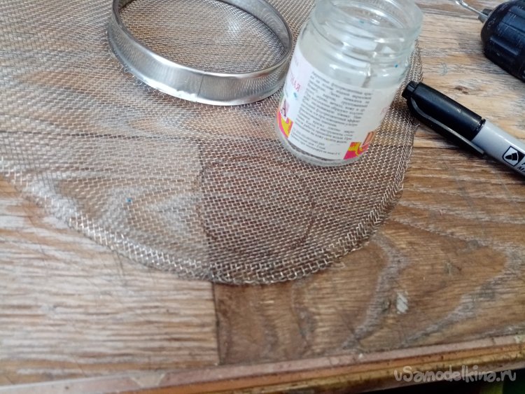 Сеточку вырежу из отслужившего свое кухонного сита. Плоскогубцами осторожно разгибаю внешний ободок устройства и освобождаю ручки и край сетки. Расправляю сетку.