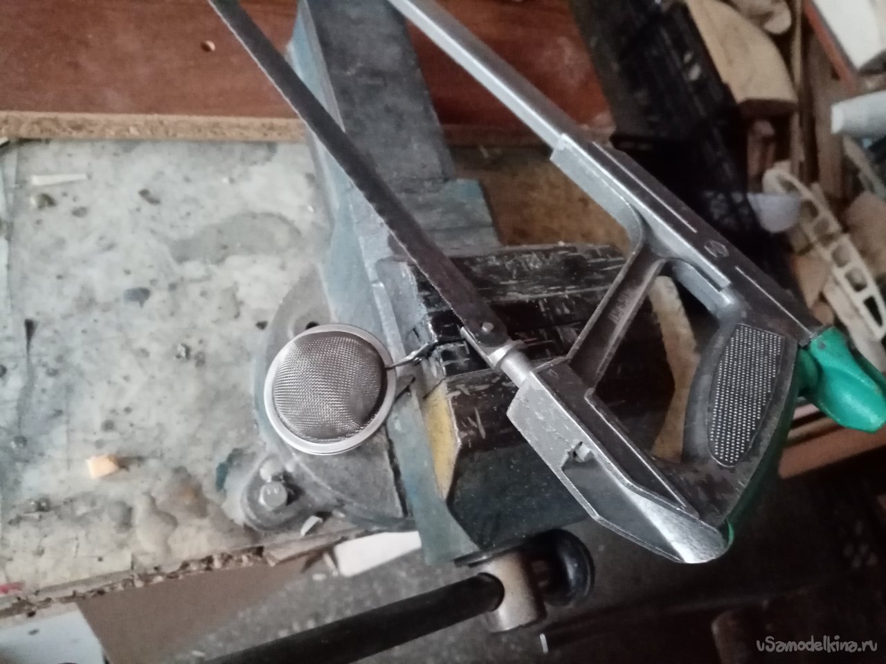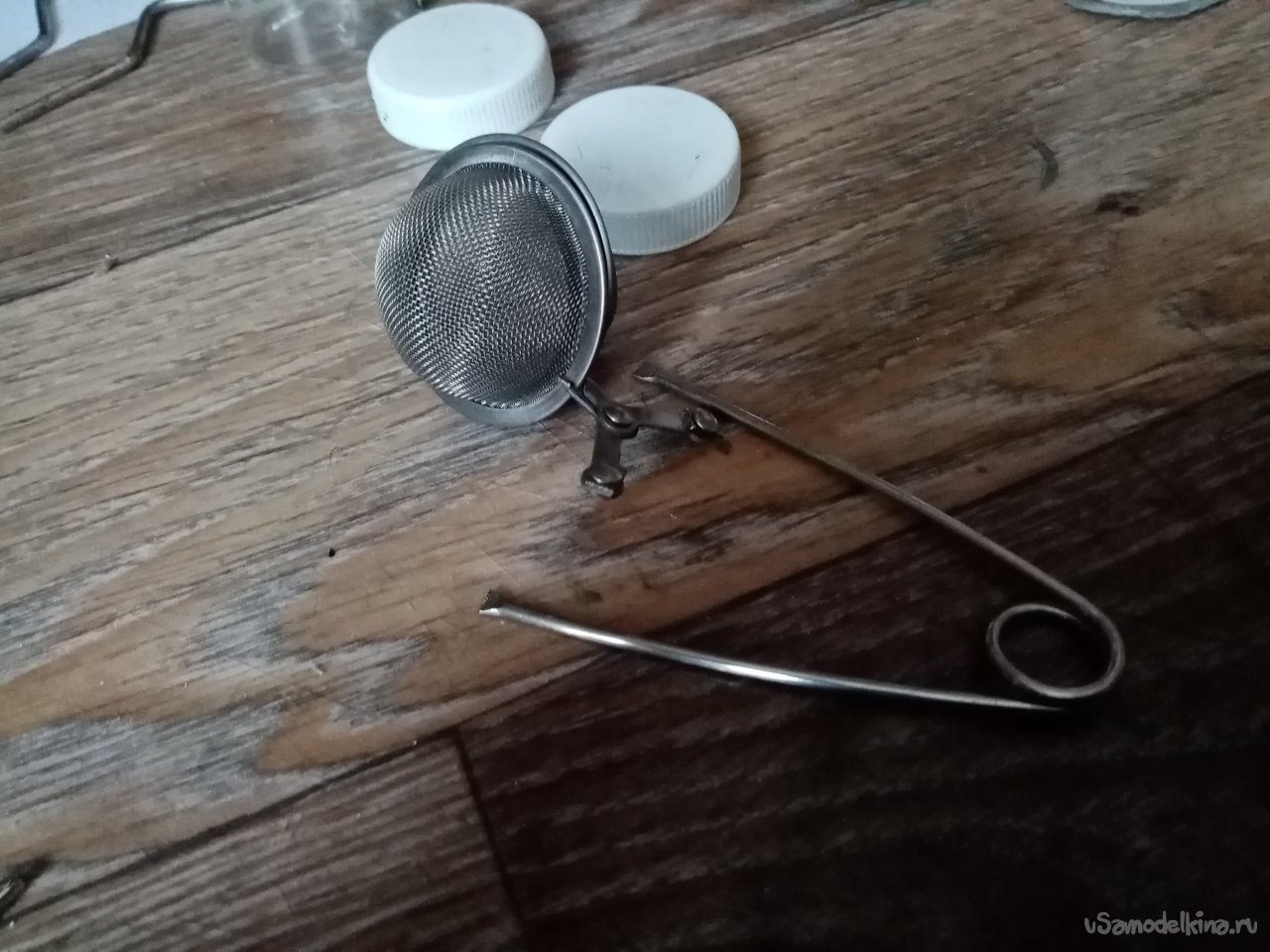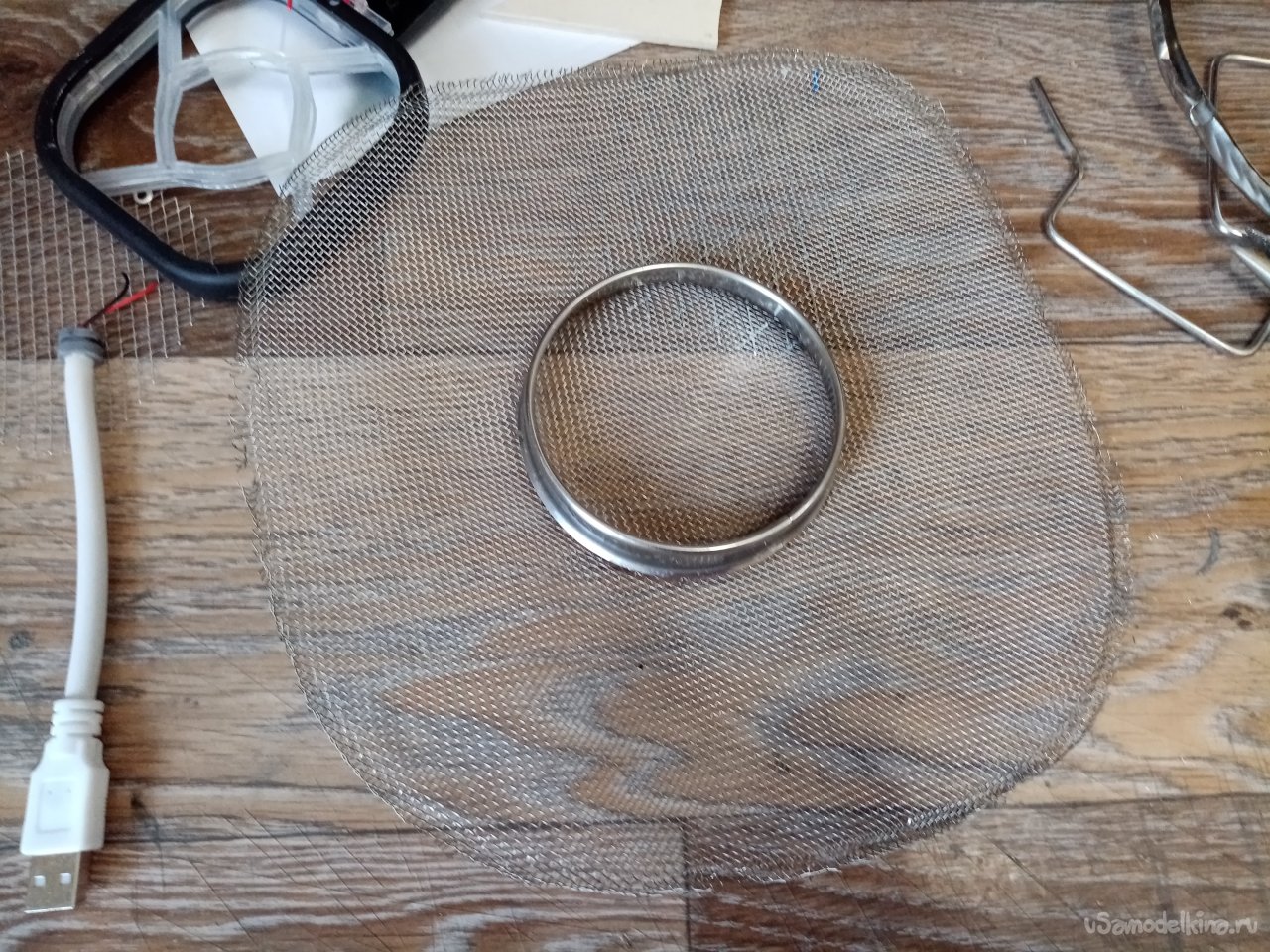 Сеточку вырежу из отслужившего свое кухонного сита. Плоскогубцами осторожно разгибаю внешний ободок устройства и освобождаю ручки и край сетки. Расправляю сетку.
