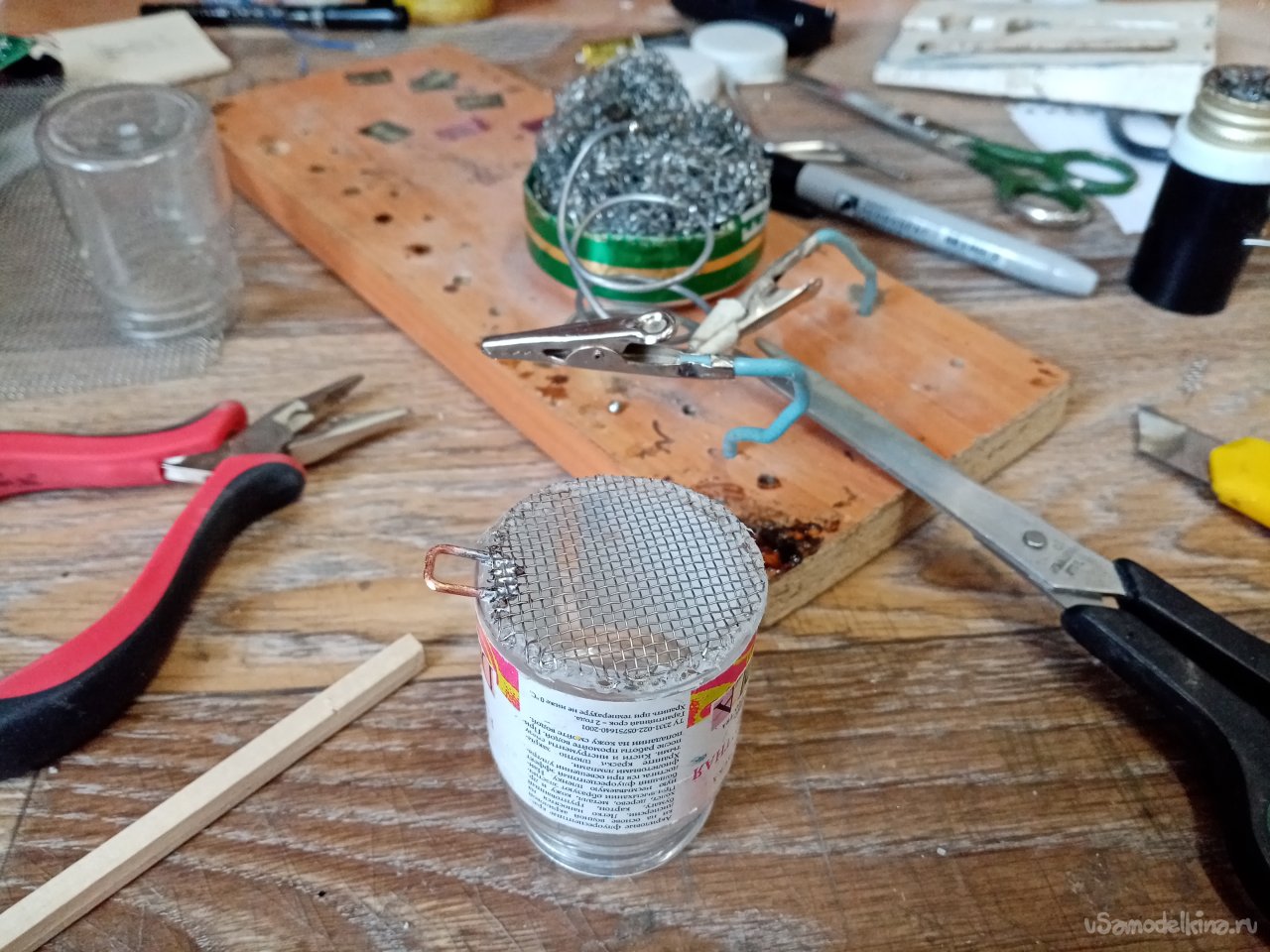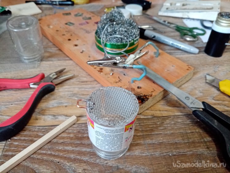 Фломастером размечаю кружок равный диаметру дна. Вырезаю ножницами по металлу. На один край припаиваю скобу из медной проволоки. Затем устанавливаю, паяло на температуру в 400 градусов. Впаиваю сеточку в края банки. Обрезаю лишнее. Емкость готова.