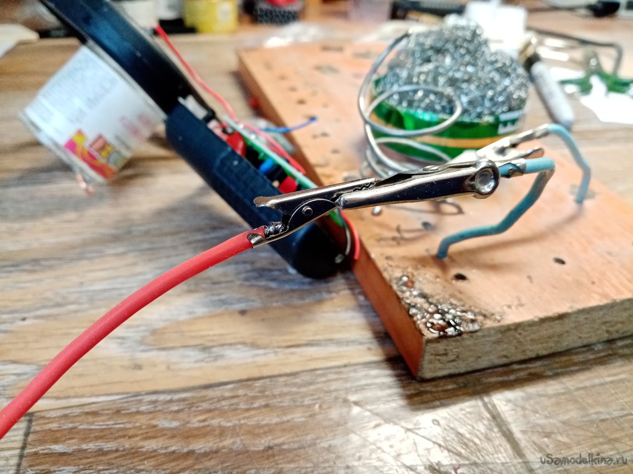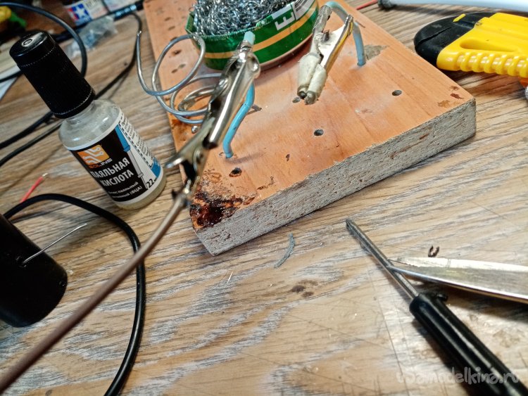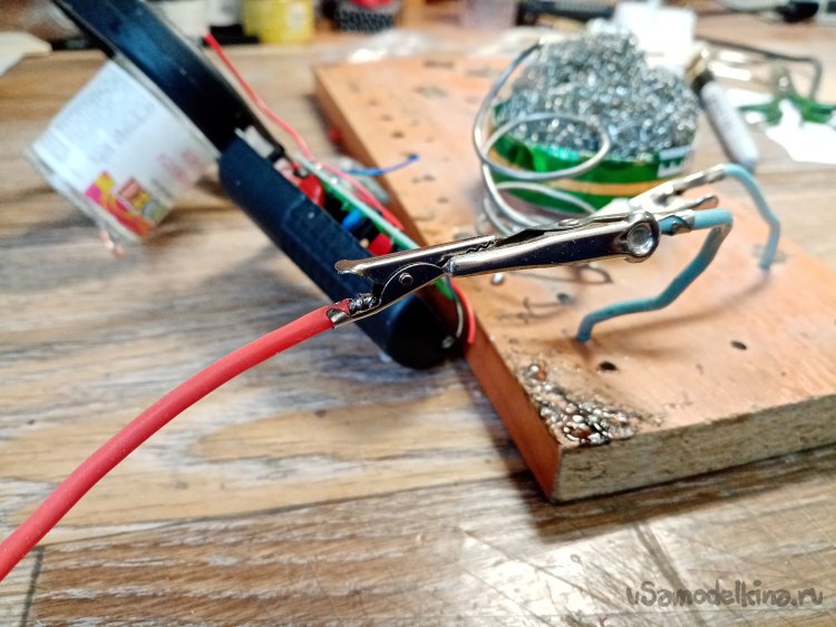 Минусовой провод припаиваю значительно длиннее, нужно будет соединять с основанием травяного покрова. На этот провод тоже припаиваю маленький крокодил.