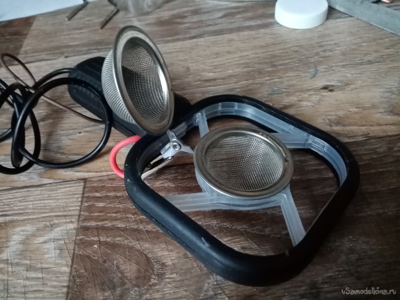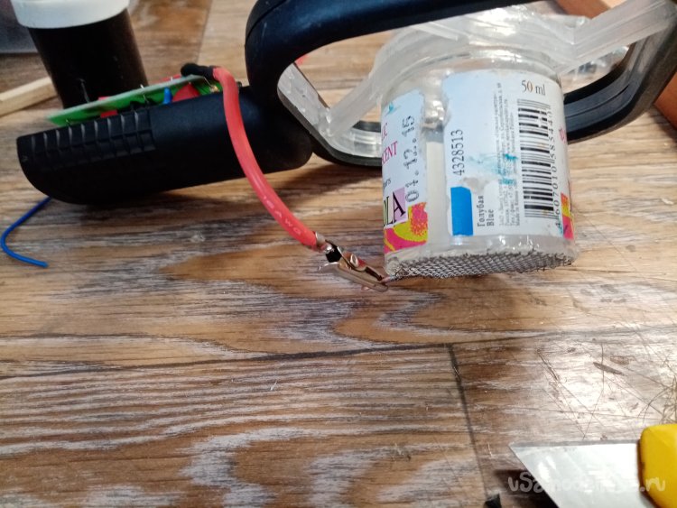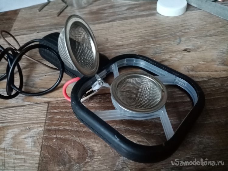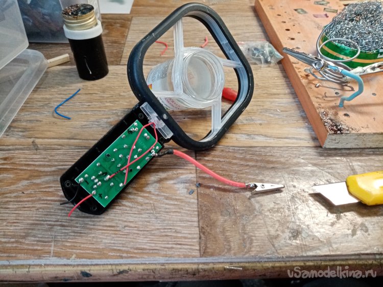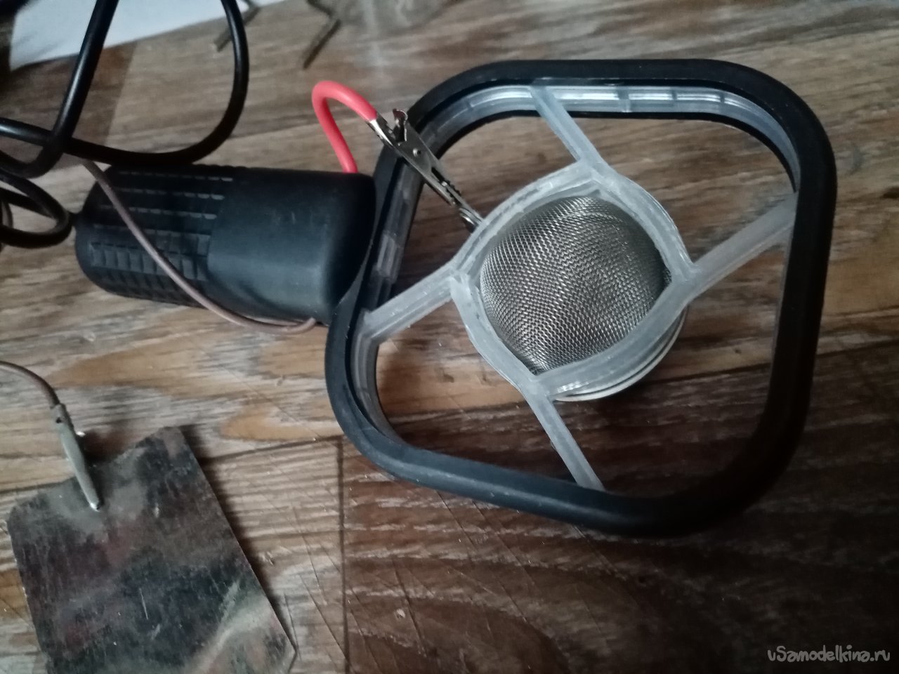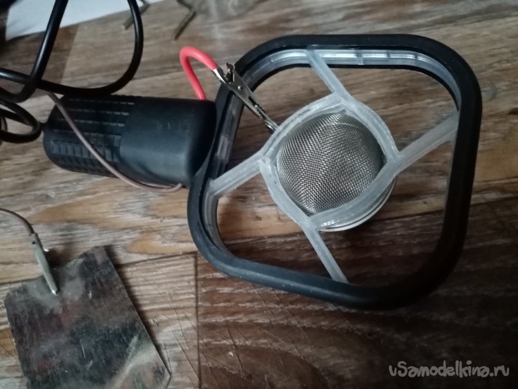 На плюсовой контакт платы припаиваю достаточно толстый медный провод в мягкой изоляции. На другой конец крокодильчик. Планирую сменные емкости на прибор с сеточками разного сечения отверстий.