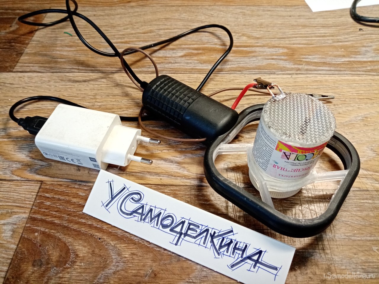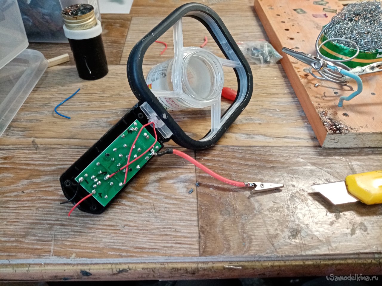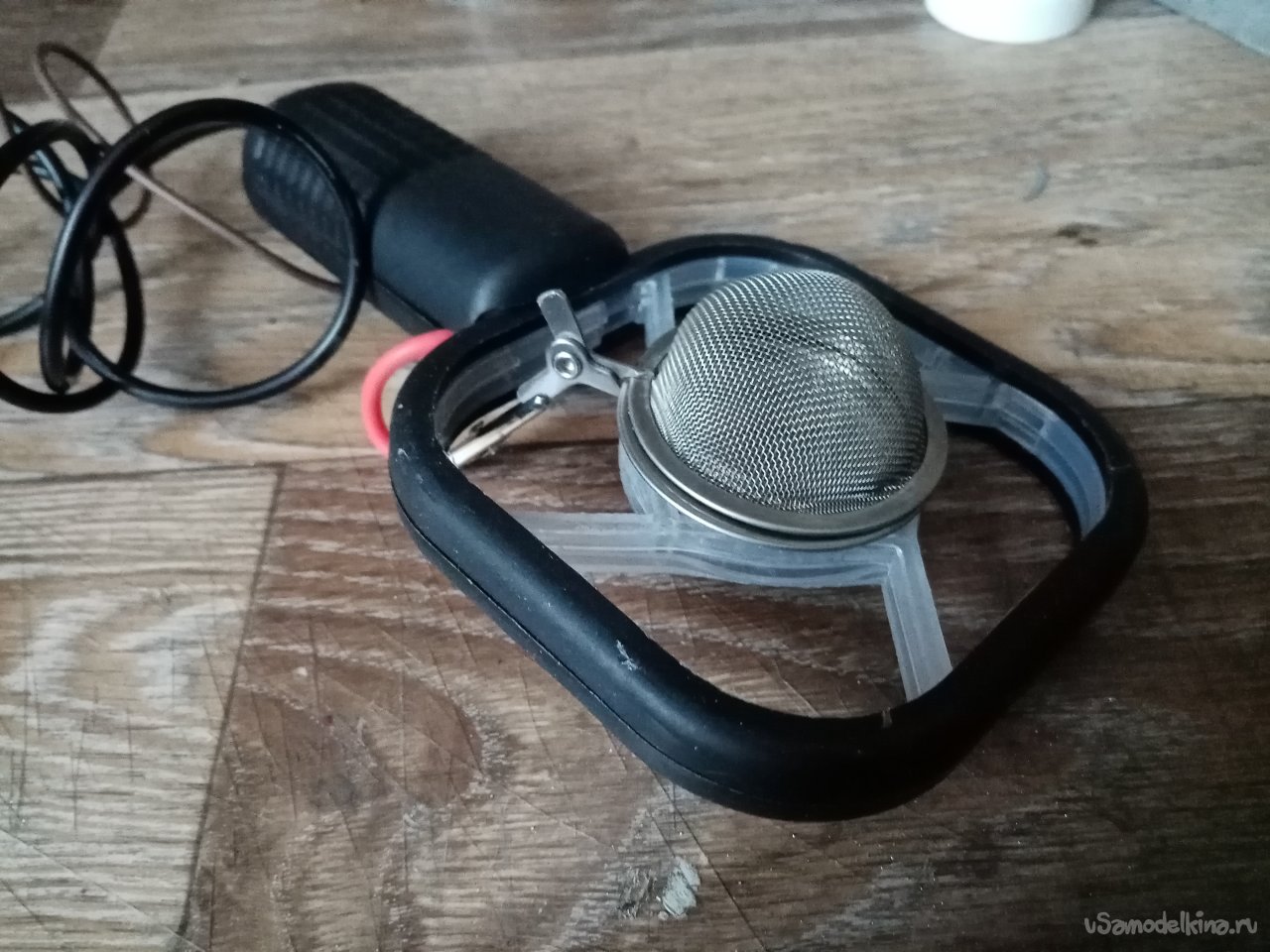 На плюсовой контакт платы припаиваю достаточно толстый медный провод в мягкой изоляции. На другой конец крокодильчик. Планирую сменные емкости на прибор с сеточками разного сечения отверстий.