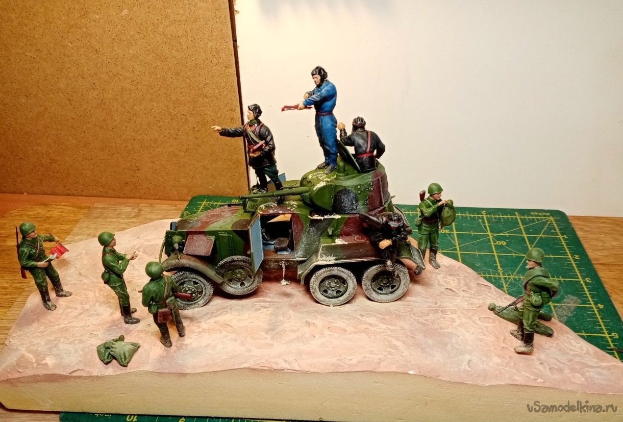 Некоторое время назад изготовил парочку диорам. Что то толкнуло меня в неизведанную область самоделок. В первом варианте с броневиком так и не смог решить проблему с травой. Поэтому получилось грязновато и пустовато под ногами бойцов и техники.