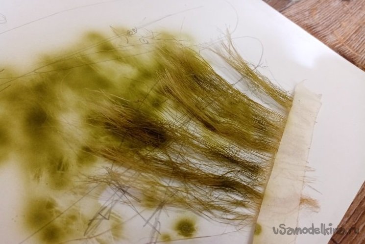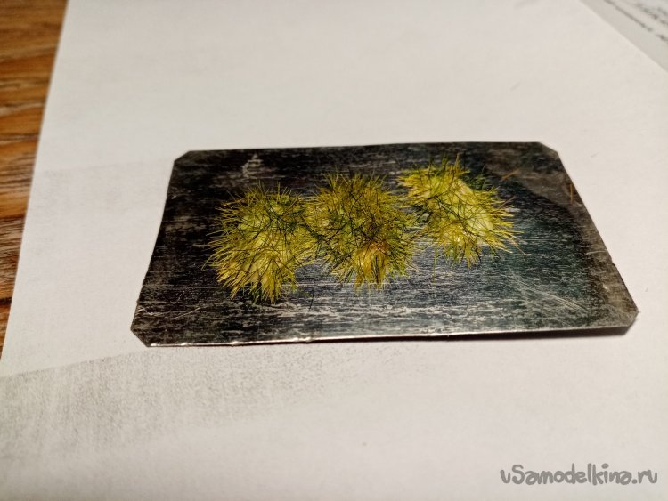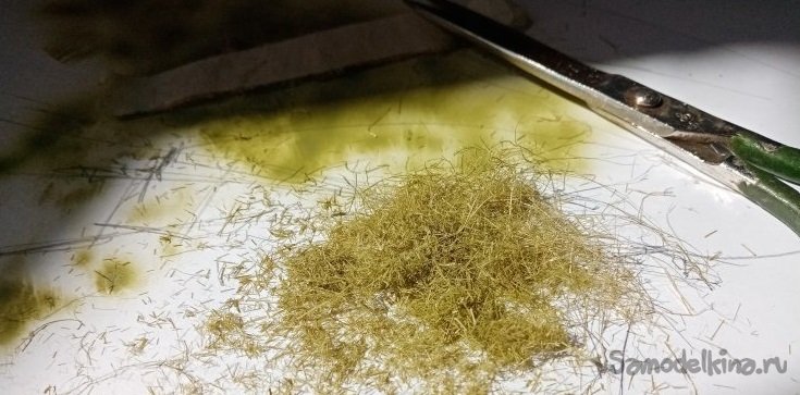 Аккуратно разобрал на пучки, приклеил на полоску малярного скотча. Окрасил под зелень травы аэрографом. Затем разобрал на отдельные пучки и осторожно приклеил на капельки клея ПВА.