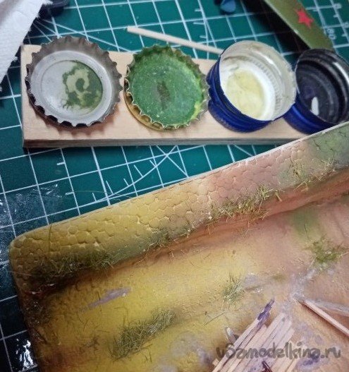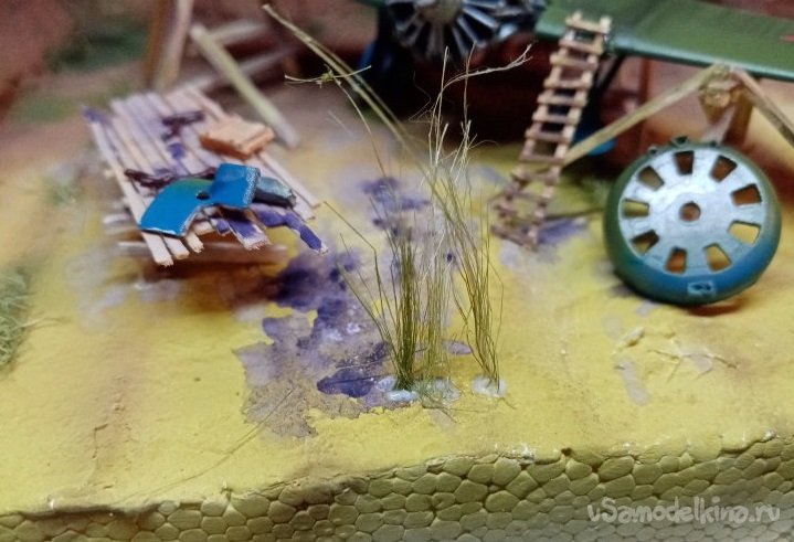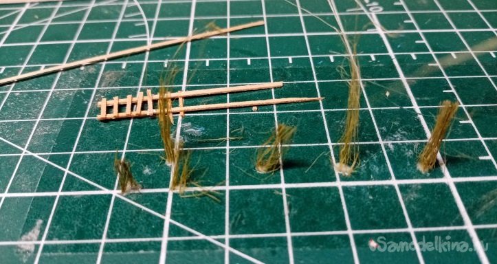 Попробовал, окрасить пучки при помощи аэрографа и краски от «Тамии». Все разлетается. Но немного удалось окрасить в разной тональности. Порезал на меленькие травинки и попытался приклеить на нужное место.