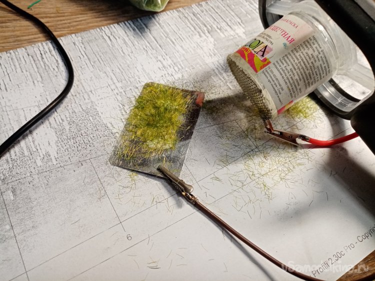 Наношу несколько капелек клея ПВА. Закрепляю минус крокодилом. В баночку насыпаю немного флока и начинаю высыпать его над капельками. Стараюсь поднести поближе. Чудо конечно происходит. Травинки встают вертикально в капелле клея. После помещаю пластинку на батарею, для высыхания клея с травой.